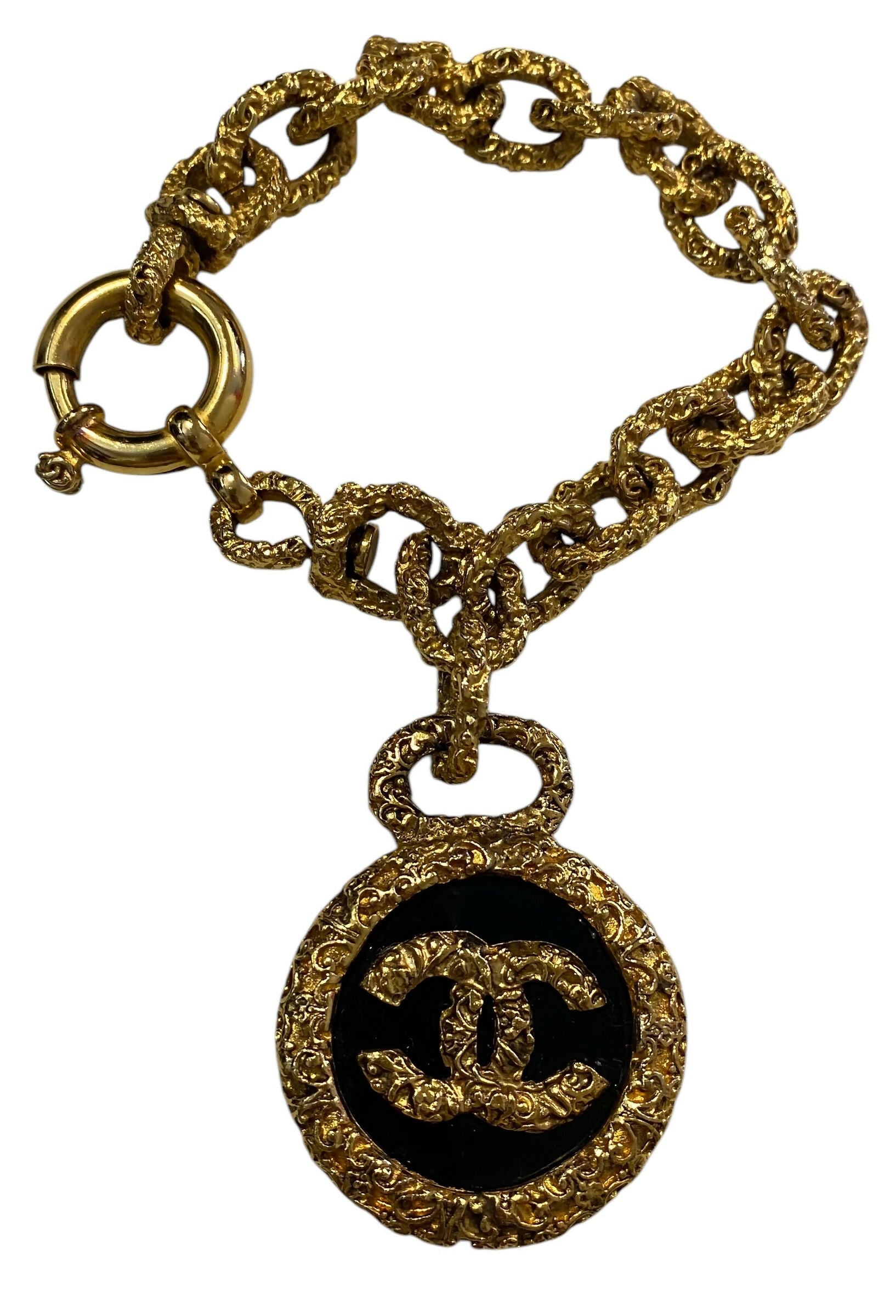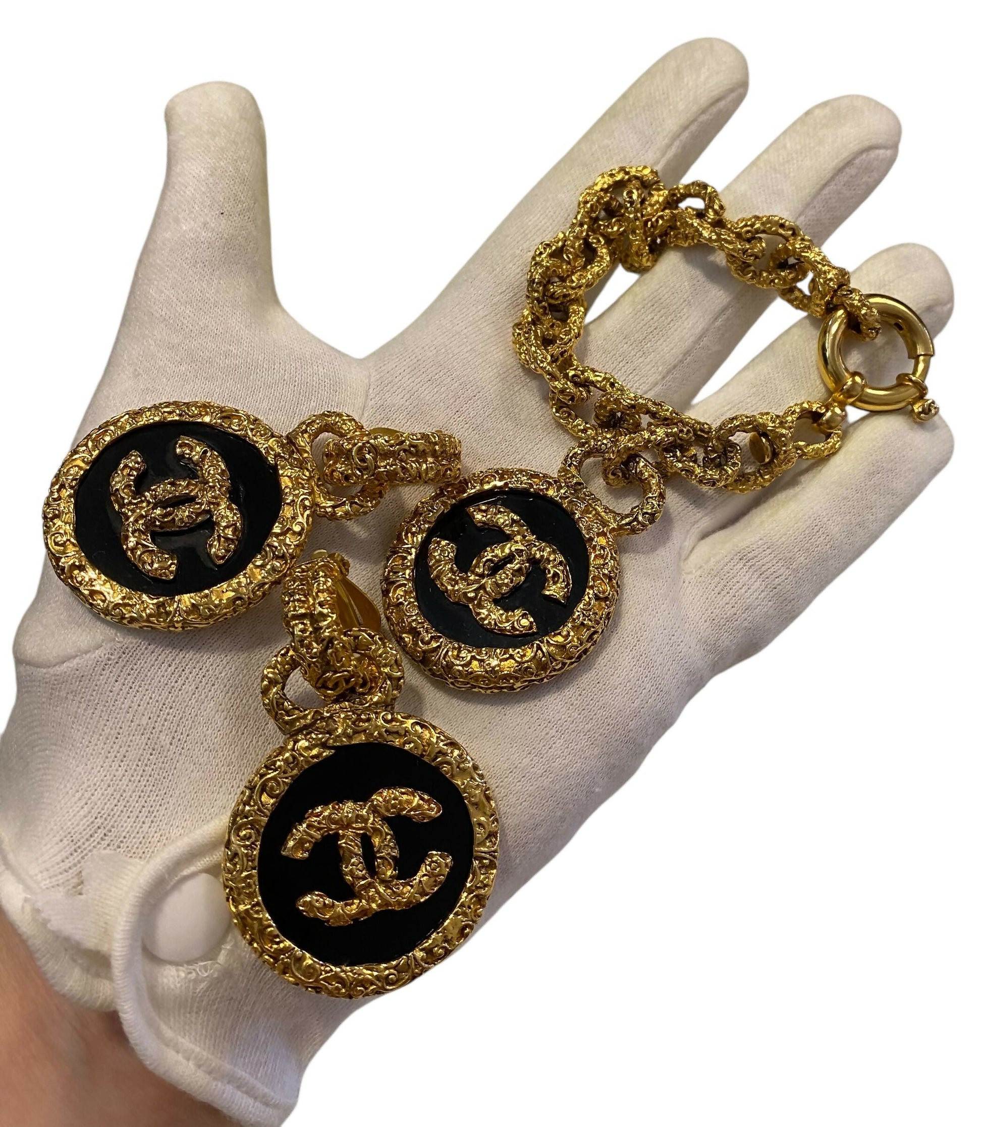 Chanel 93A Large Gold Metal Black Onyx Medallion CC Florentine Bracelet & Earrings SET