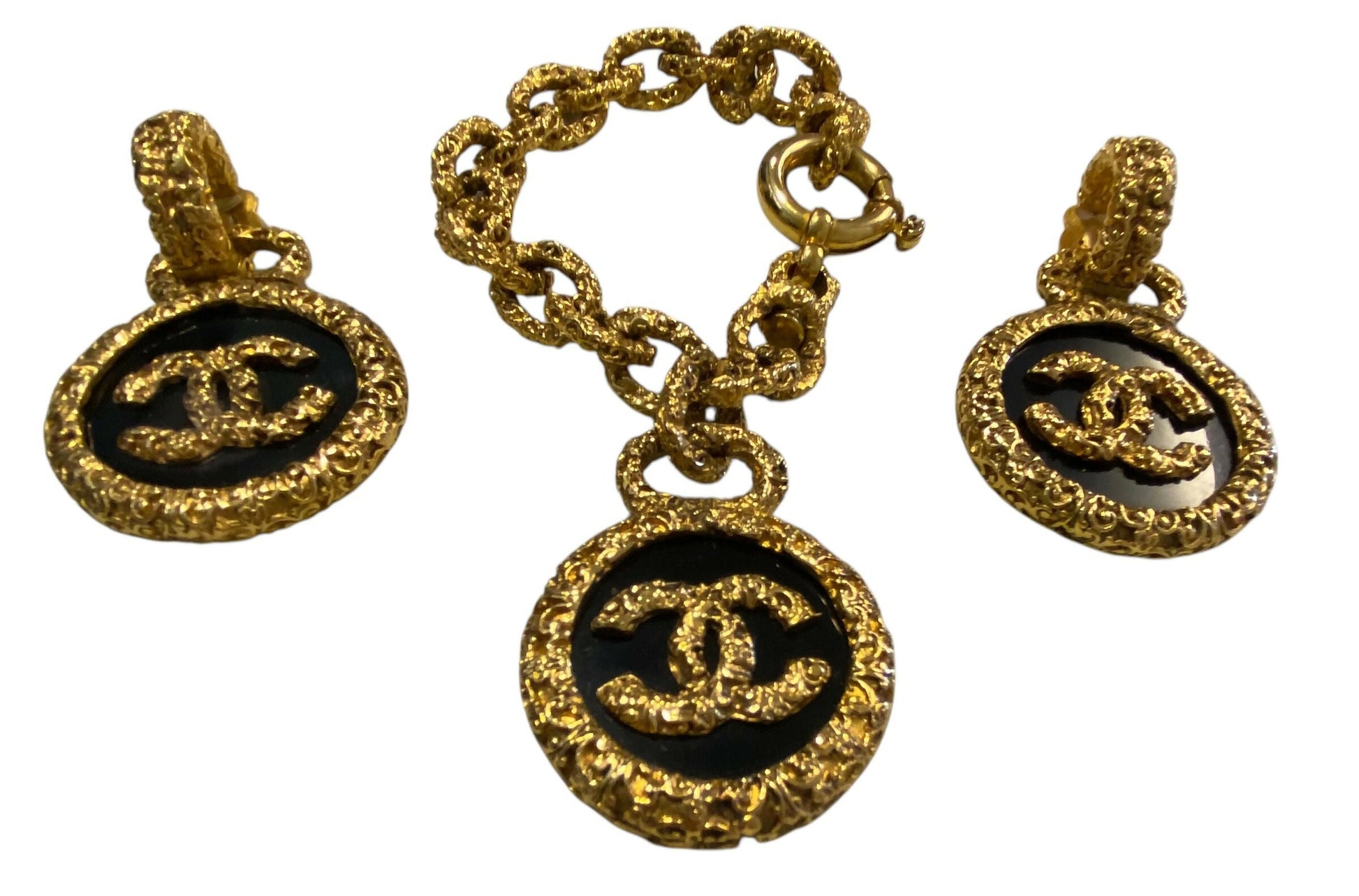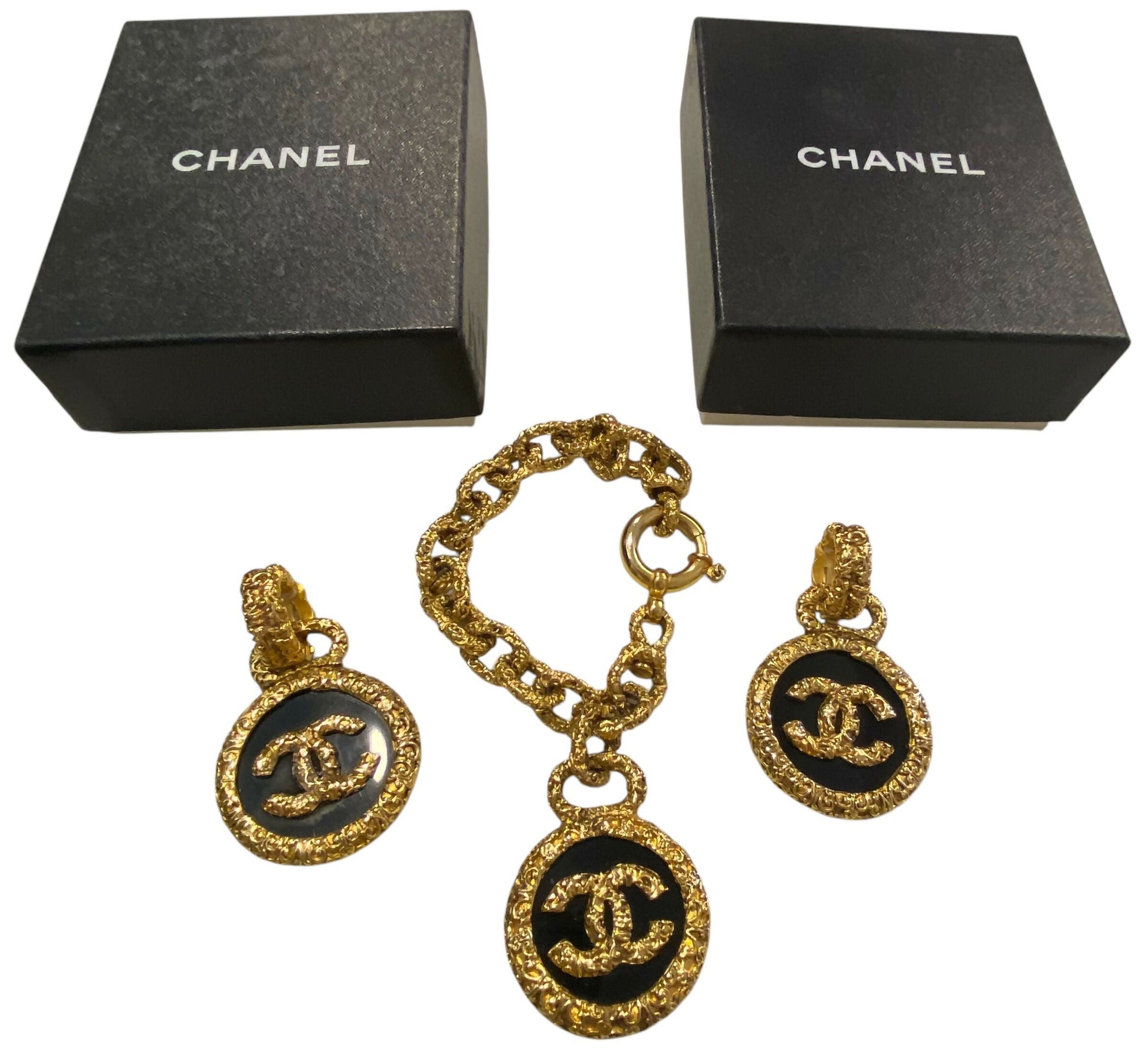This is the sale of a Chanel Medallion Bracelet and Chanel Button Drop clip-on earrings SET.