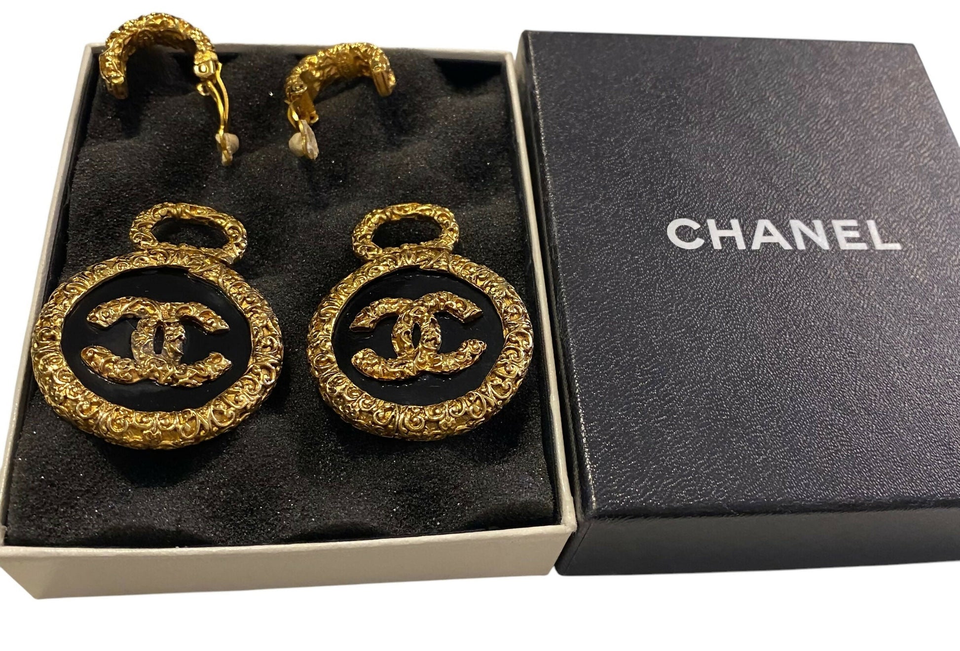 Featuring the iconic interlocking CC logos on both sides in a textured finish, they are both set against a striking black Onyx stone, exuding timeless elegance and sophistication. Crafted with meticulous attention to detail, this Set reflect Chanel’s signature blend of bold design and refined artistry. Highly sought after by collectors, this Set encapsulate the essence of 1990s Chanel, making them a treasured piece for fashion connoisseurs and a testament to the brand’s enduring legacy.
