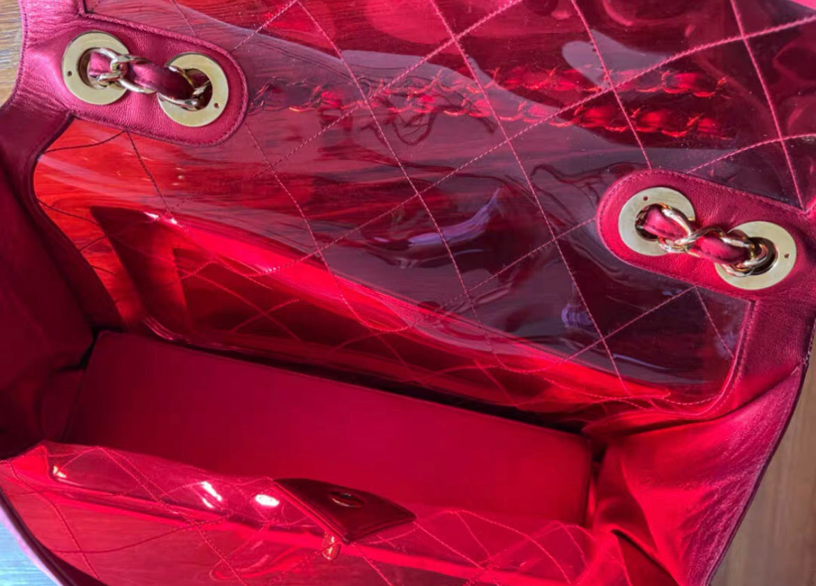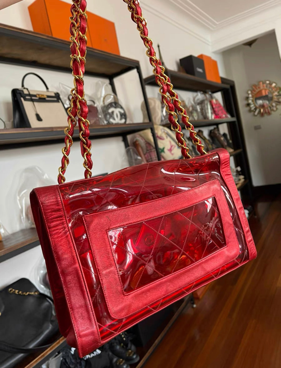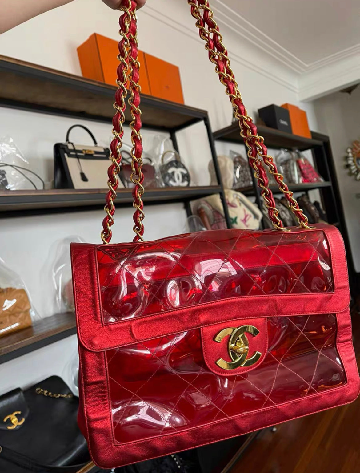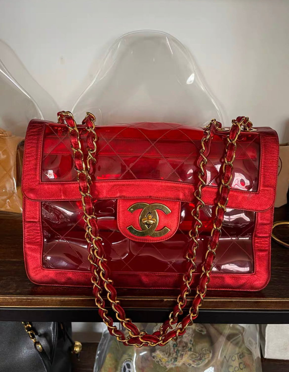 Travel back in time with this iconic piece from Chanel's 1995 Barbie Collection. The maxi flap bag features a stunning metallic red lambskin leather and PVC design with 24k gold plated hardware. With limited quantities and a vintage classic status, this bag is a must-have for collectors and fashion enthusiasts. Don't miss your chance to own a piece of fashion history.