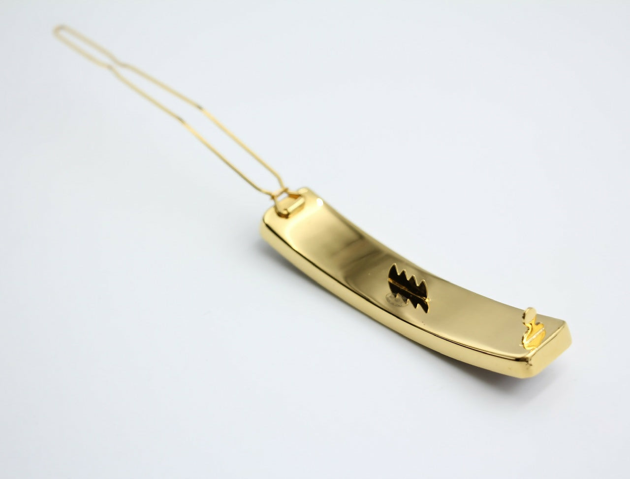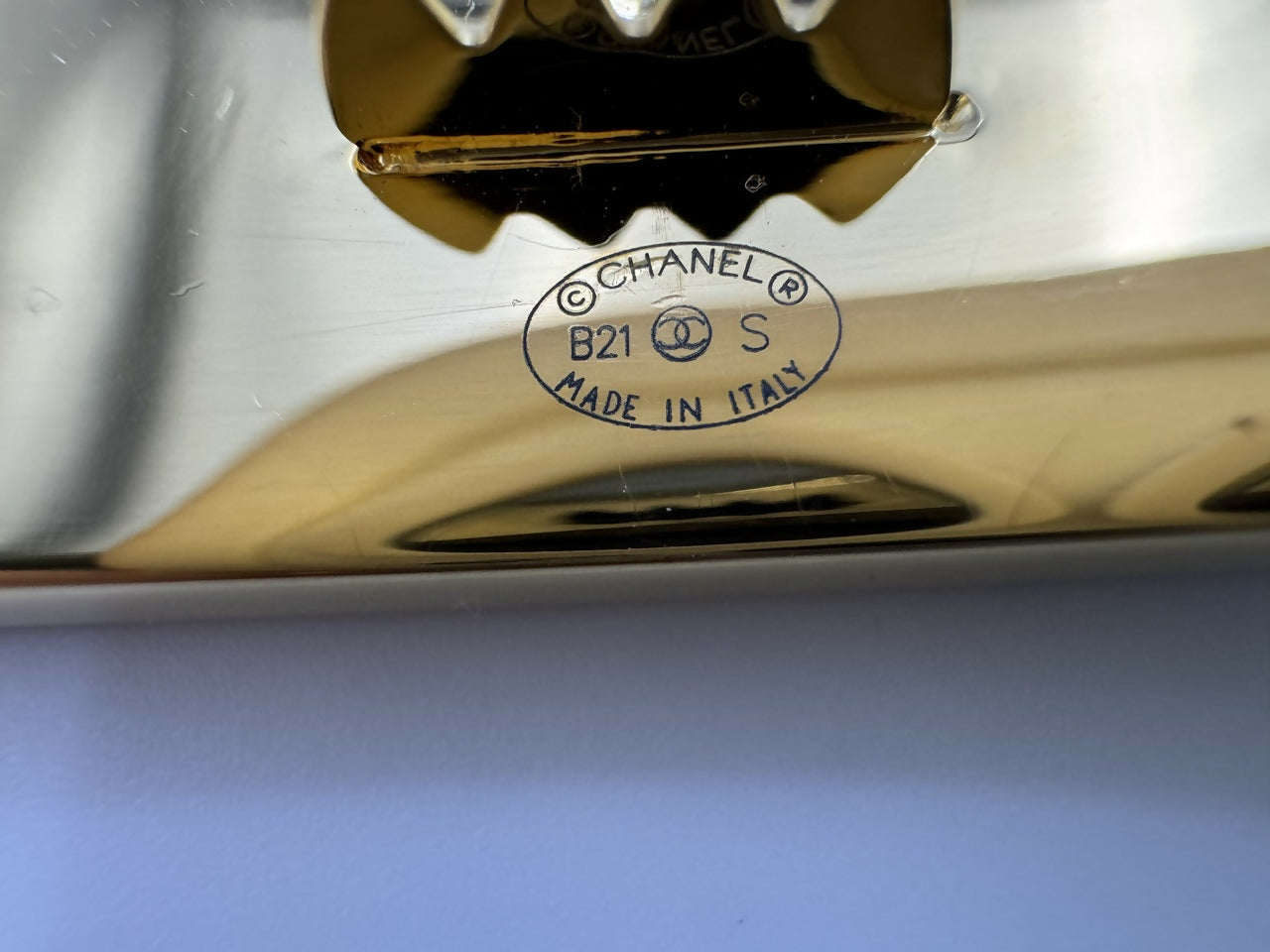 "Introducing the Chanel B21S Metal Burgundy Gold Edge English Long Hair Clip. Made with high-quality materials and a sleek design, this hair clip is perfect for securing any hair type. Its versatile burgundy and gold color adds a touch of elegance to any look. Experience the luxury of Chanel with this must-have accessory."