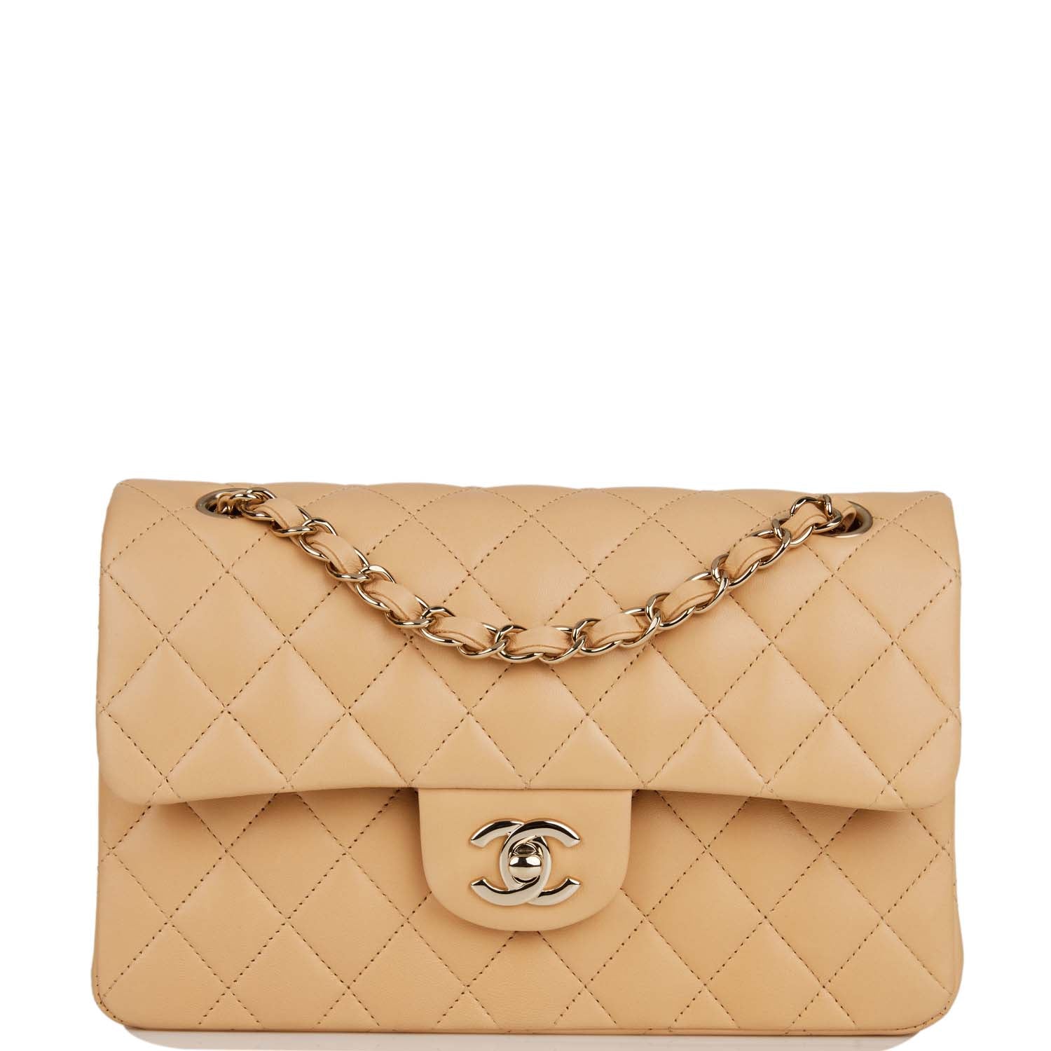 This Small Classic Double Flap bag is in beige lambskin leather with light gold tone hardware and features a front flap with signature CC turnlock closure, half moon back pocket, and adjustable interwoven light gold tone chain link and beige leather shoulder strap.