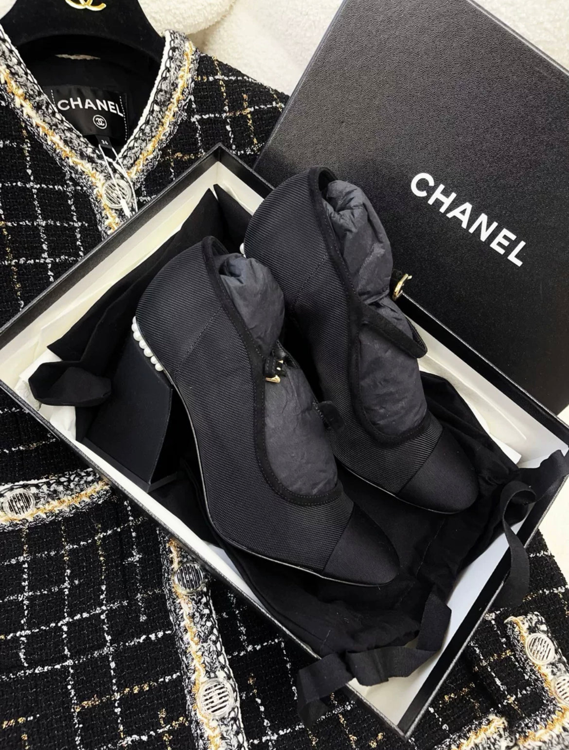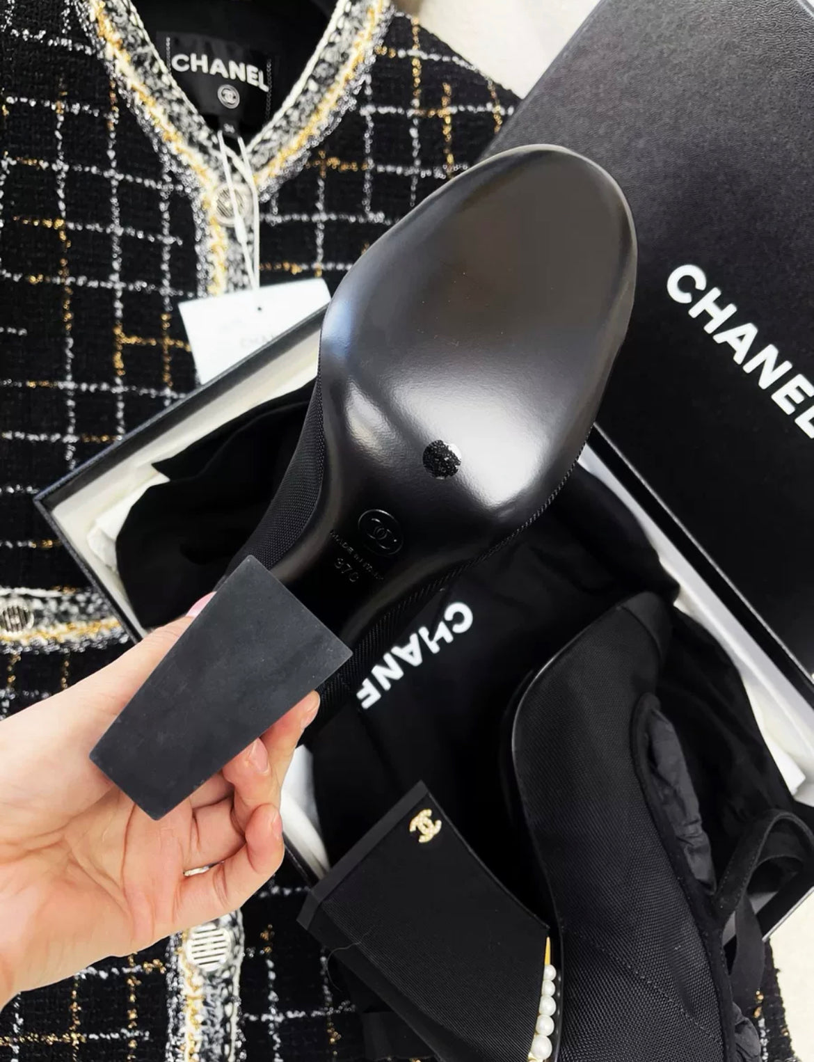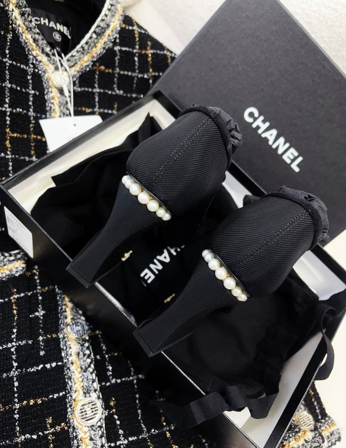 Elevate any outfit with these brand new Chanel heels. The gold double C logo and pearl accents exude luxury, while the thick heel provides comfort and stability. Perfect for any occasion, they come in a size 37 and include the original box for safekeeping.