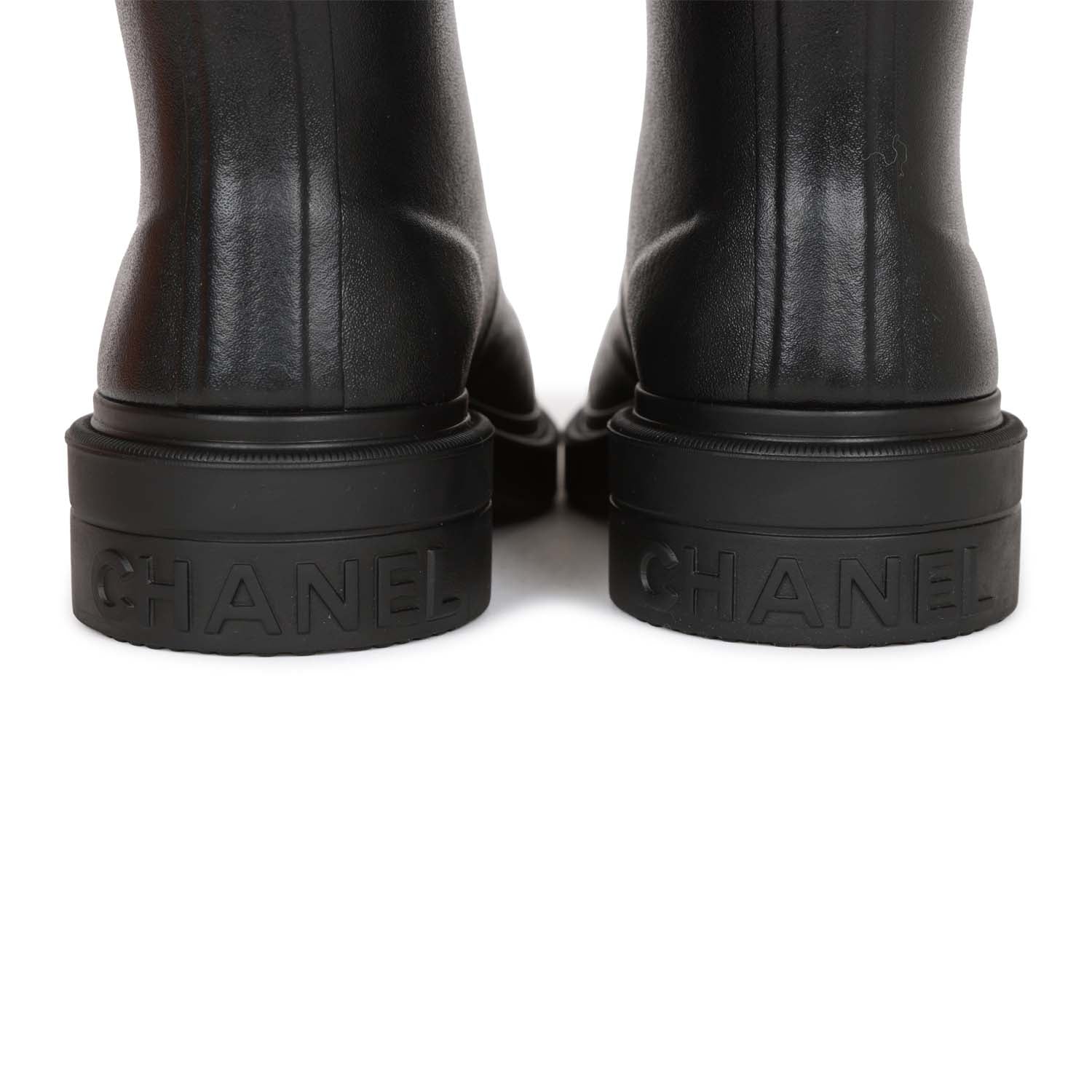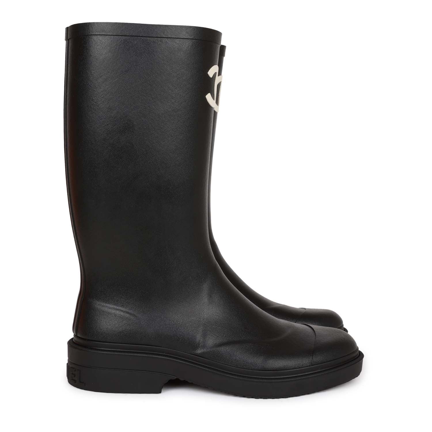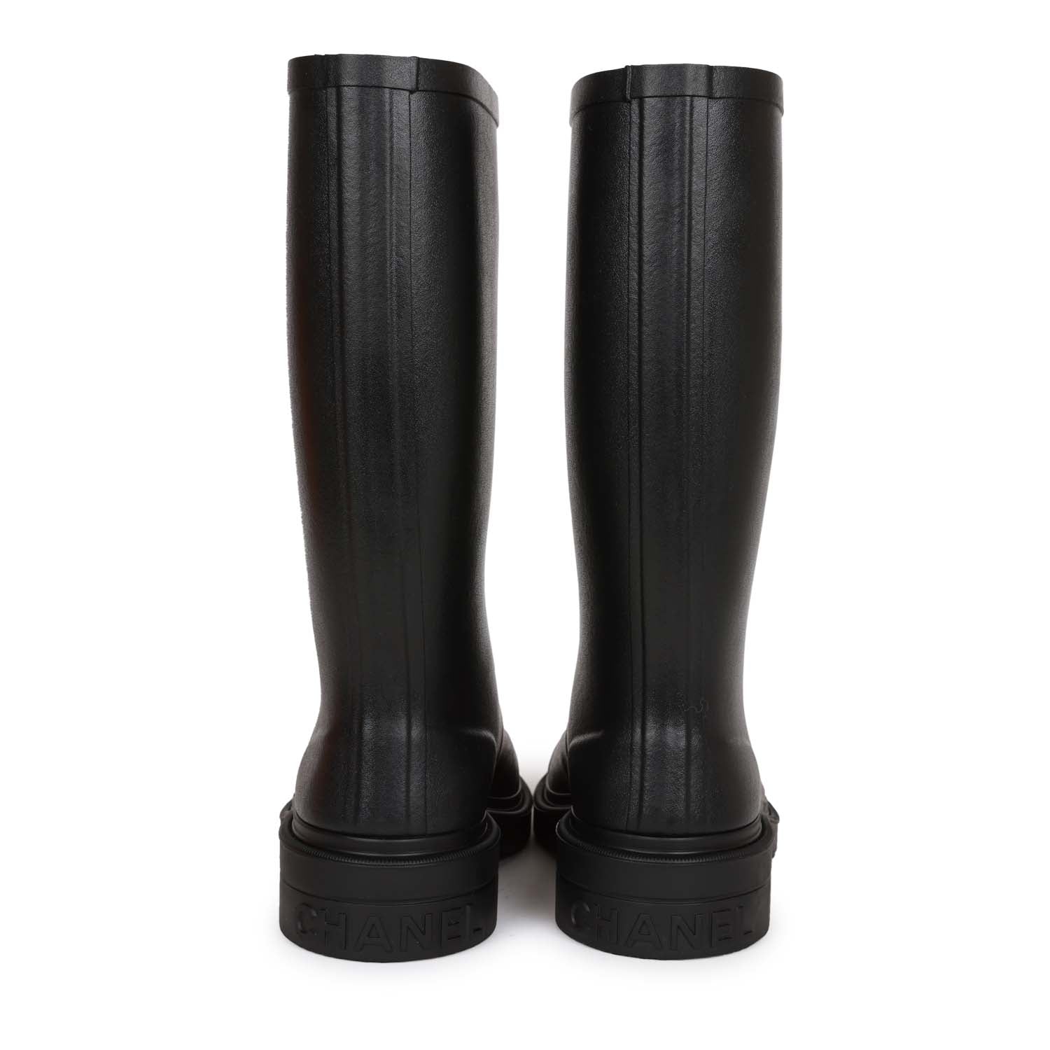 This pair of Chanel Black High Caoutchouc CC boots are in black rubber with CC design and have black leather soles.