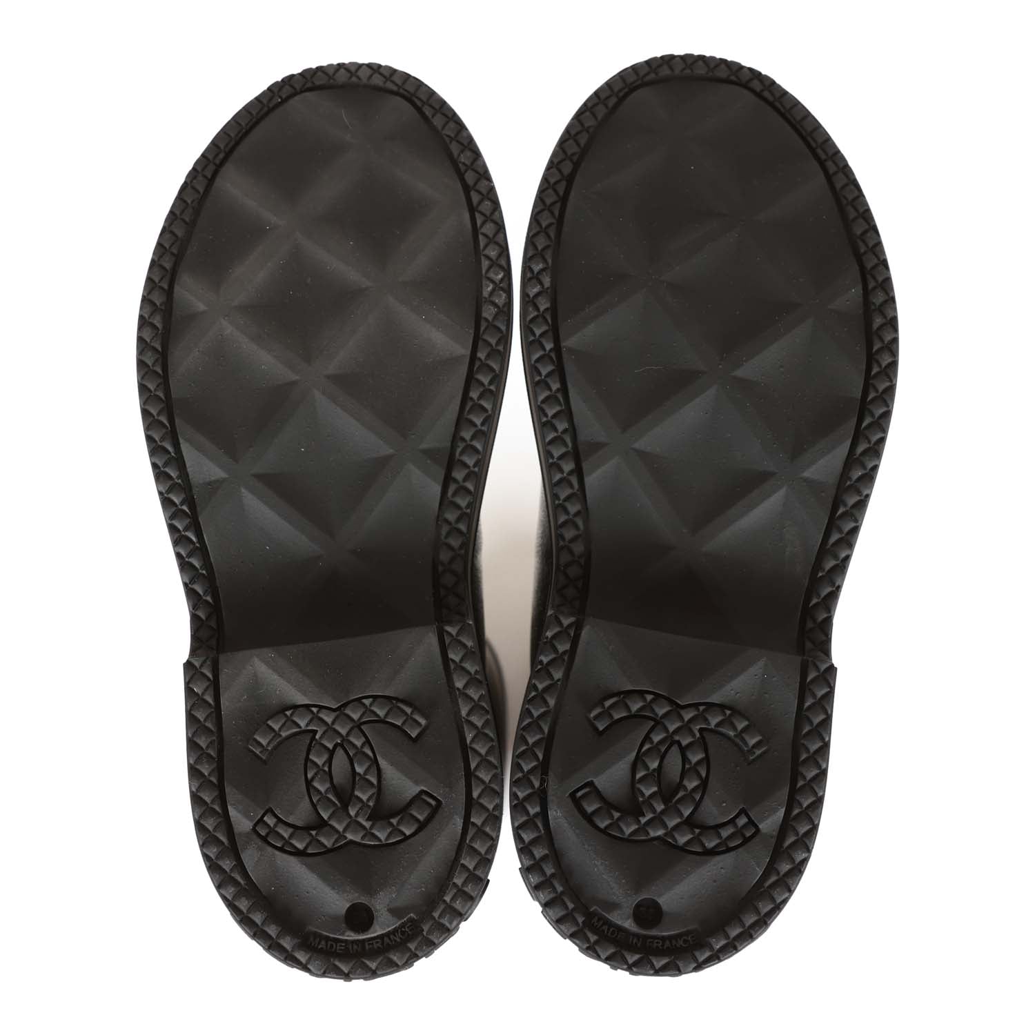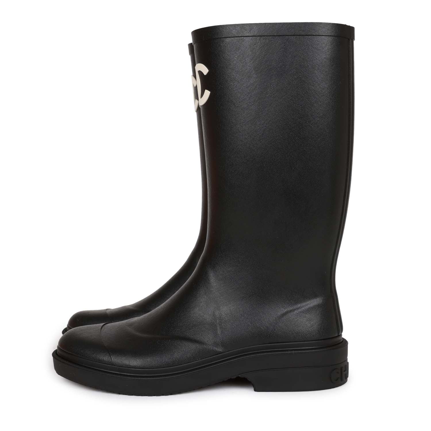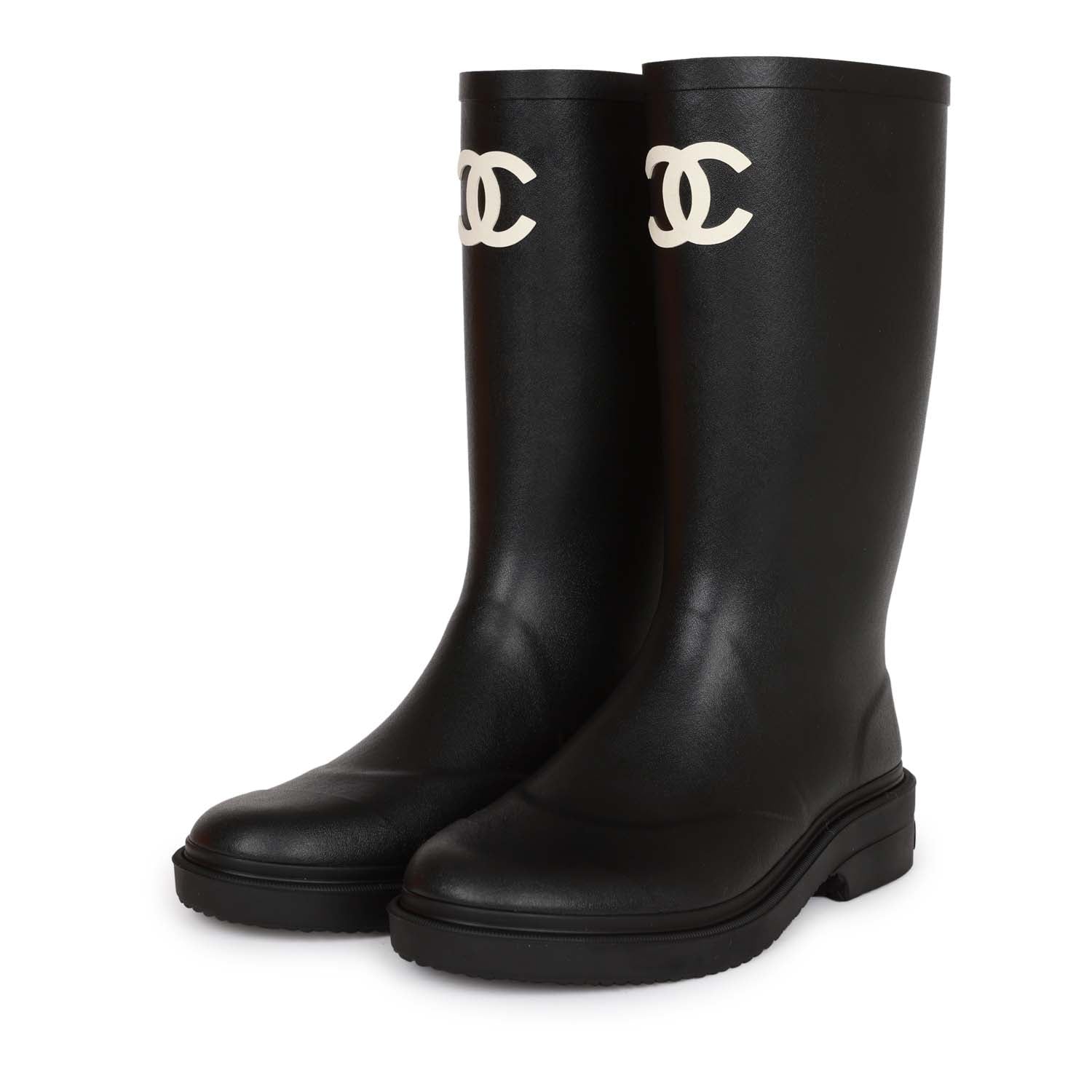 This pair of Chanel Black High Caoutchouc CC boots are in black rubber with CC design and have black leather soles.