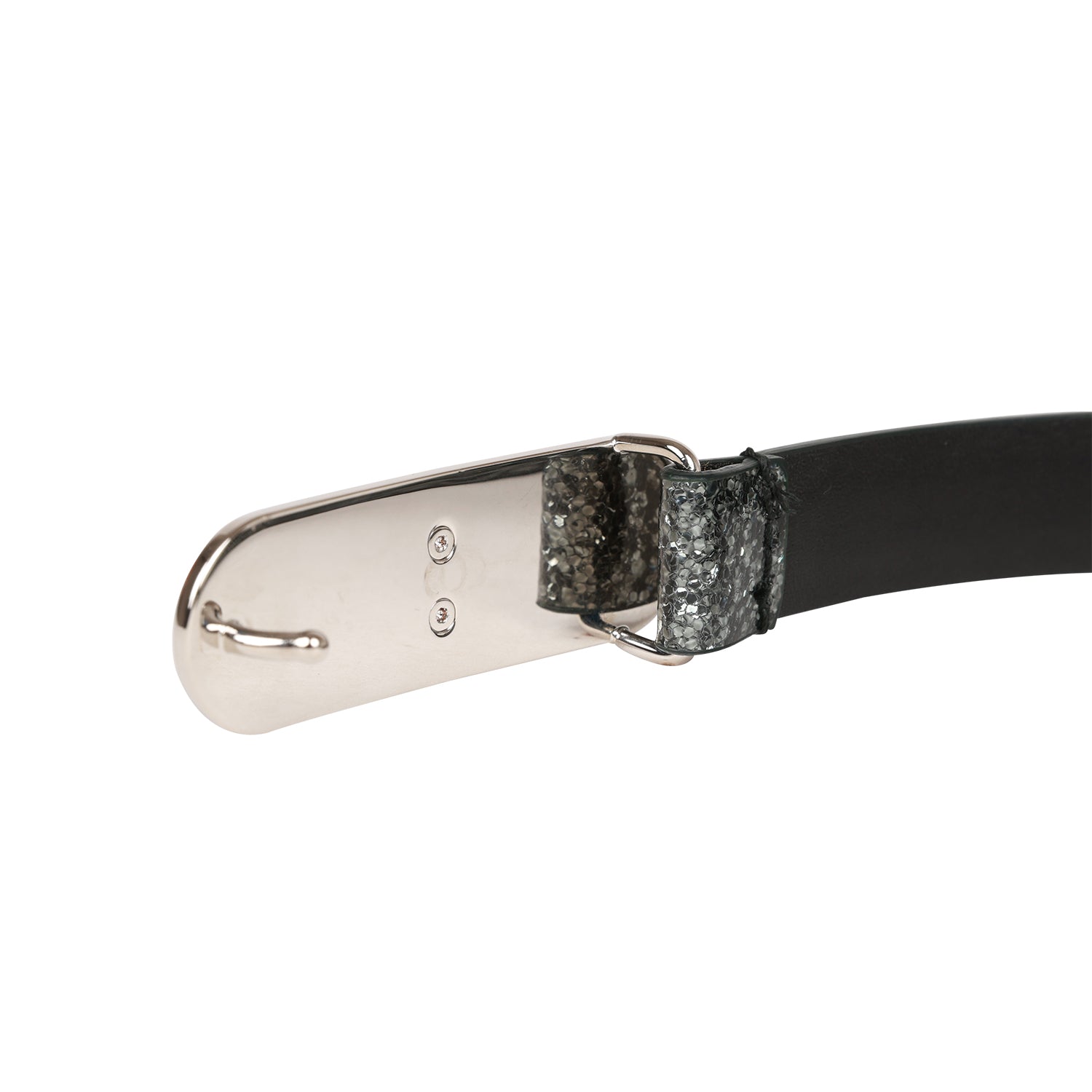 This belt is in dark gold metallic leather with gold tone hardware and is adjustable.