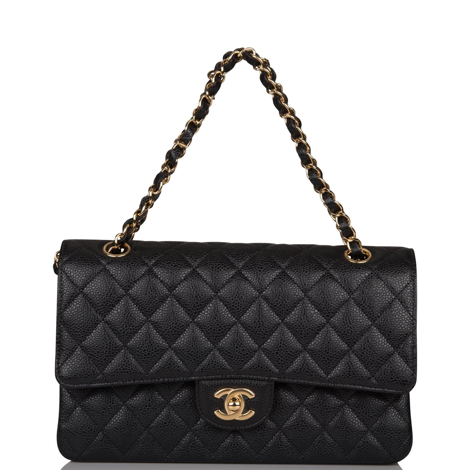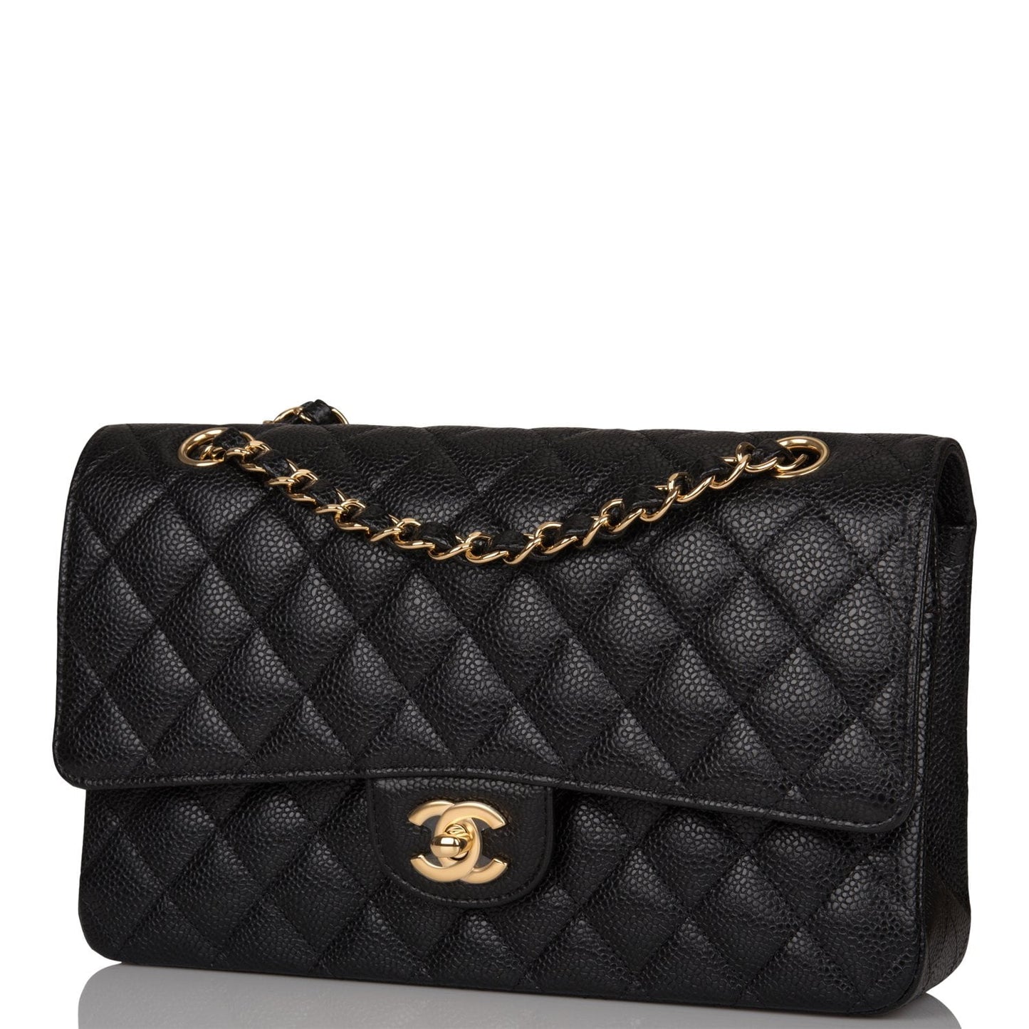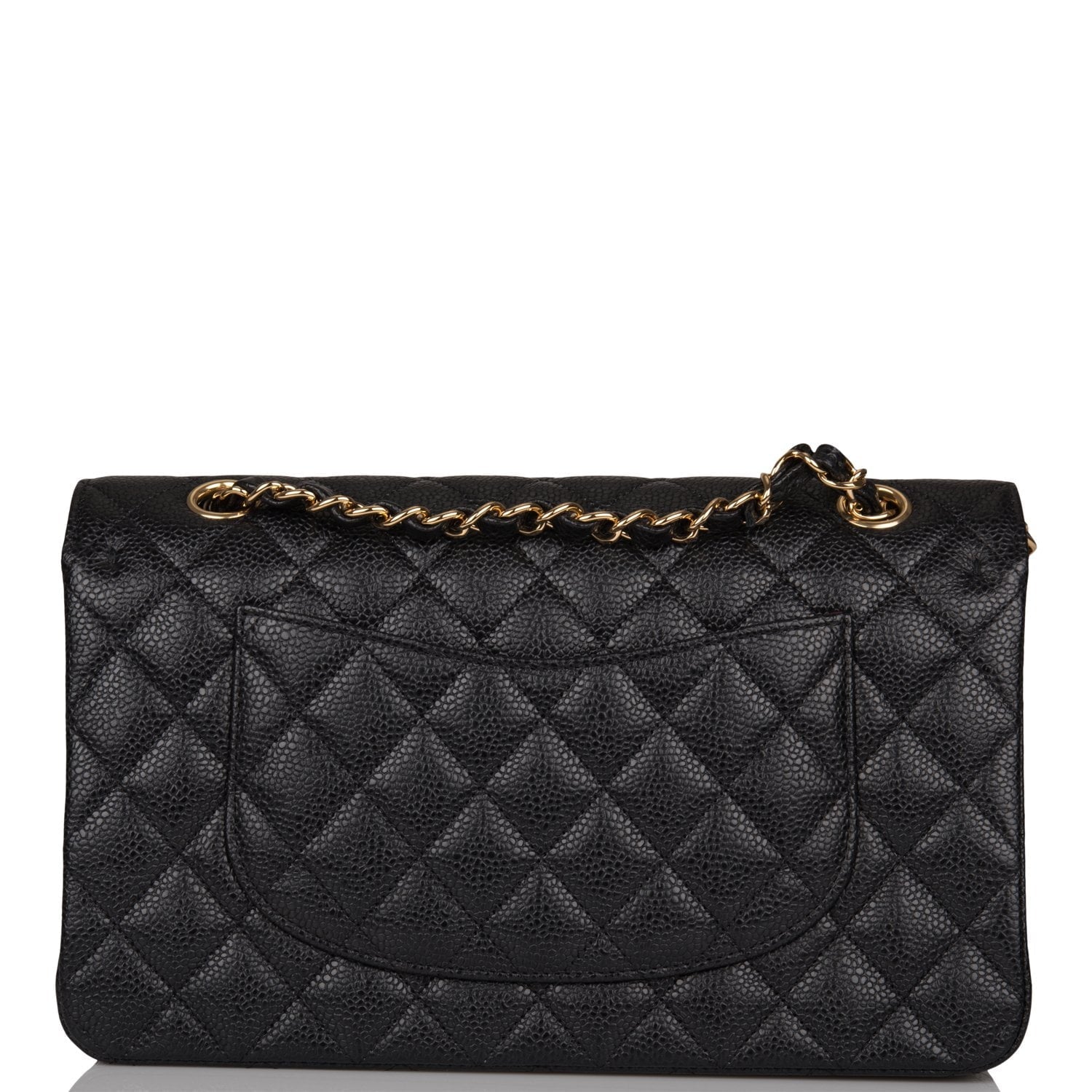 This Medium Classic Double Flap bag is in black caviar leather with gold tone hardware and features a front flap with signature CC turnlock closure, half moon back pocket, and adjustable interwoven gold tone chain link and black leather shoulder strap.