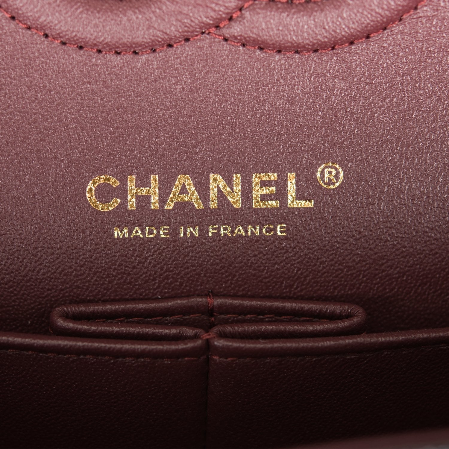 The interior is lined in burgundy leather with the "love letter" zipper compartment underneath the first flap, an "outer" slit pocket under the second flap, and an interior compartment with two open pockets separated by a "lipstick" compartment.
