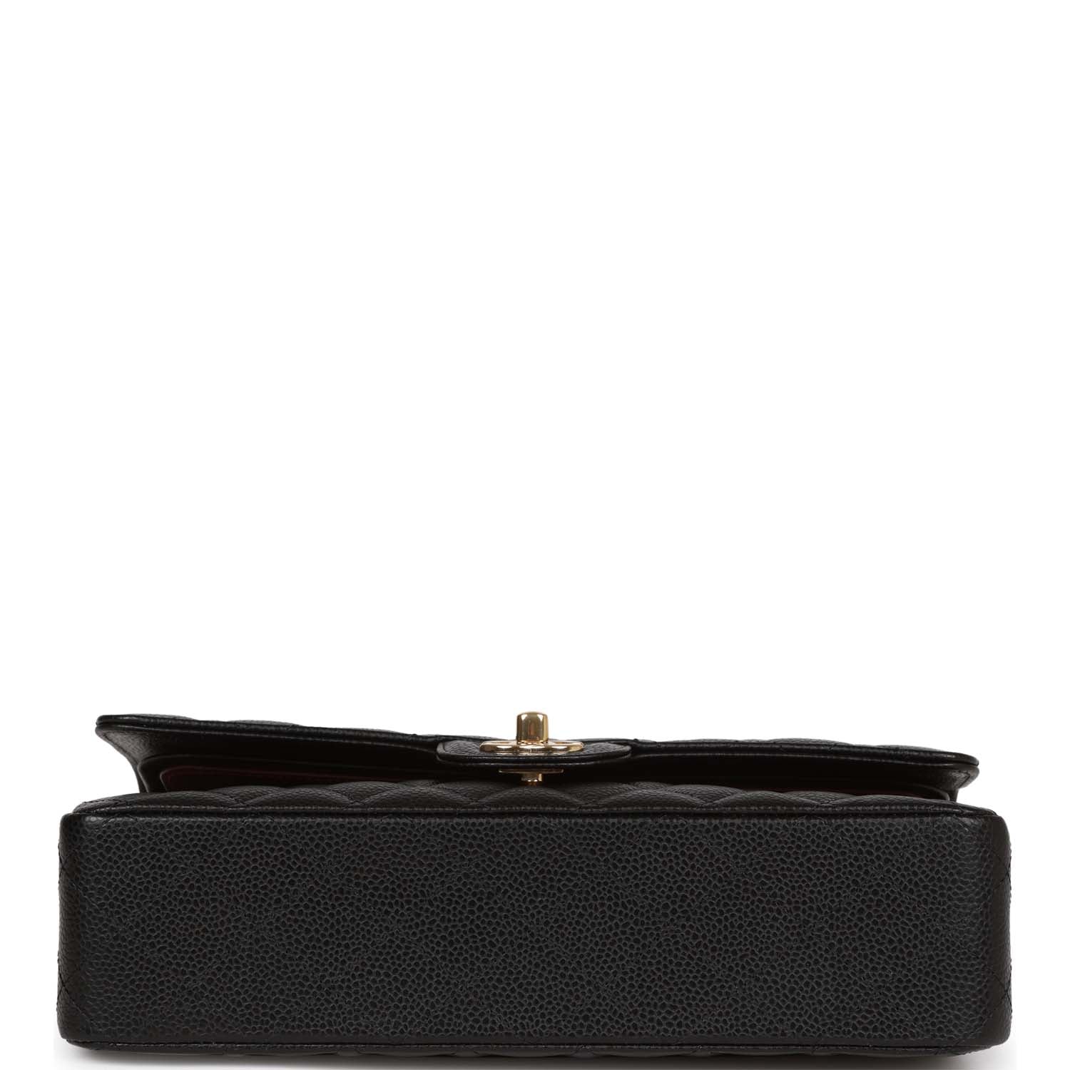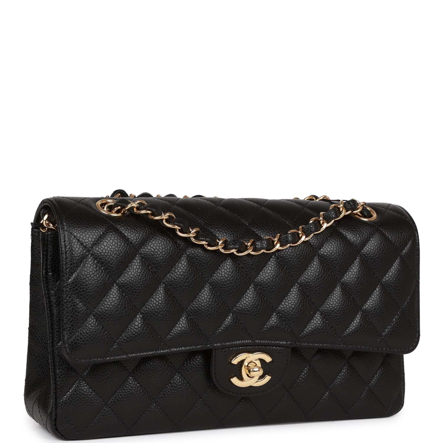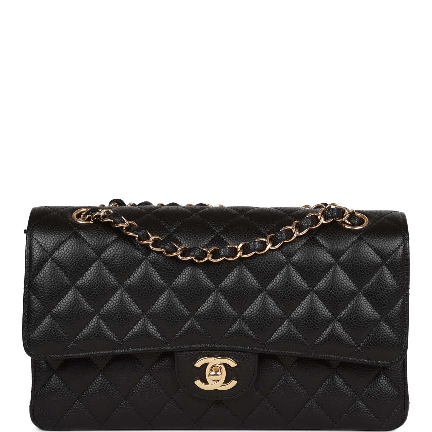 This Medium Classic Double Flap bag is in Black caviar leather with gold tone hardware and features a front flap with signature CC turnlock closure, half moon back pocket, and adjustable interwoven gold tone chain link and black leather shoulder strap.