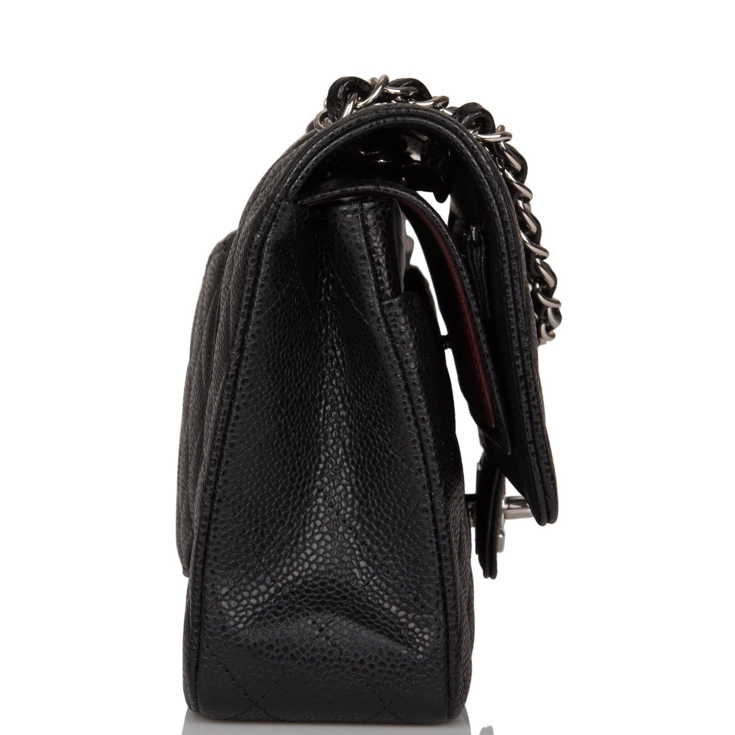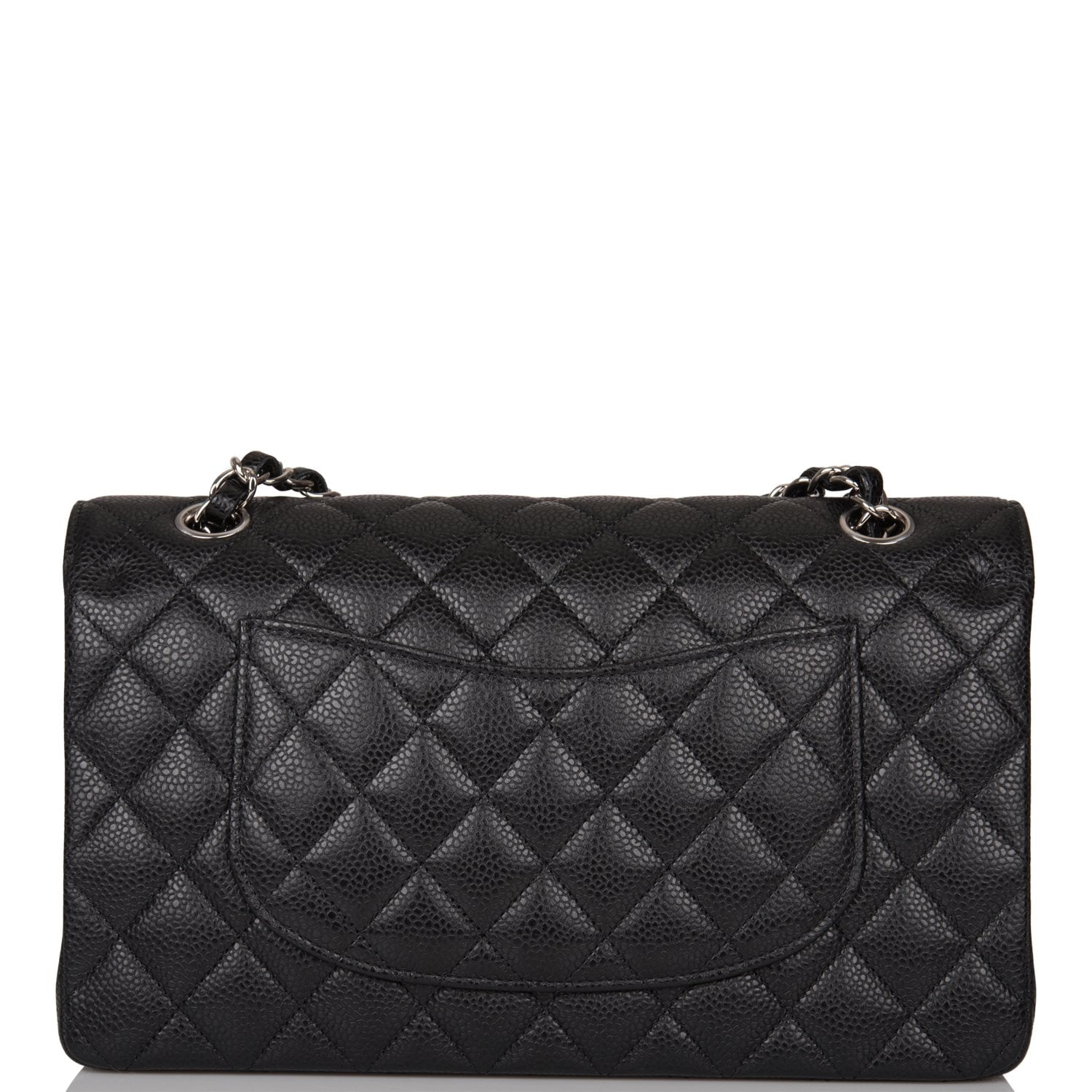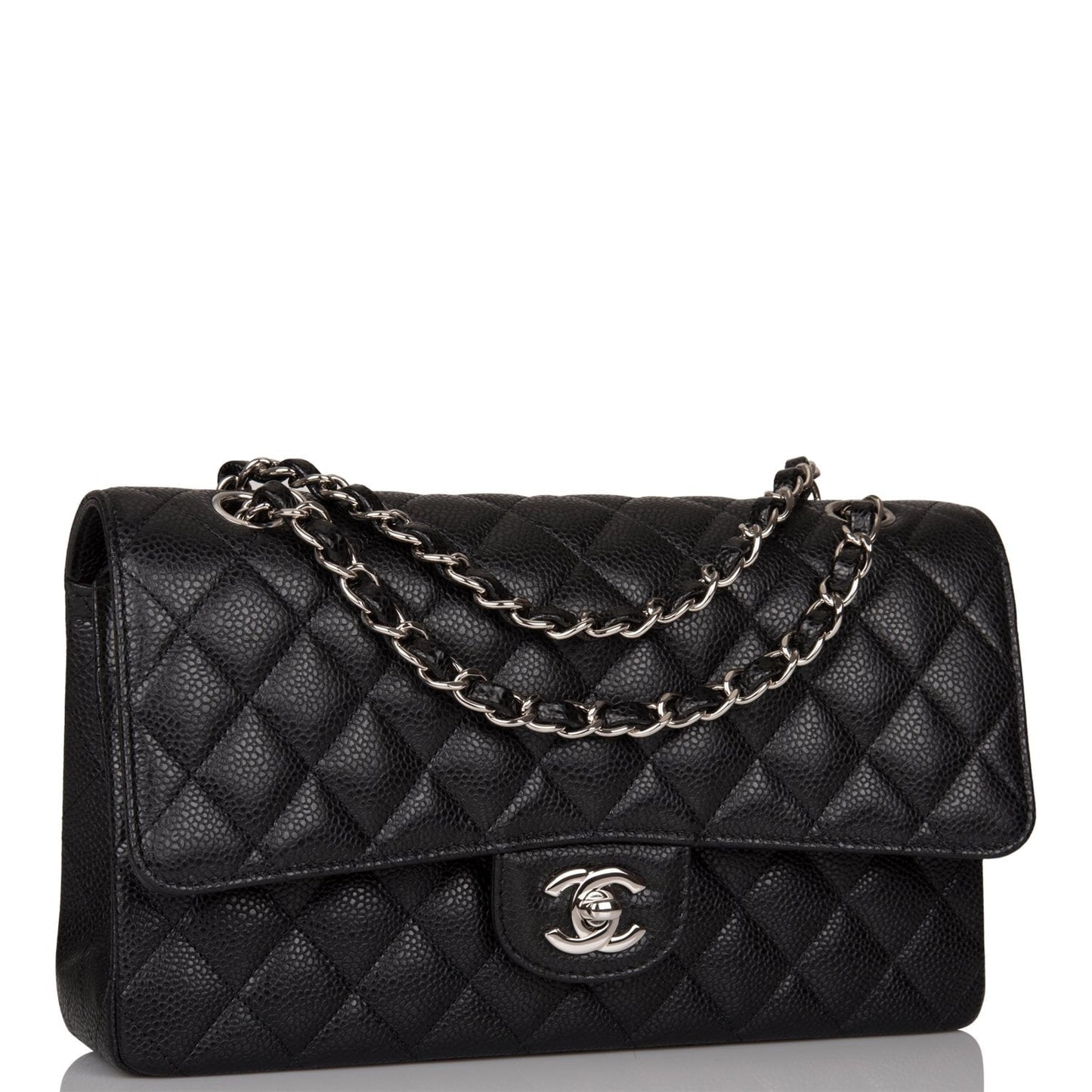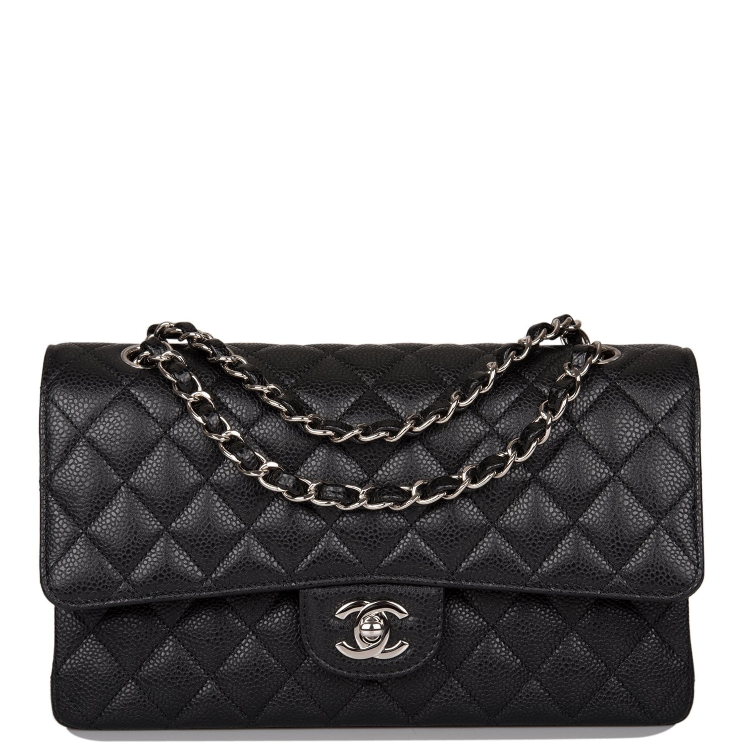 This Medium Classic Double Flap bag is in black caviar leather with silver tone hardware and features a front flap with signature CC turnlock closure, half moon back pocket, and adjustable interwoven silver tone chain link and black leather shoulder strap.