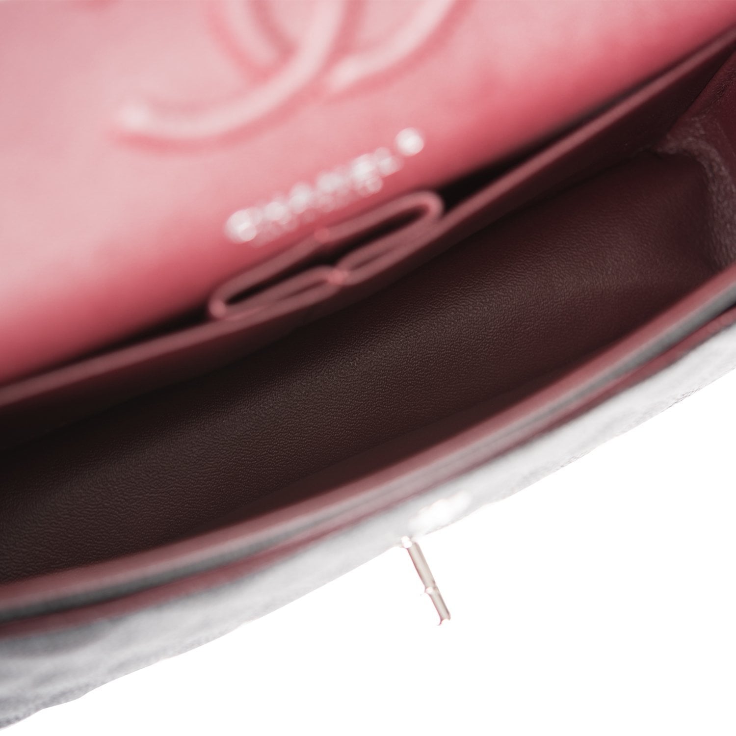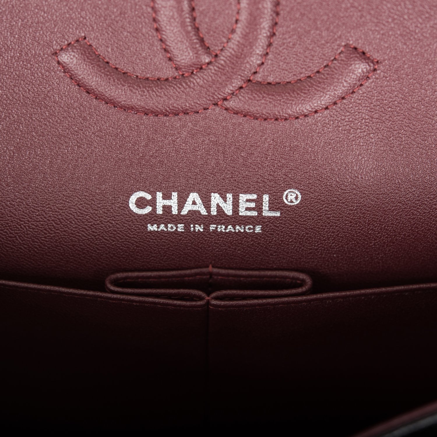 The interior is lined in burgundy leather with the "love letter" zipper compartment underneath the first flap, an "outer" slit pocket under the second flap, and an interior compartment with two open pockets separated by a "lipstick" compartment.