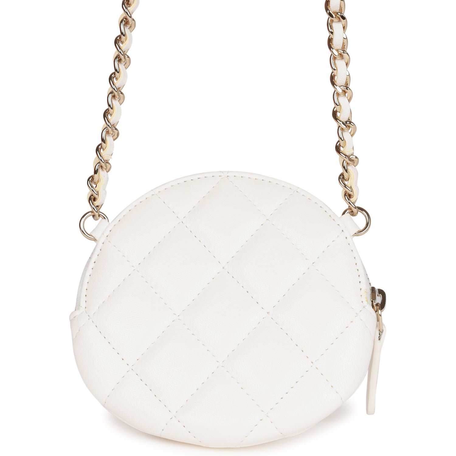 This Camellia Clutch with Chain is of white lambskin with light gold tone hardware and has the signature diamond quilting, zip top closure and long light gold tone and white leather chain.
