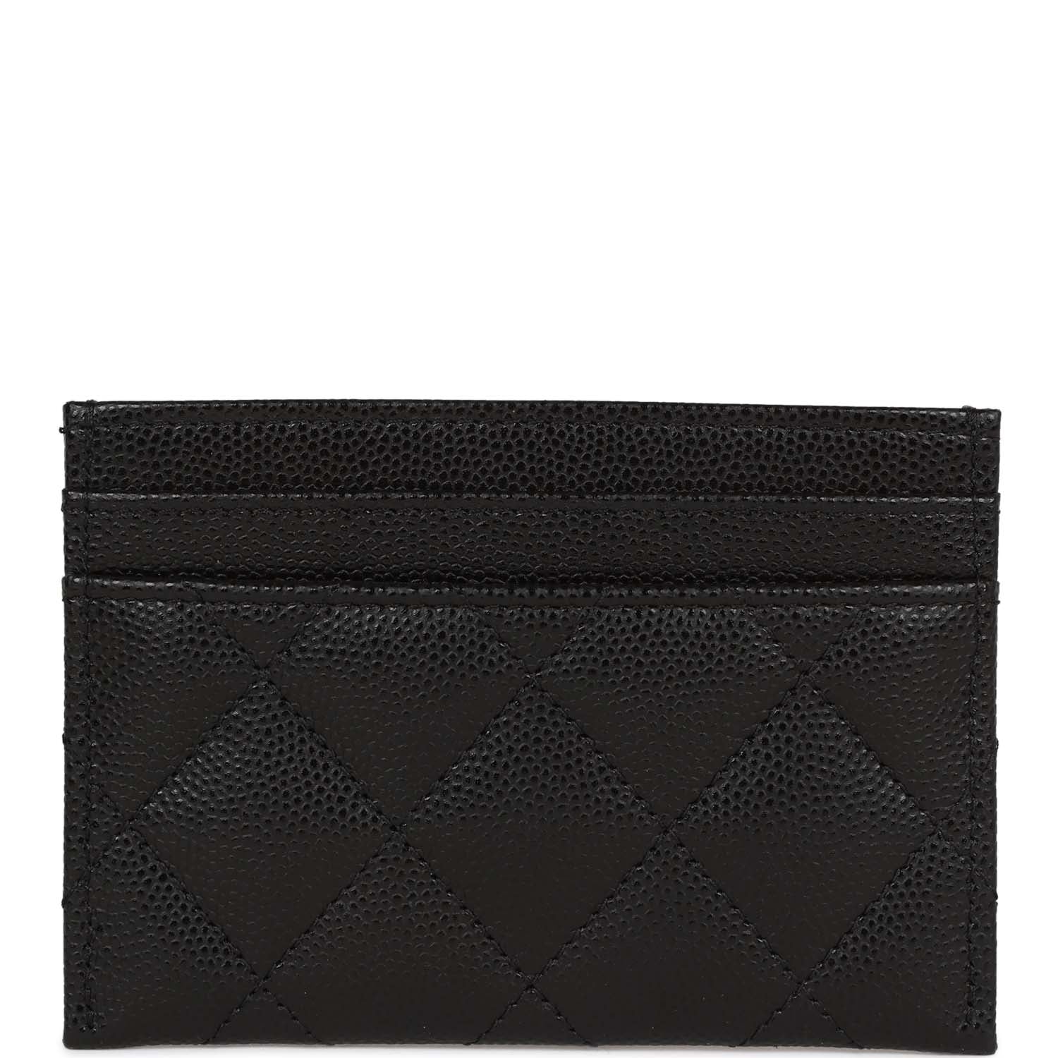 This cardholder is in Black caviar leather with light gold hardware and features a woven crystal CC logo and four card slots.