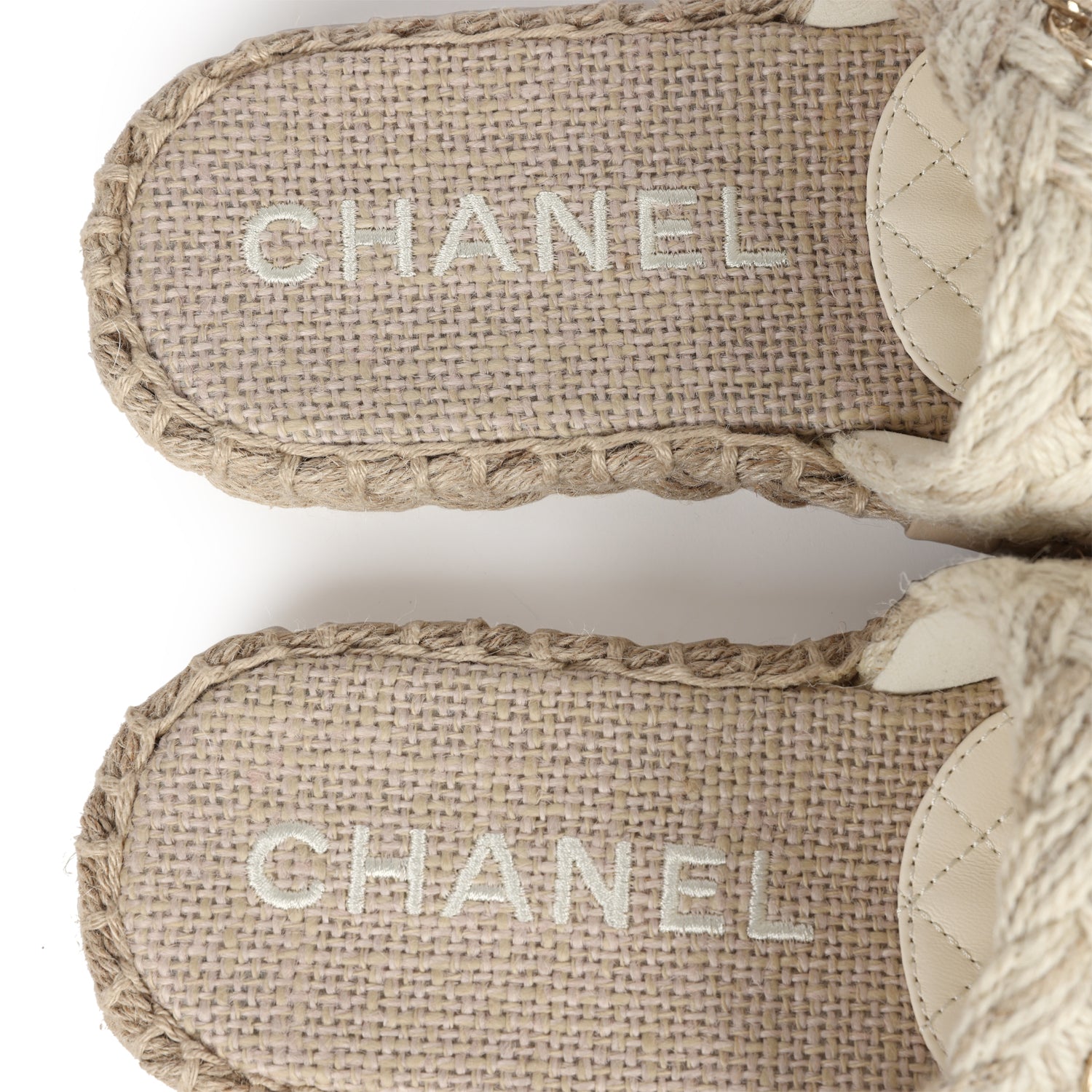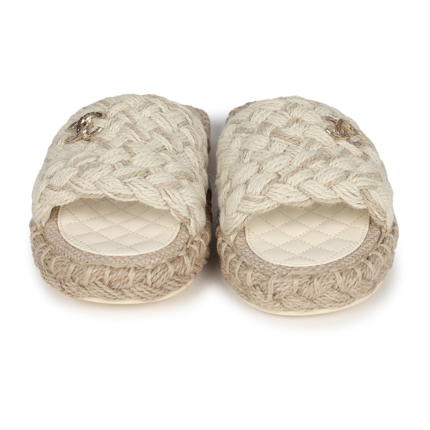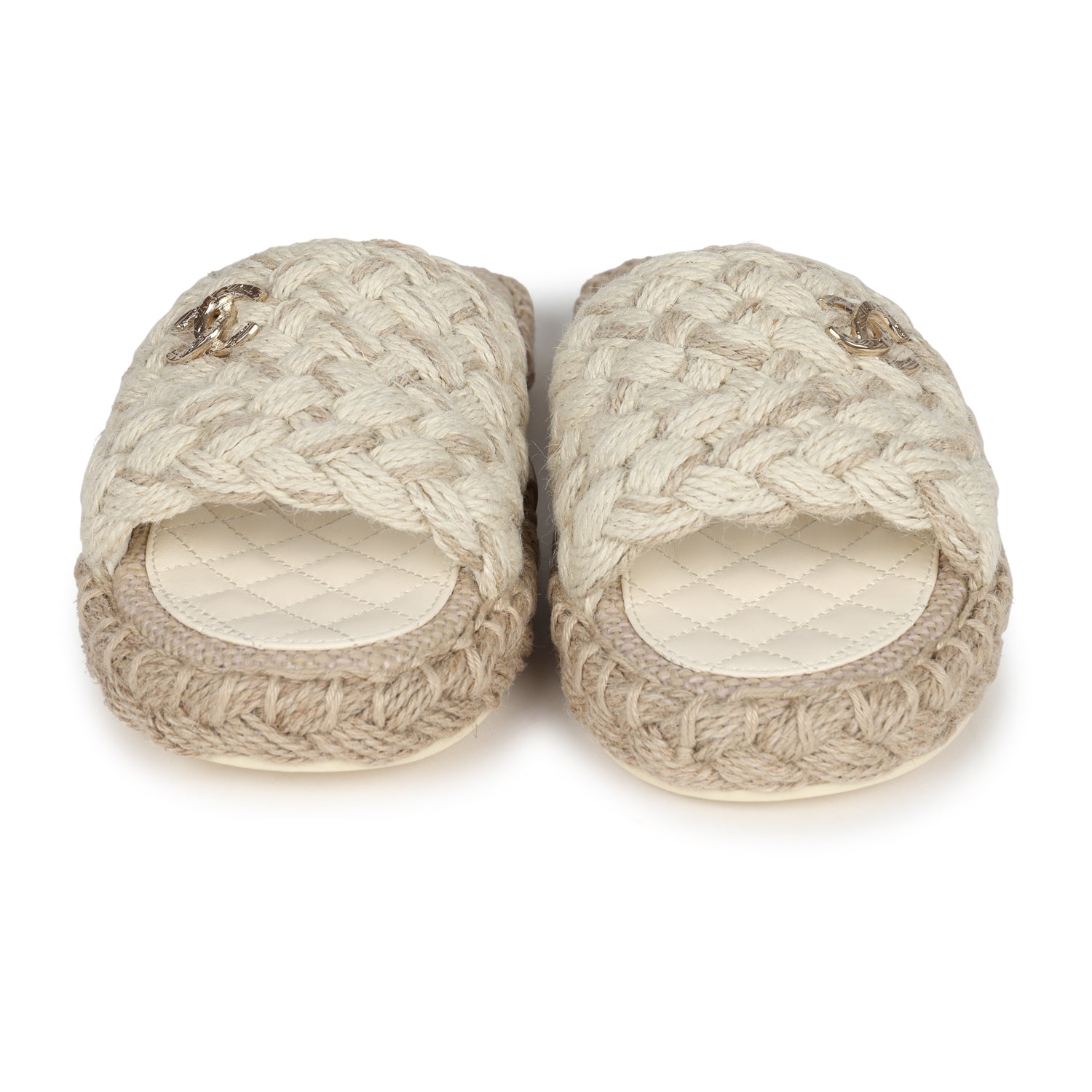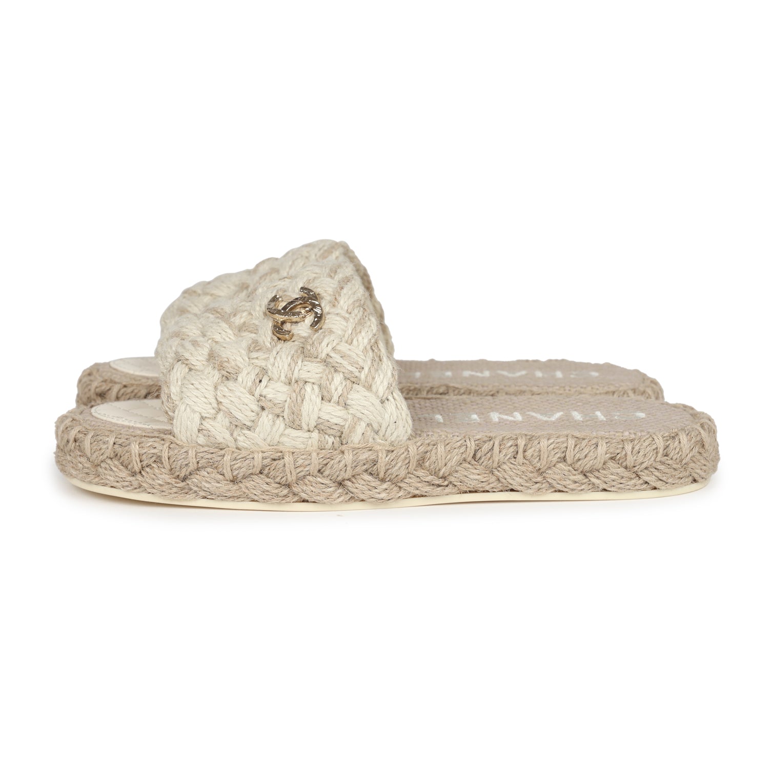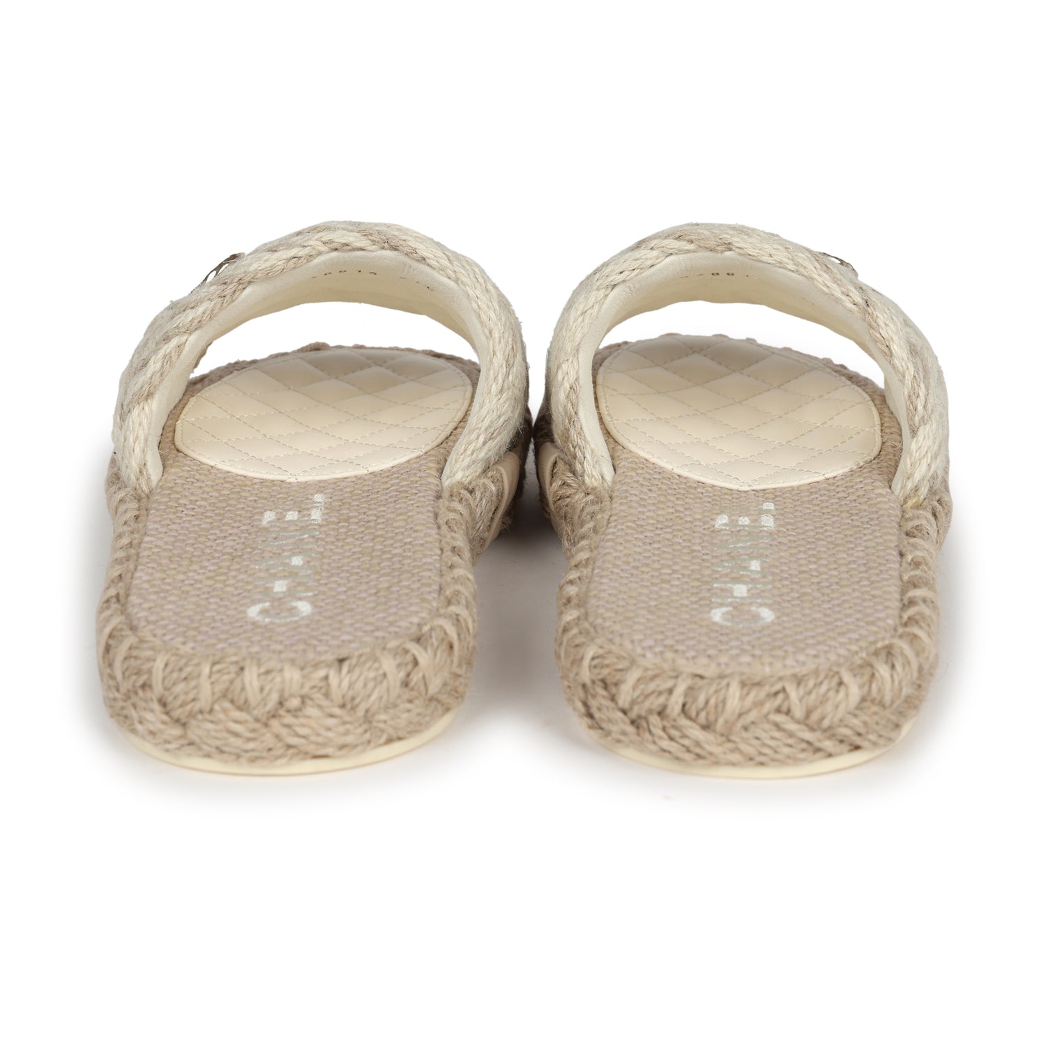 These Chanel CC braided knit slide sandals are made of cream and beige hemp rope with beige quilted leather detail on the insole. There is a gold Chanel CC logo on the toebox.