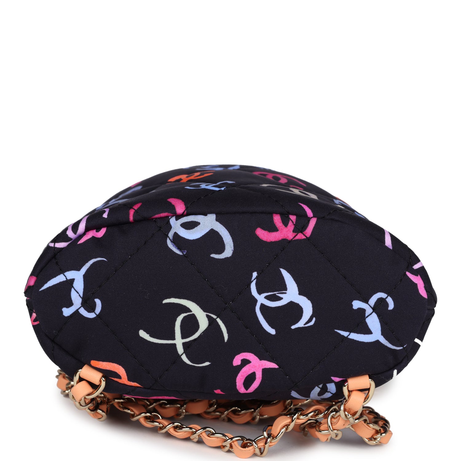 This Chanel medium drawstring backpack is in multicolored printed fabric with light gold hardware, featuring multicolored CC logo printed fabric, a drawstring closure with a light gold and coral "pearl" ball stopper, and light gold tone and interwoven leather backpack straps with a coral "Chanel" light gold and enamel logo charm connected to the backpack straps.