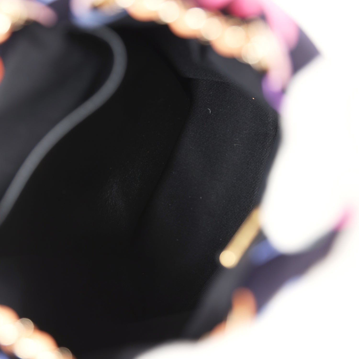The interior is lined in black grossgrain fabric with one small slit pocket on rear wall.