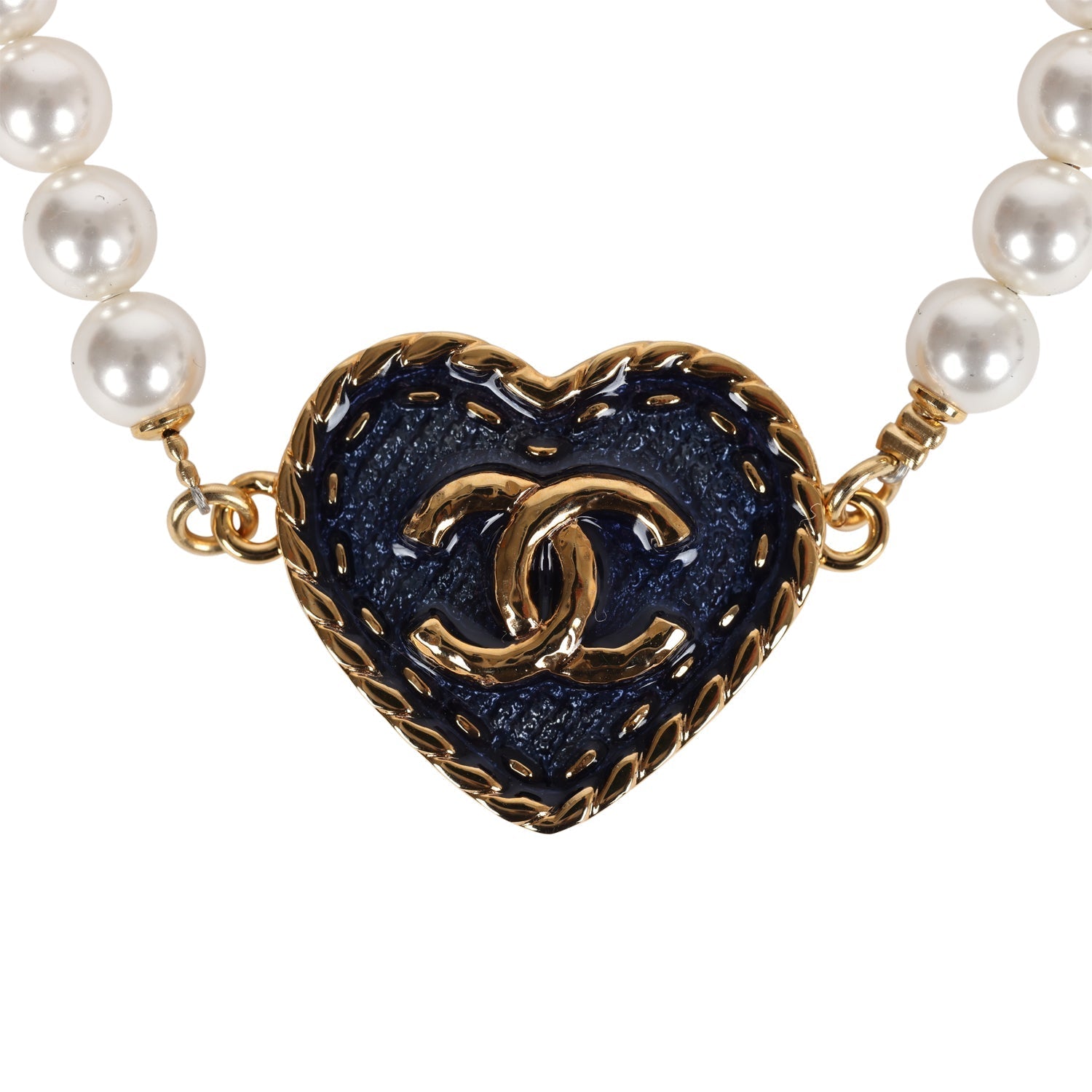 Chanel CC Heart Denim & Pearls Bracelet Blue/White Gold Hardware