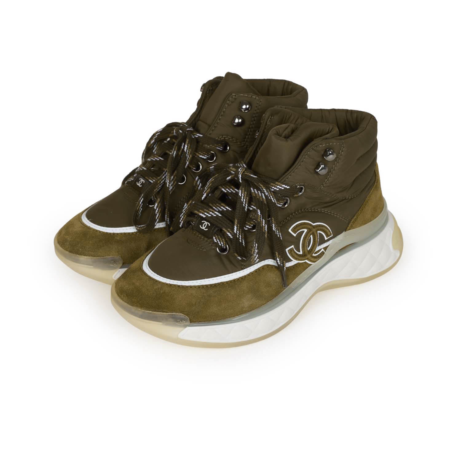 Chanel CC Hightop Winter Sneakers Olive Green Nylon and Suede 35