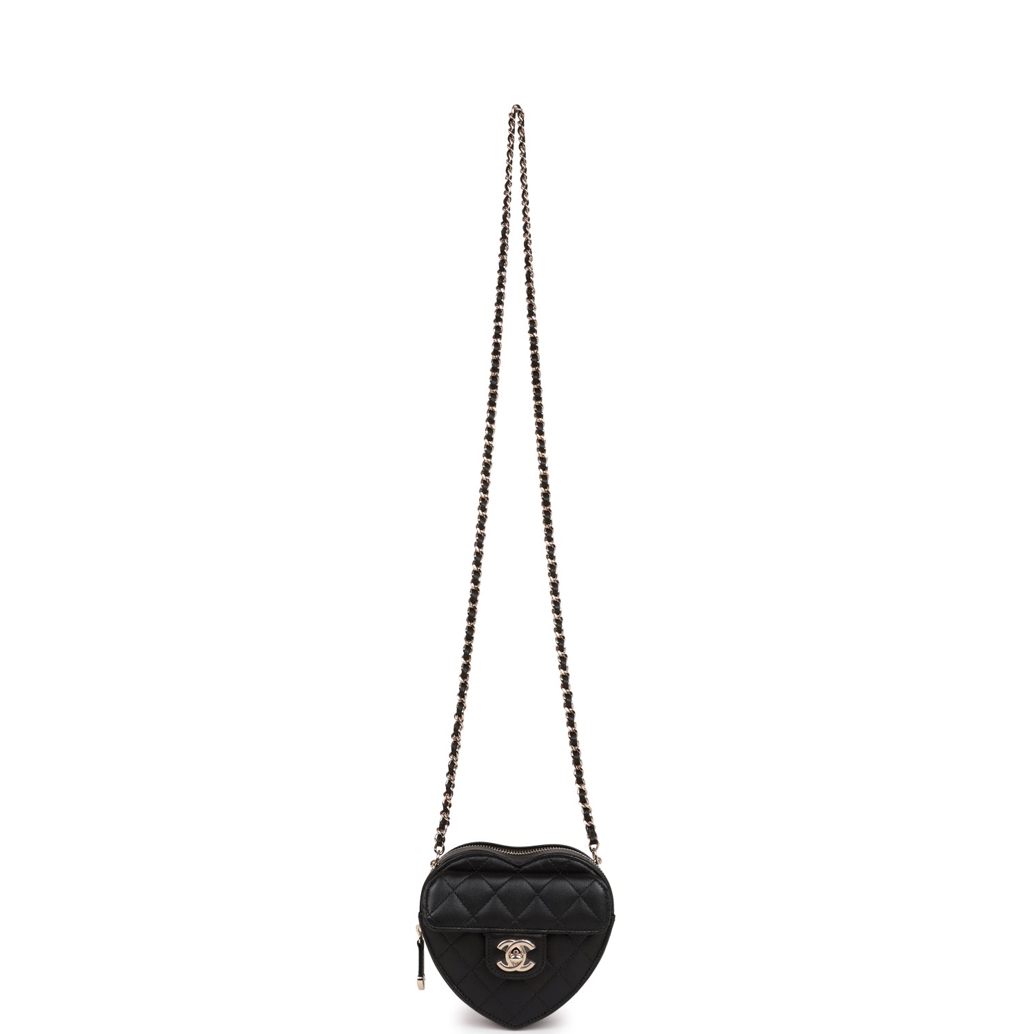 This CC In Love Heart Clutch with Chain is in black lambskin leather with light gold tone hardware and features a front flap with signature CC turnlock closure, half moon back pocket, zip top closure and an interwoven light gold tone chain link and black leather shoulder strap.