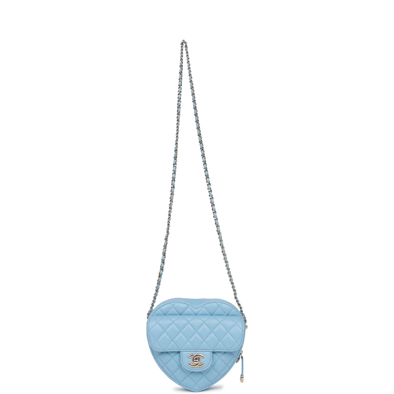This CC In Love Large Heart bag is in blue lambskin leather with light gold tone hardware and features a front flap with signature CC turnlock closure, half moon back pocket, zip top closure and an interwoven light gold tone chain link and blue leather shoulder strap.