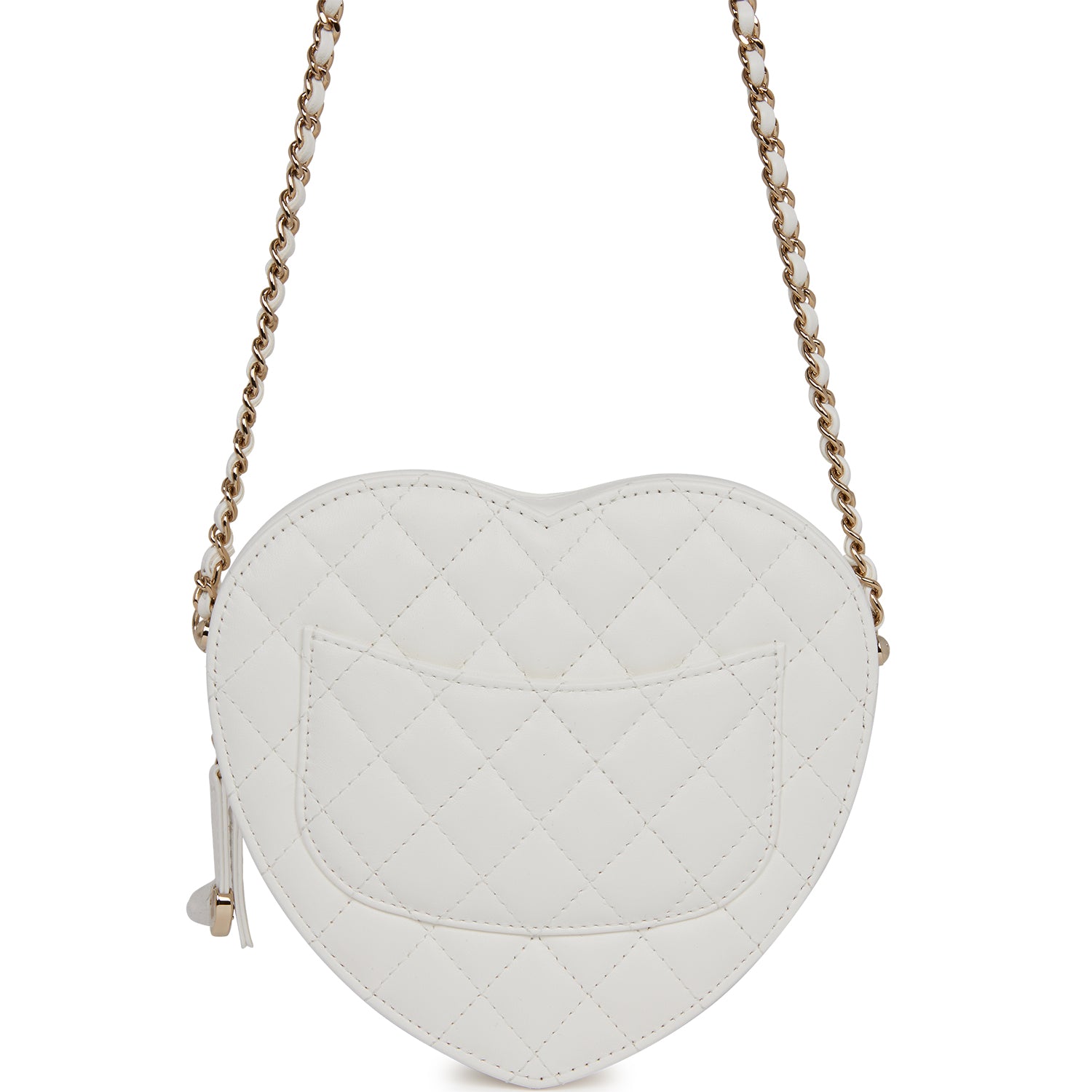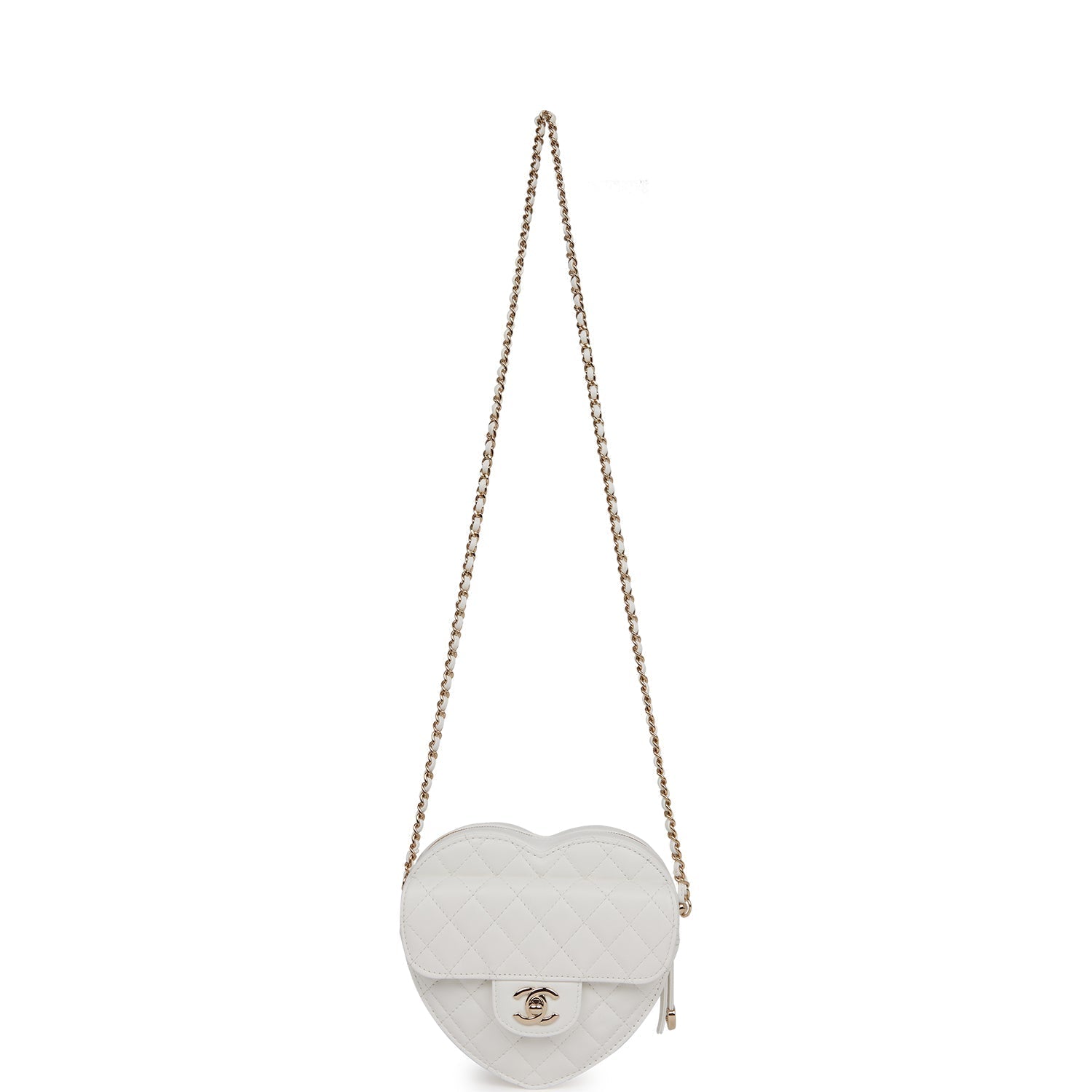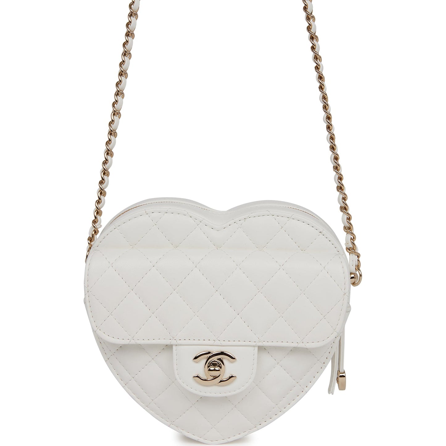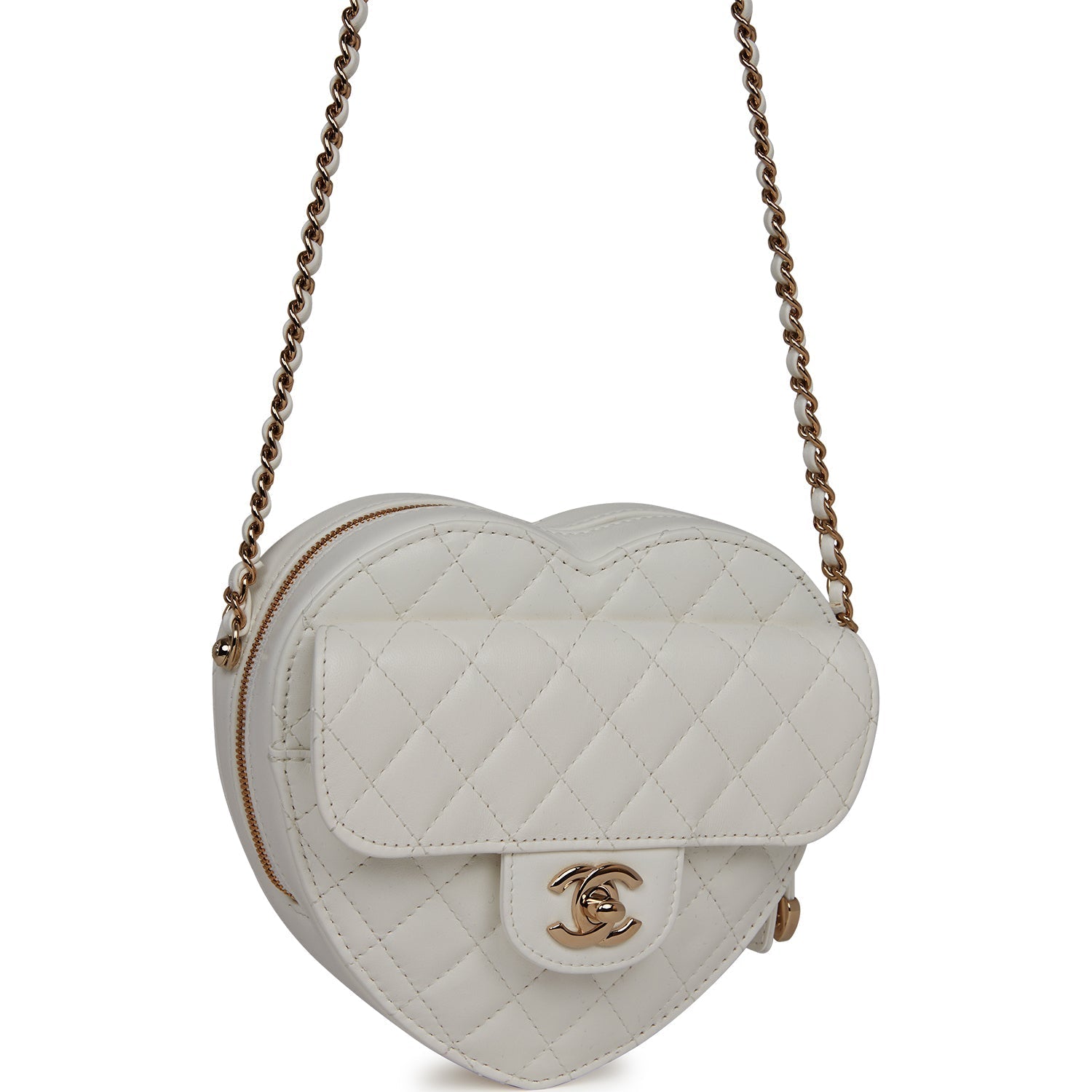 This CC In Love Large Heart bag is in white lambskin leather with light gold tone hardware and features a front flap with signature CC turnlock closure, half moon back pocket, zip top closure and an interwoven light gold tone chain link and white leather shoulder strap.