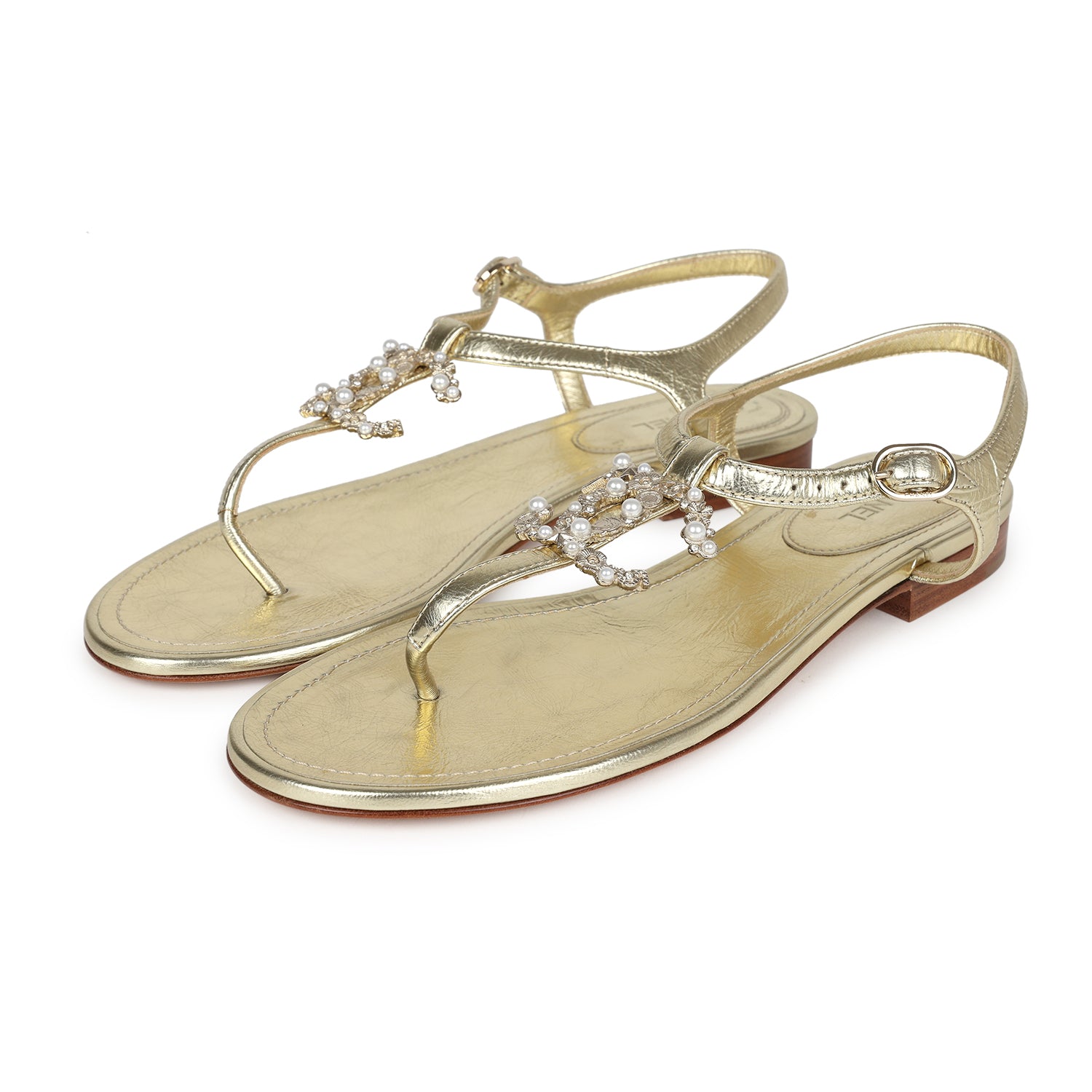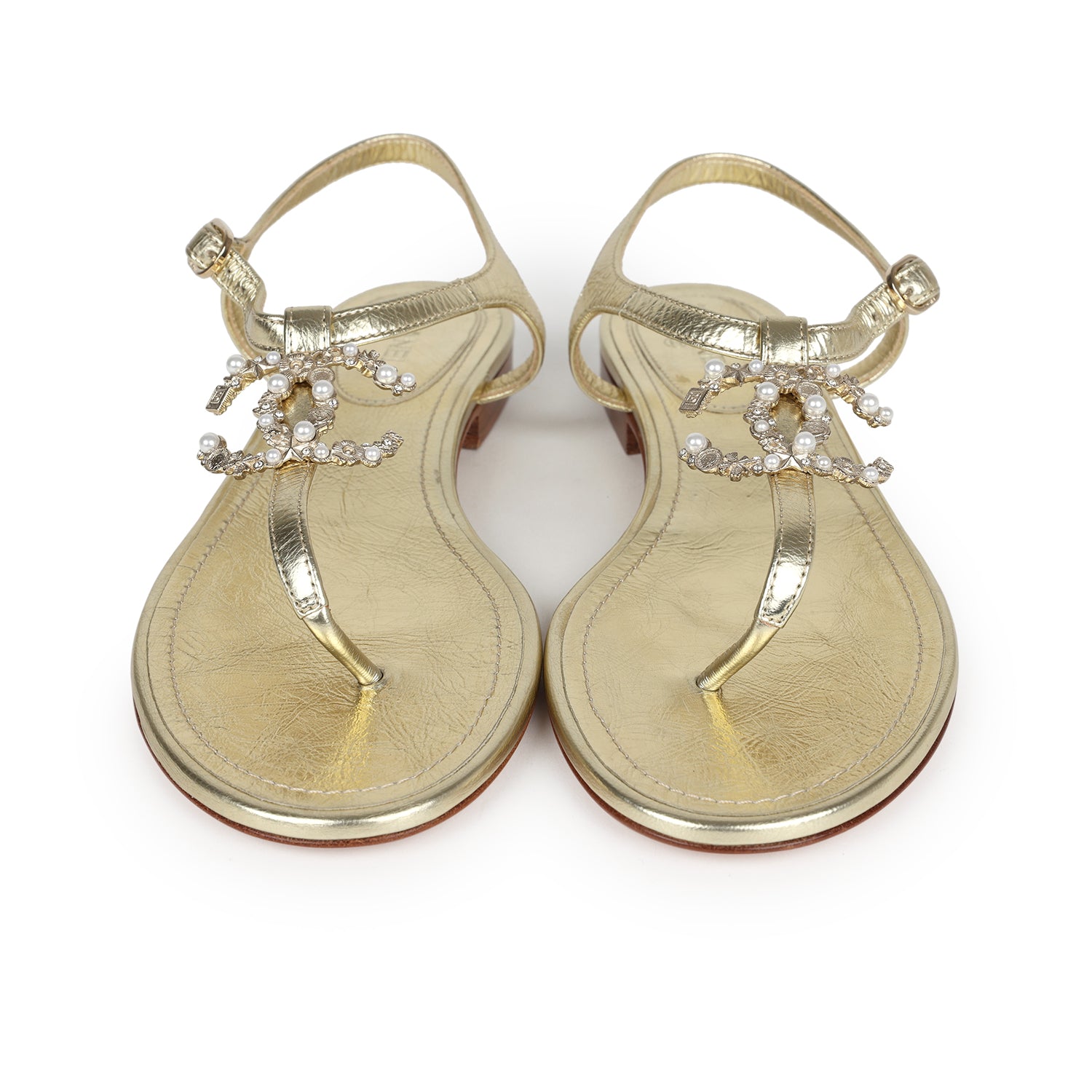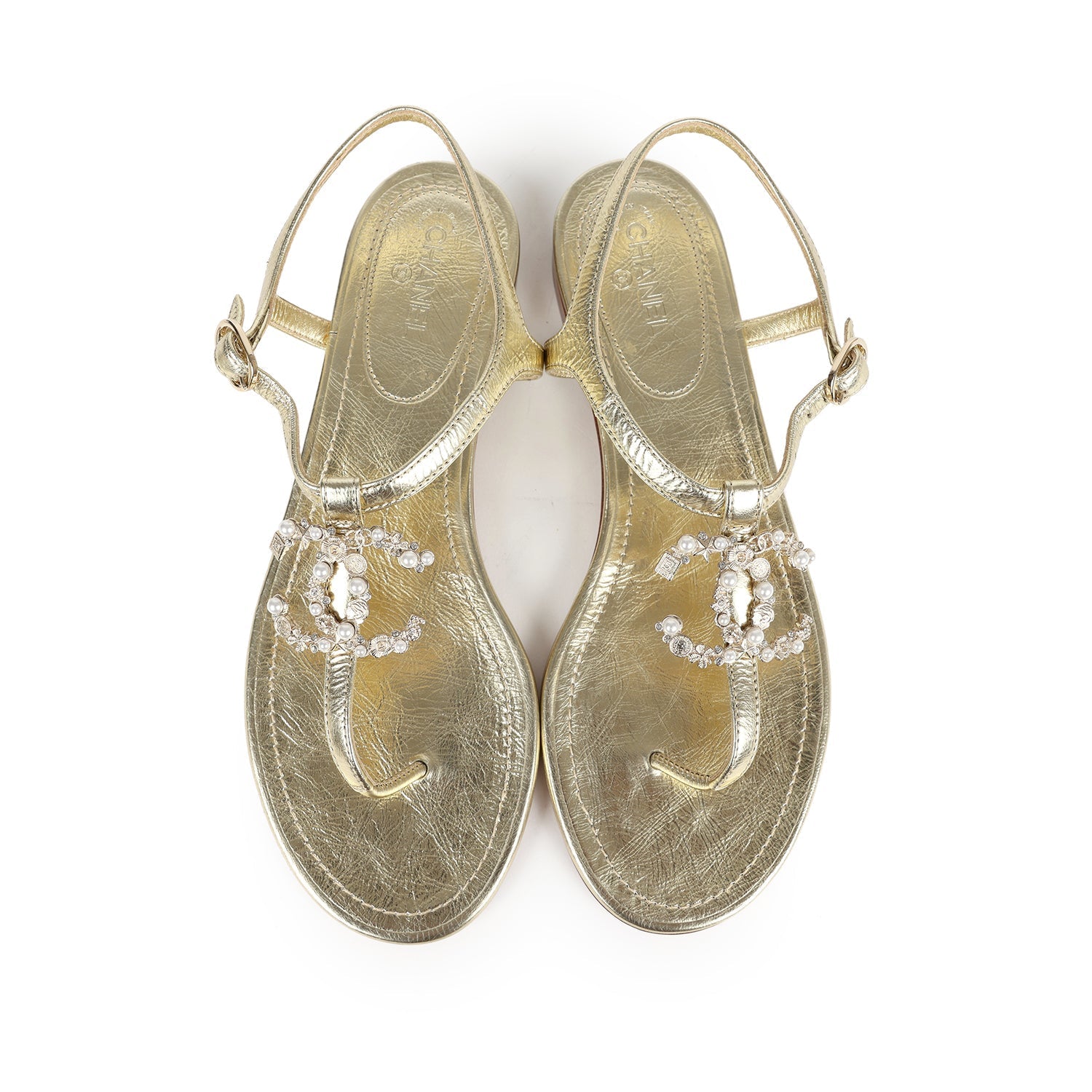 These Chanel jeweled CC thong sandals are in metallic gold leather with light gold hardware. This sandal features a gold jeweled CC on the front of the sandal, an adjustable strap, natural leather insole, and rubber sole.