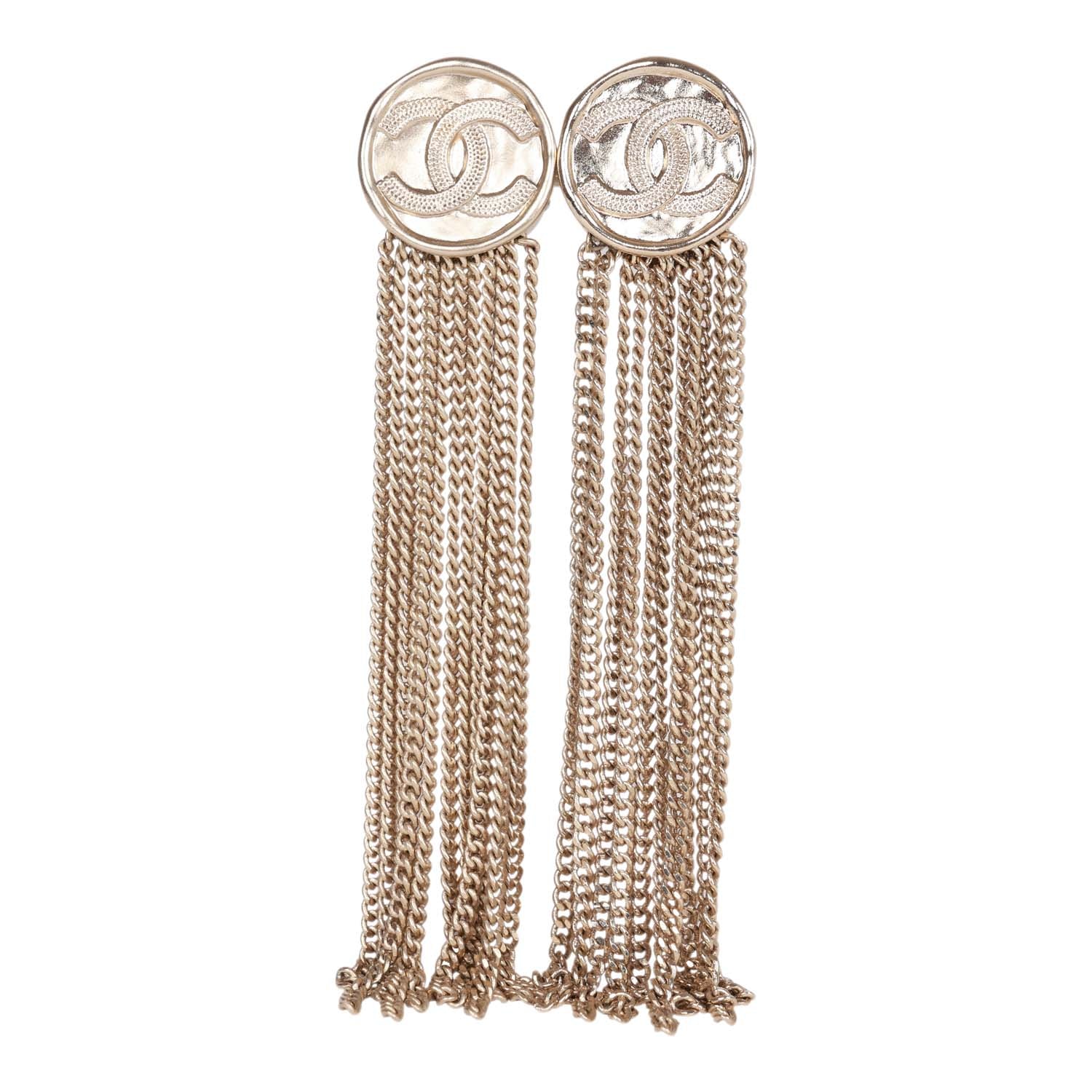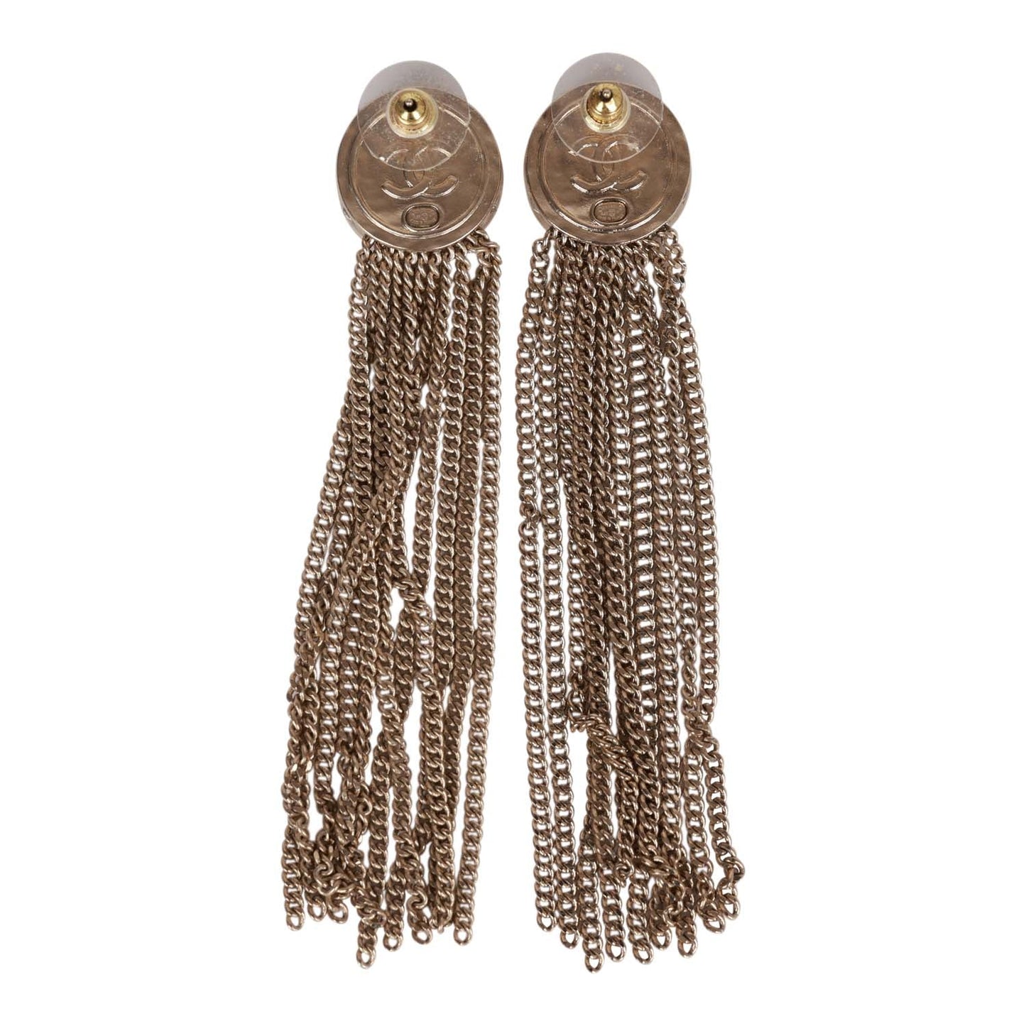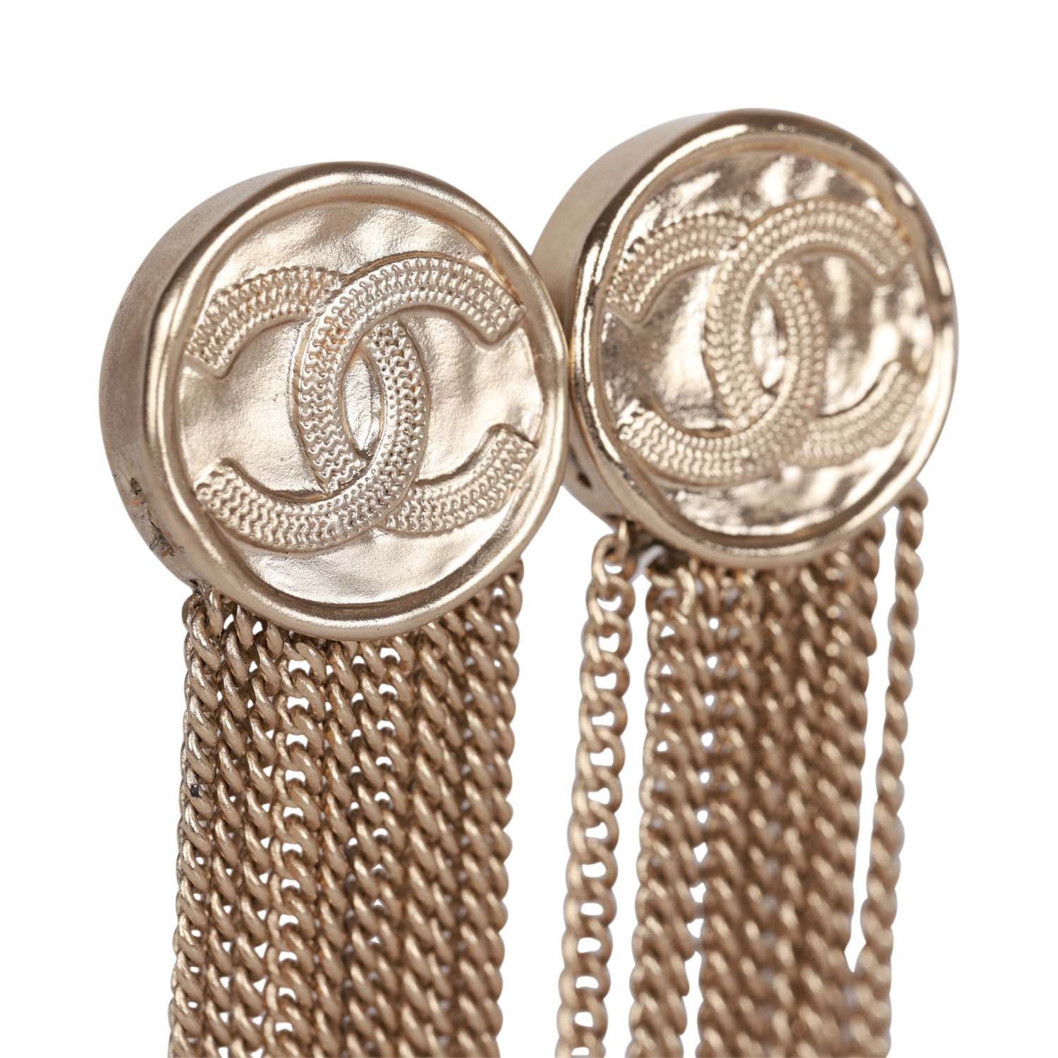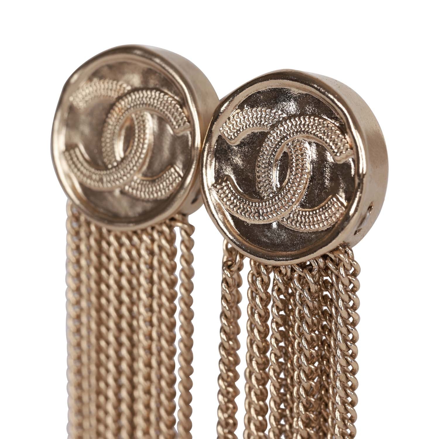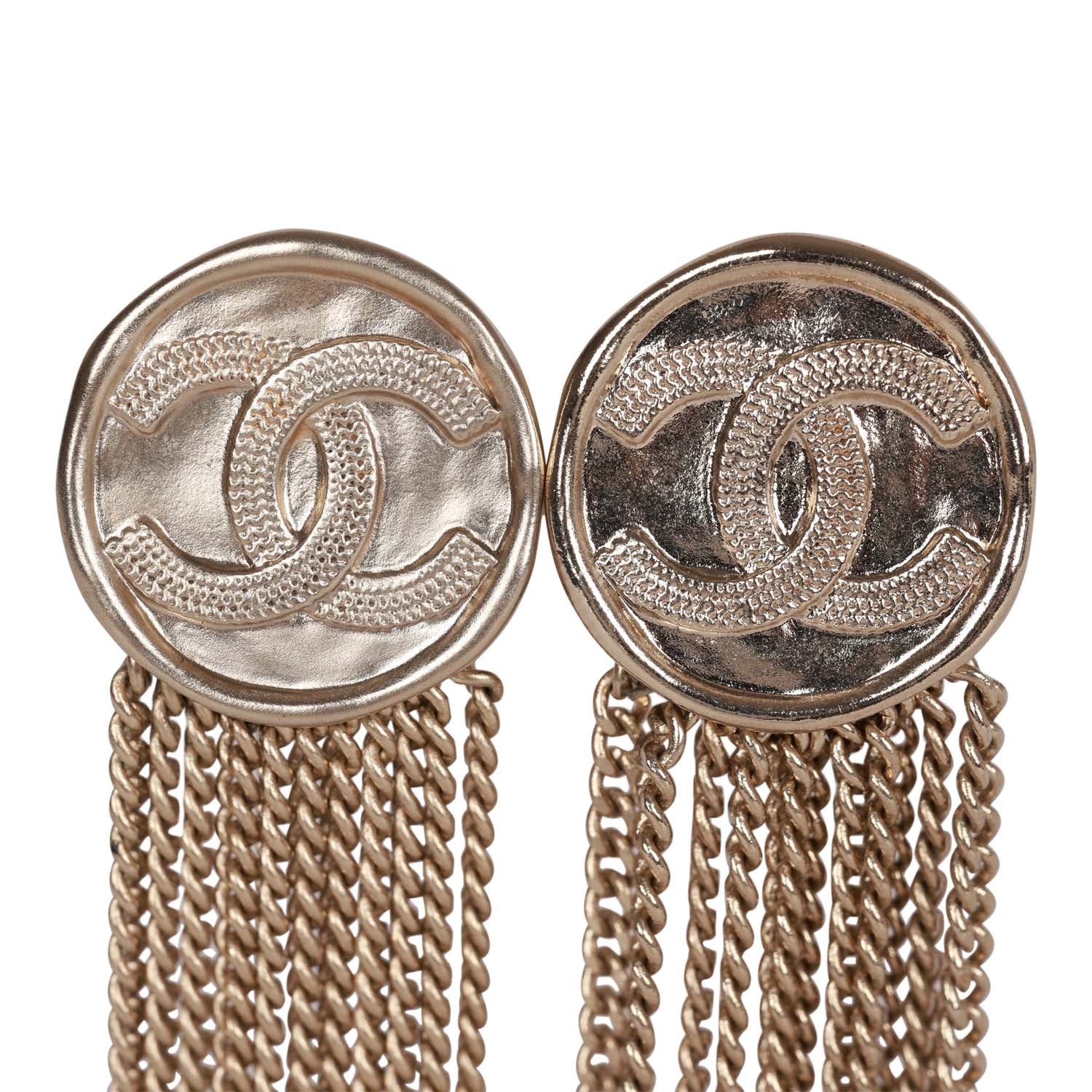 These 22A Chanel light gold earrings feature a classic "CC" logo stamped earring in a multichain duster design.