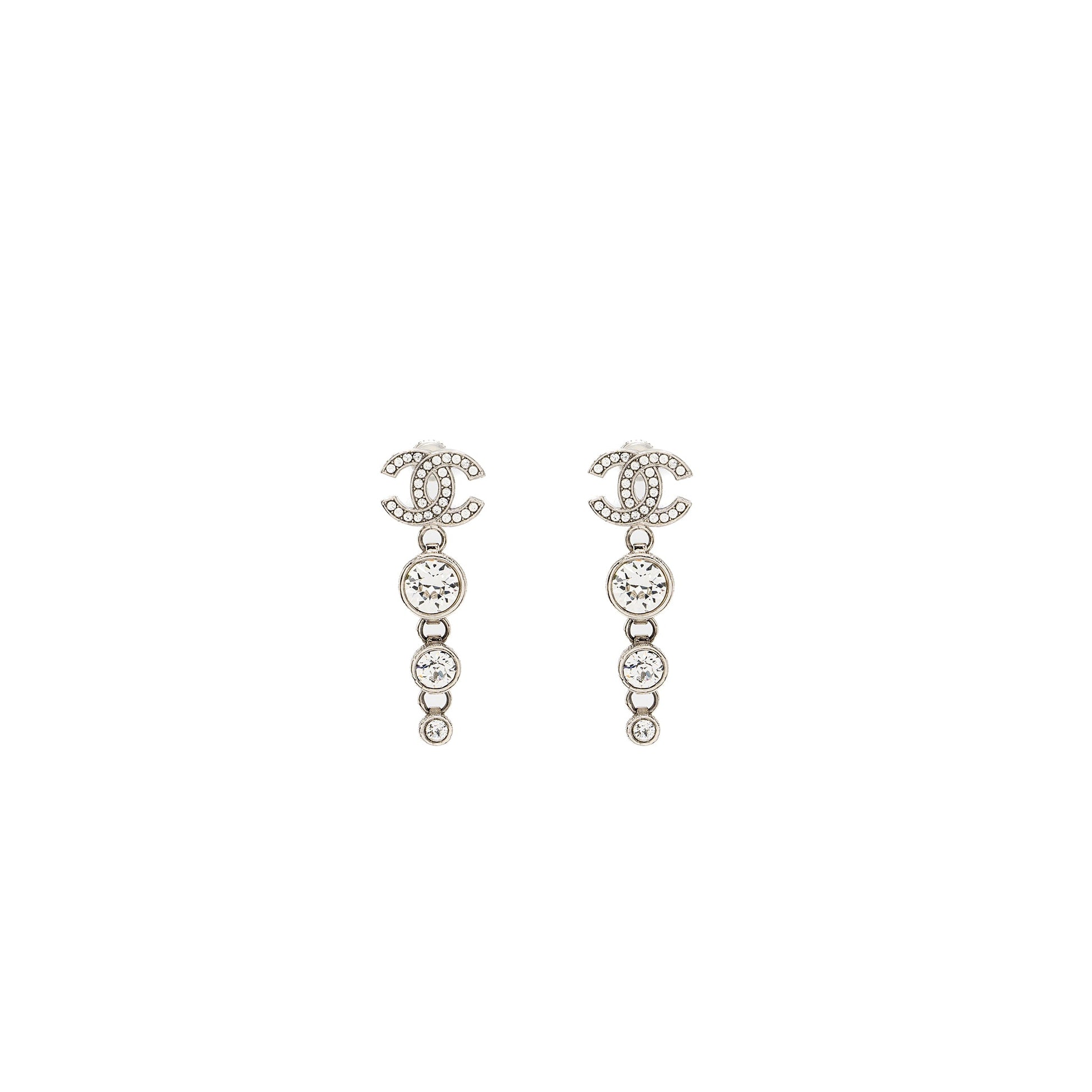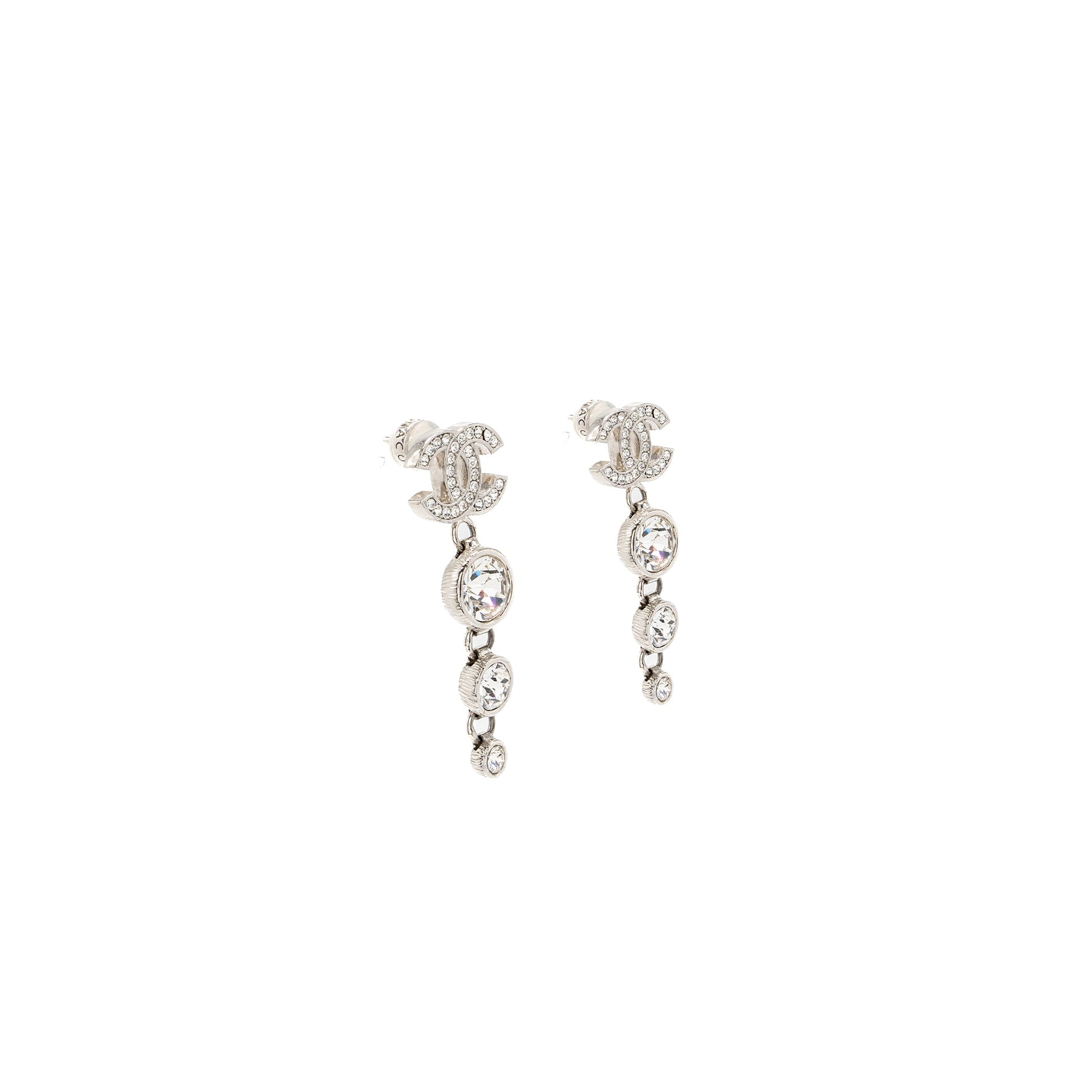 Chanel CC Logo Crystal Drop Earring Silver Tone