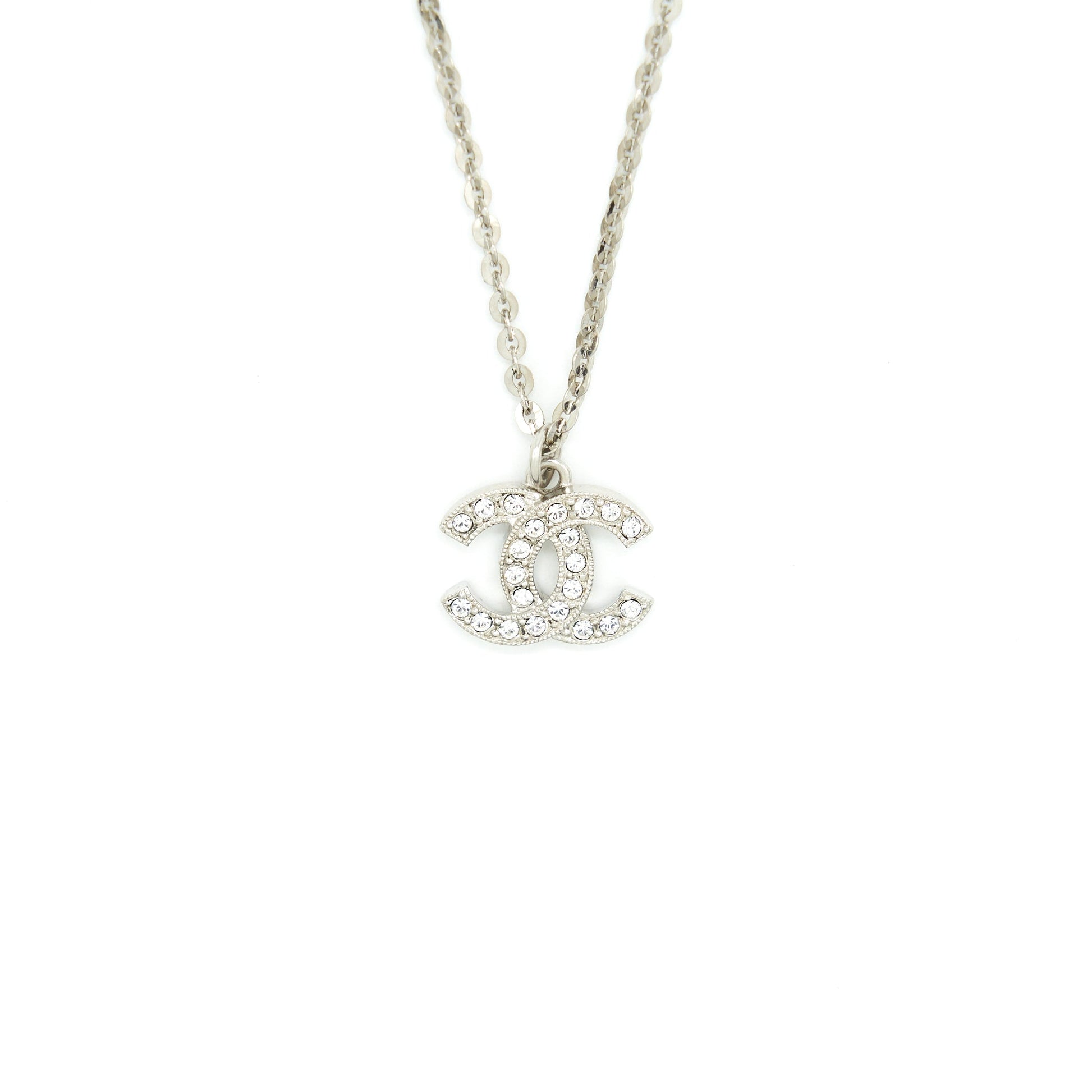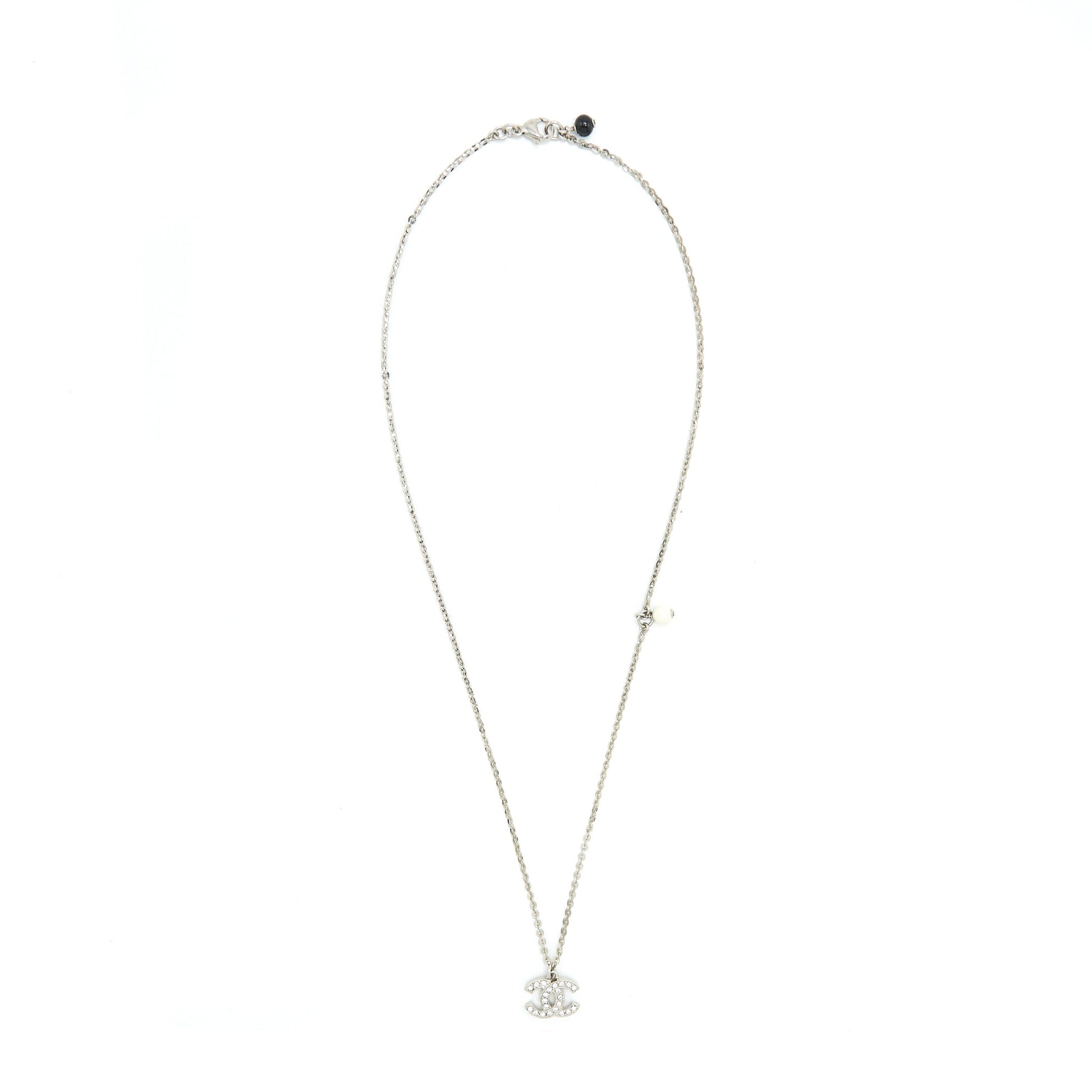 Chanel CC Logo Crystal Necklace Silver Tone