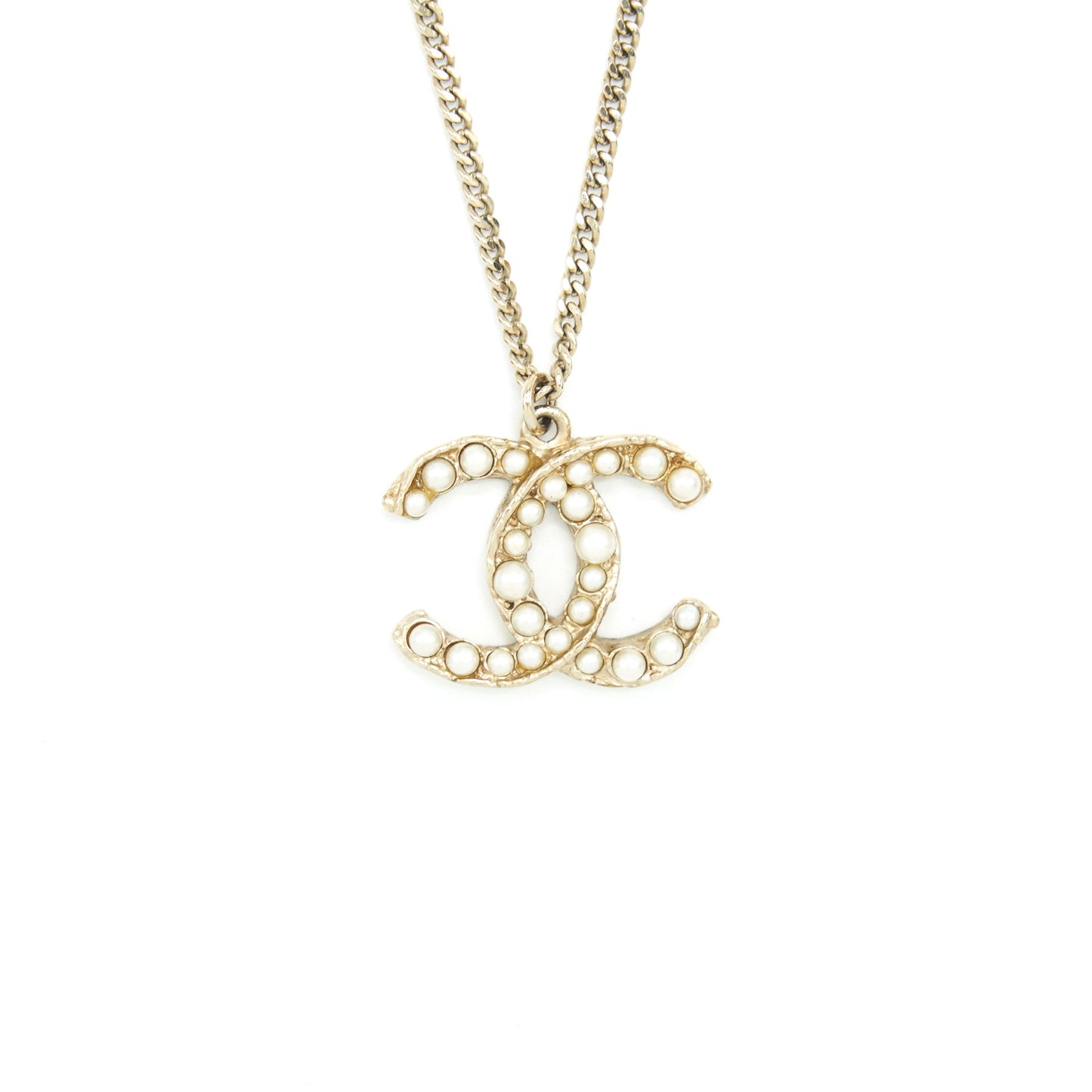 Chanel CC Logo Necklace Light Gold Tone With Pearl Design