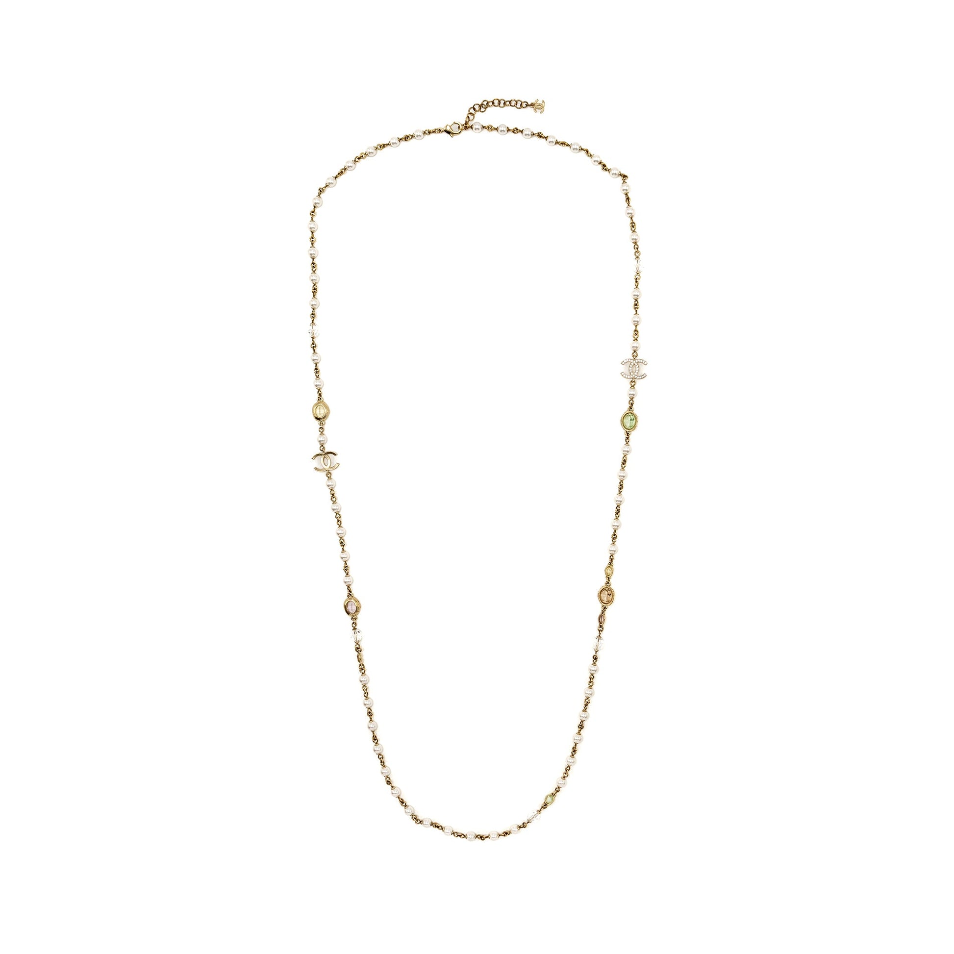 Chanel CC Logo/Pearl/Crystal Long Necklace Light Gold Tone