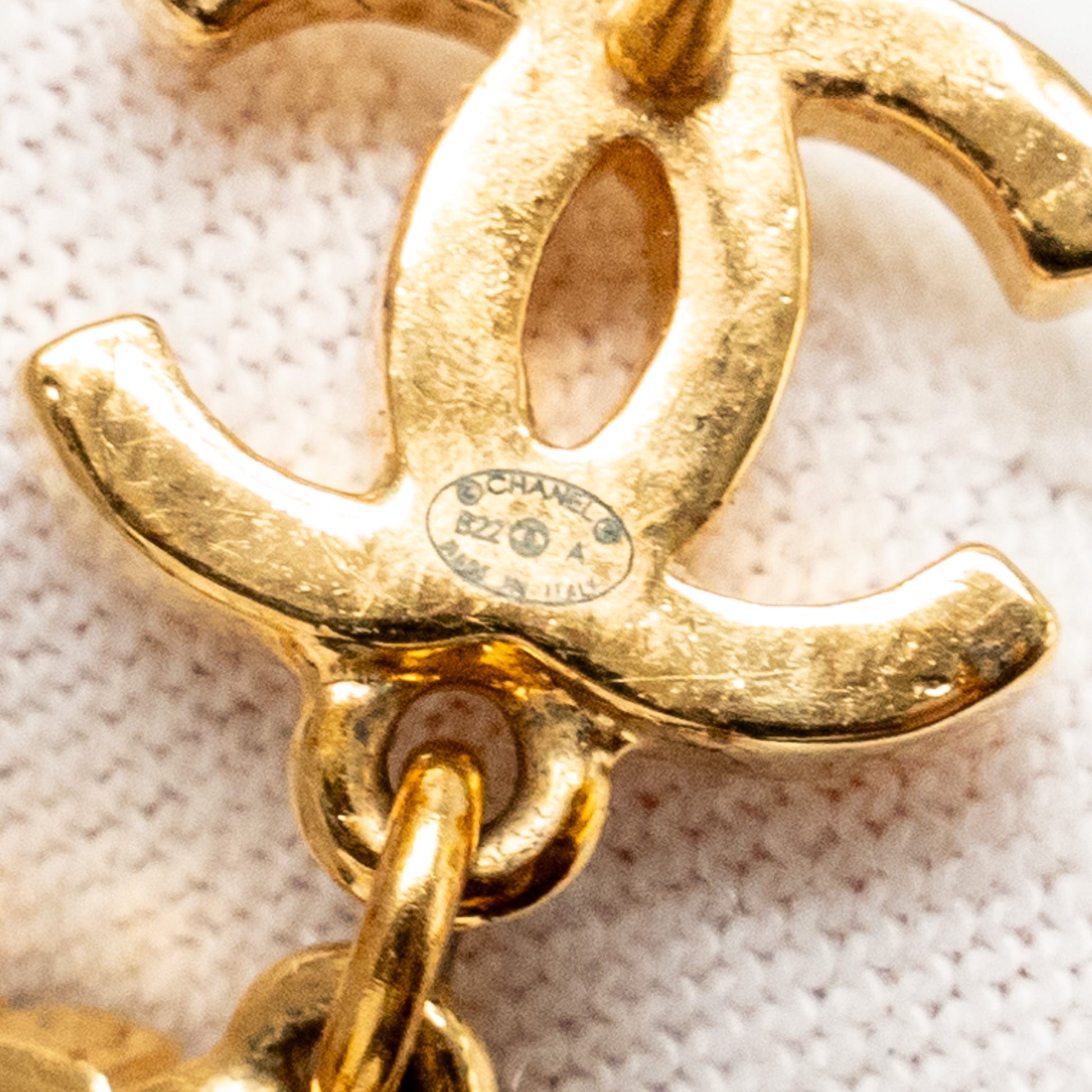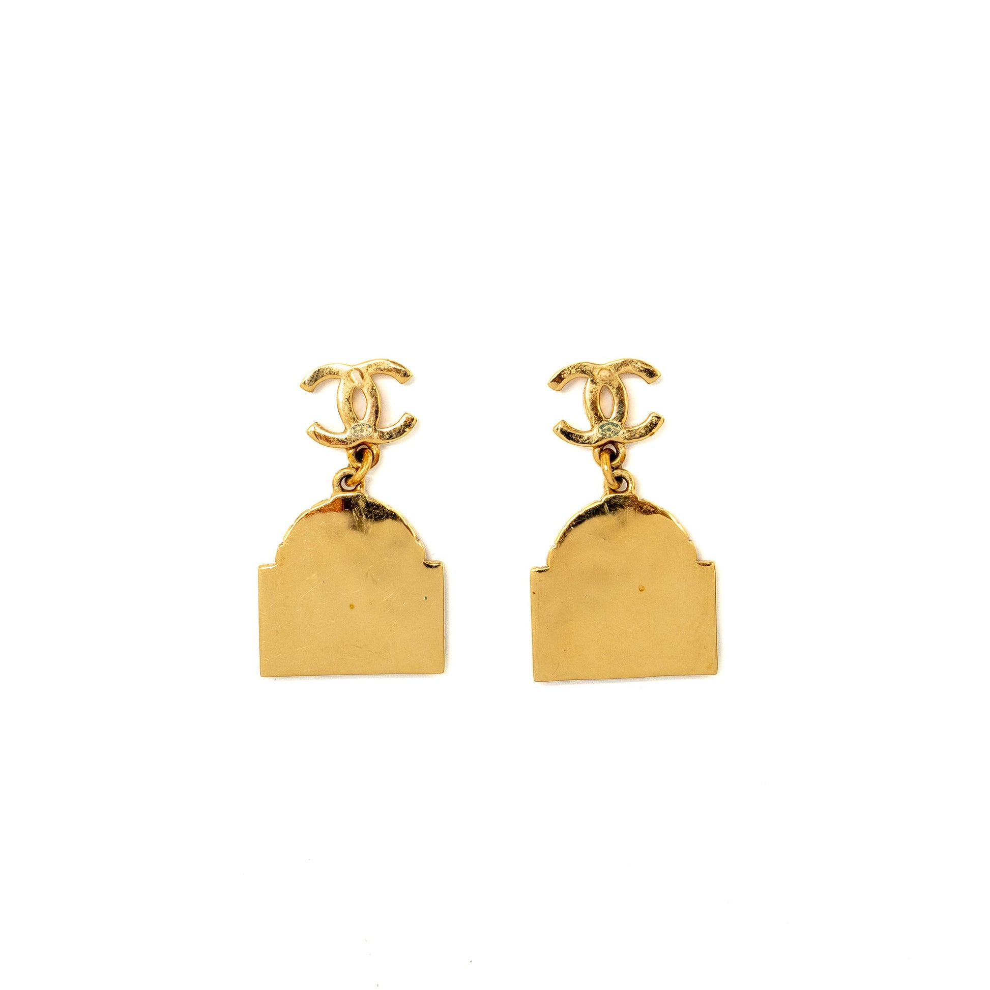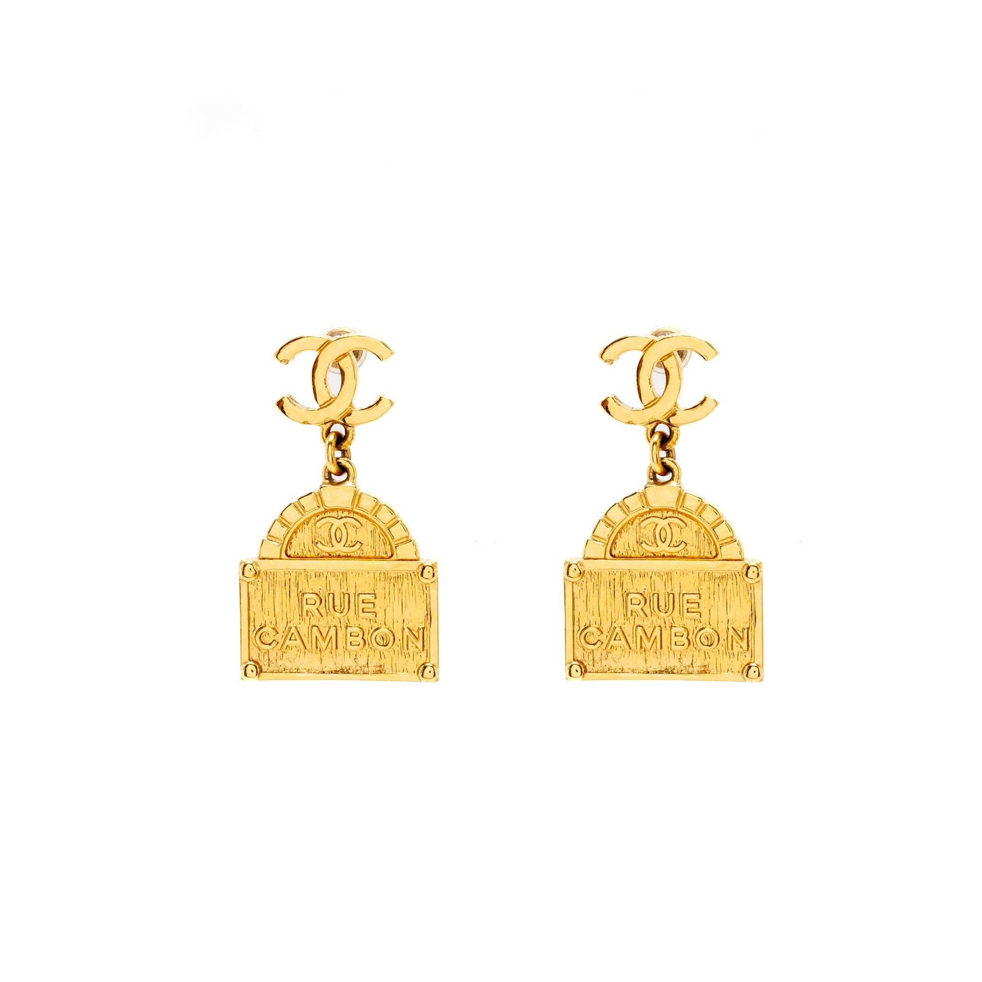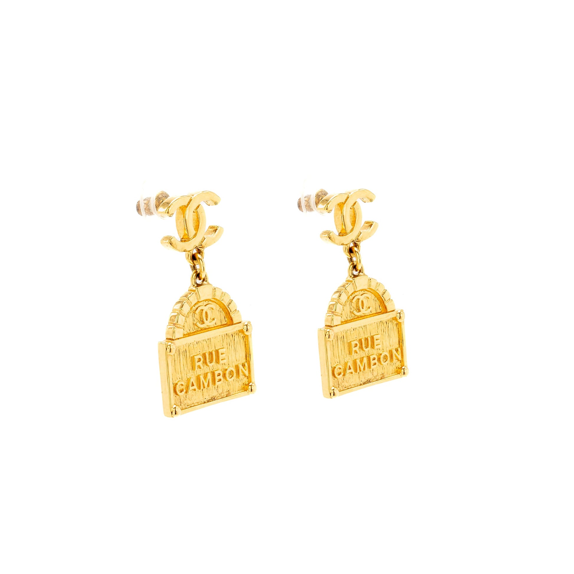 Chanel CC Logo Rue Cambon Drop Earrings Gold Tone
