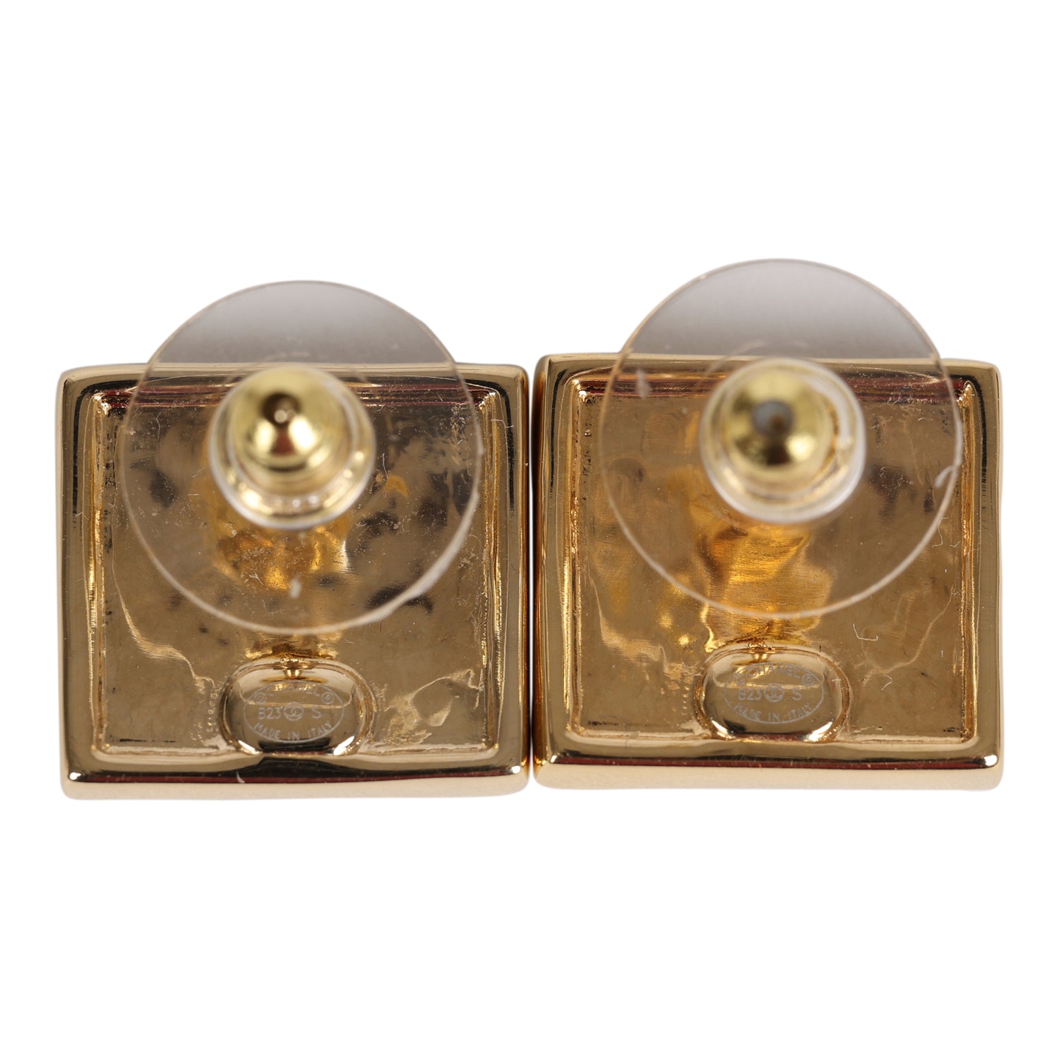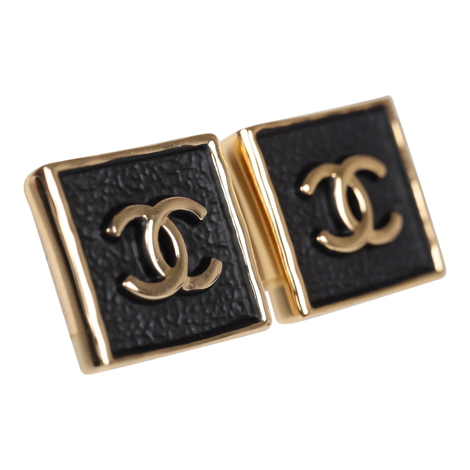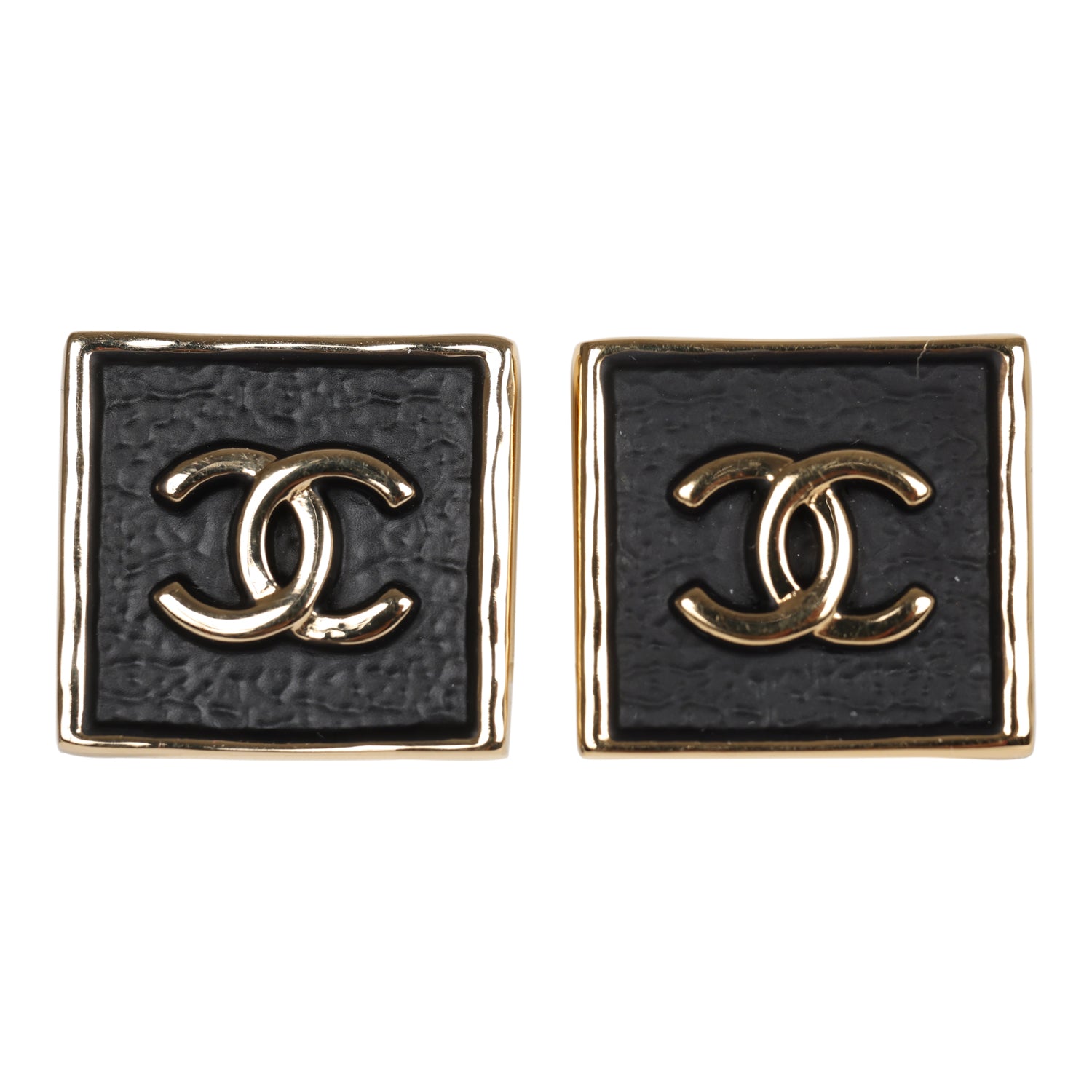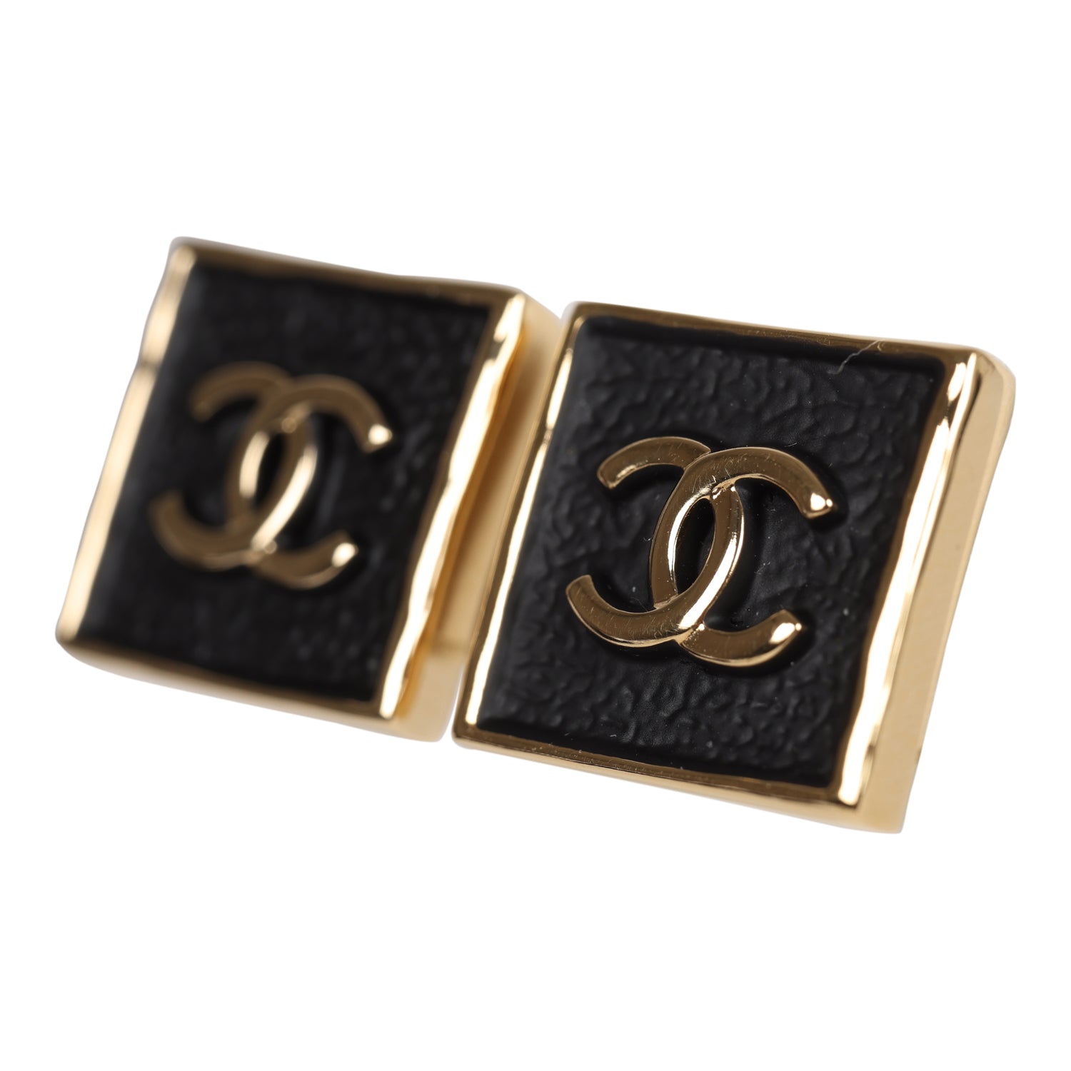 These Chanel CC Square Logo earrings are in Gold tone metal, feature a black textured leather inlayed with the gold tone CC logo on top, and post back earring closure.