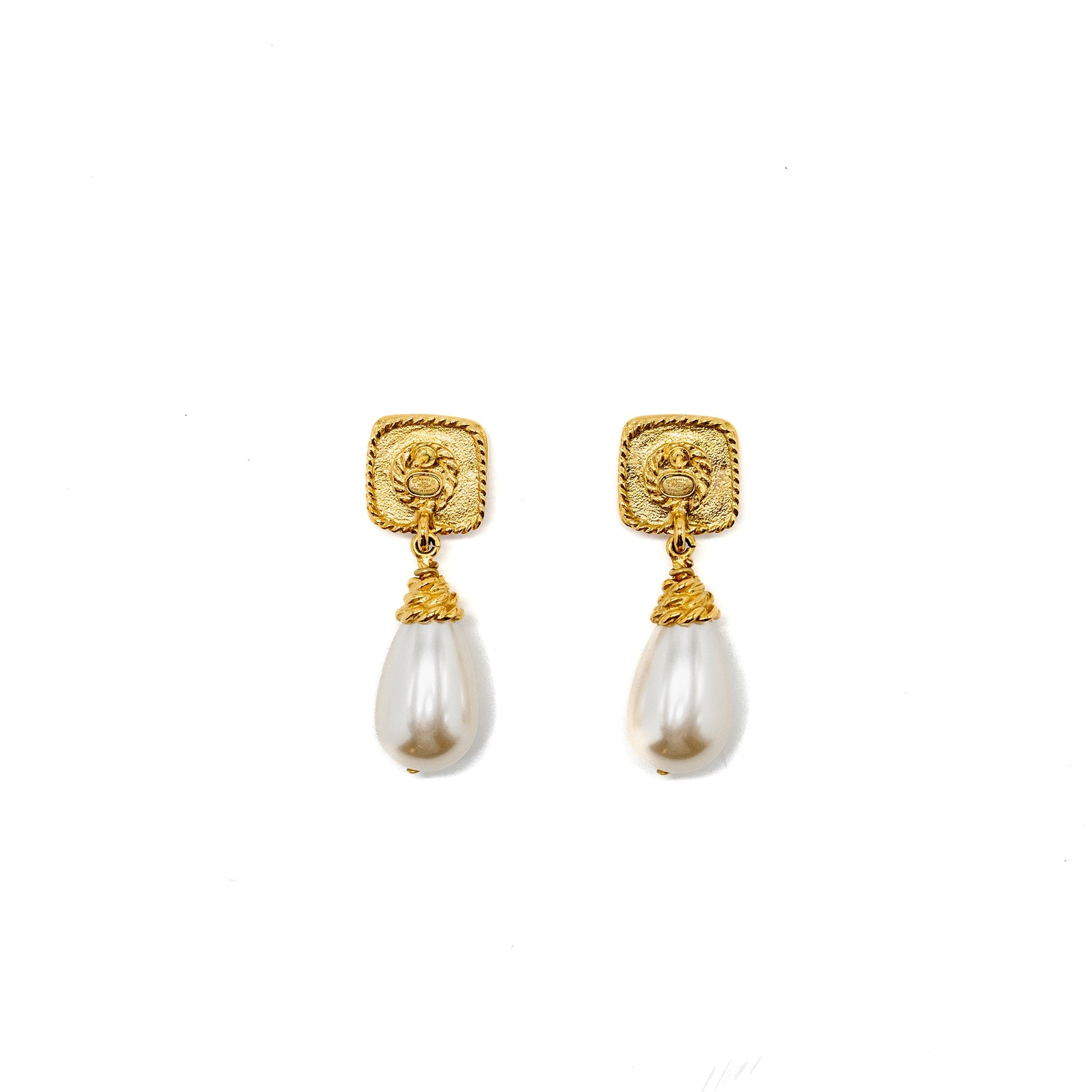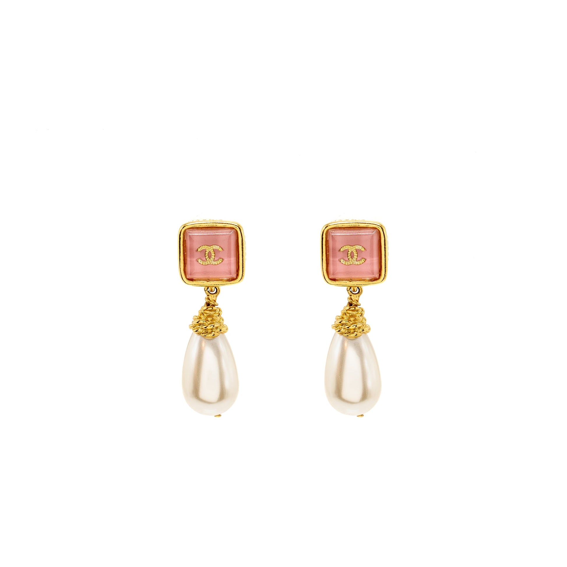 Chanel CC Logo Square with Pearl Drop Earrings Peach Gold Tone