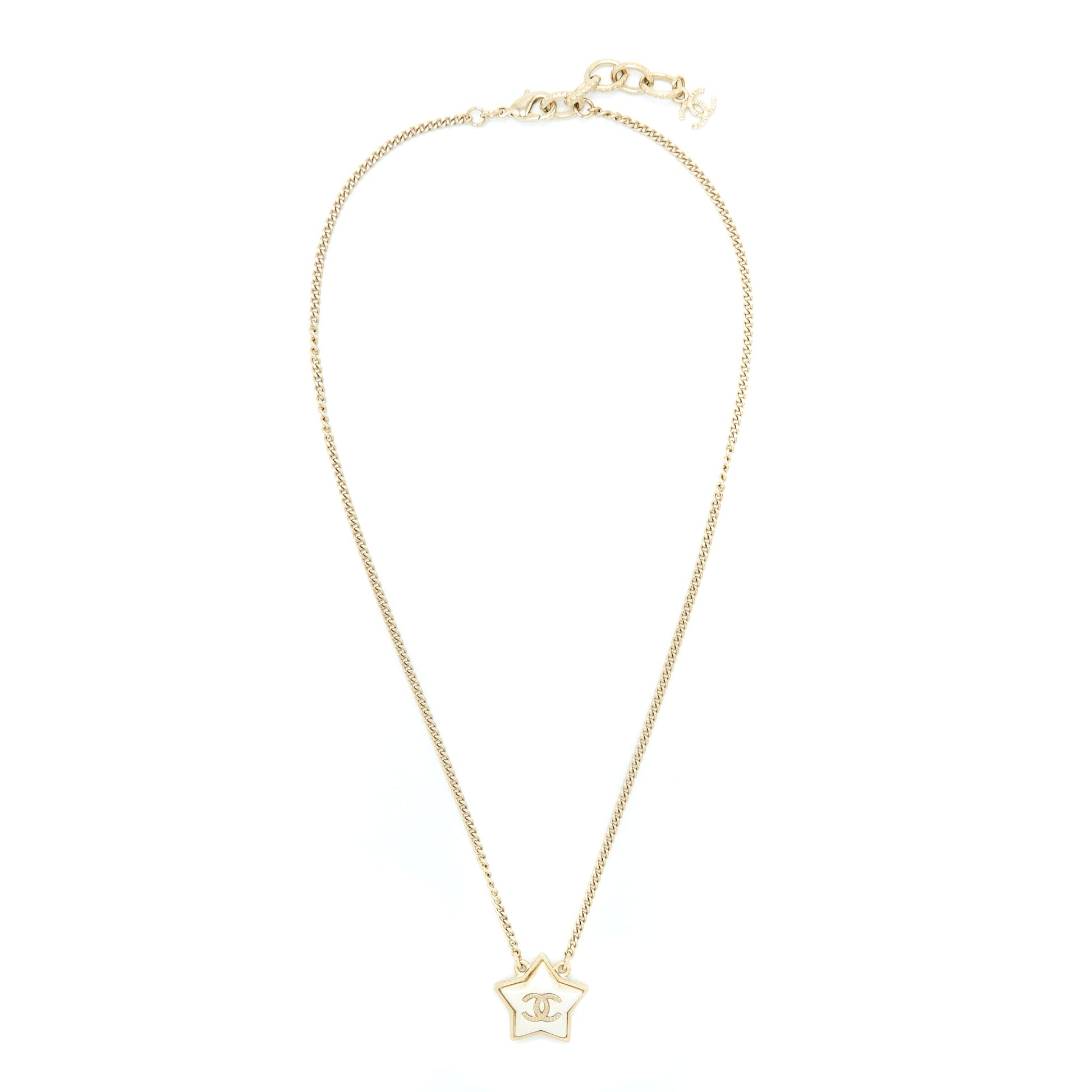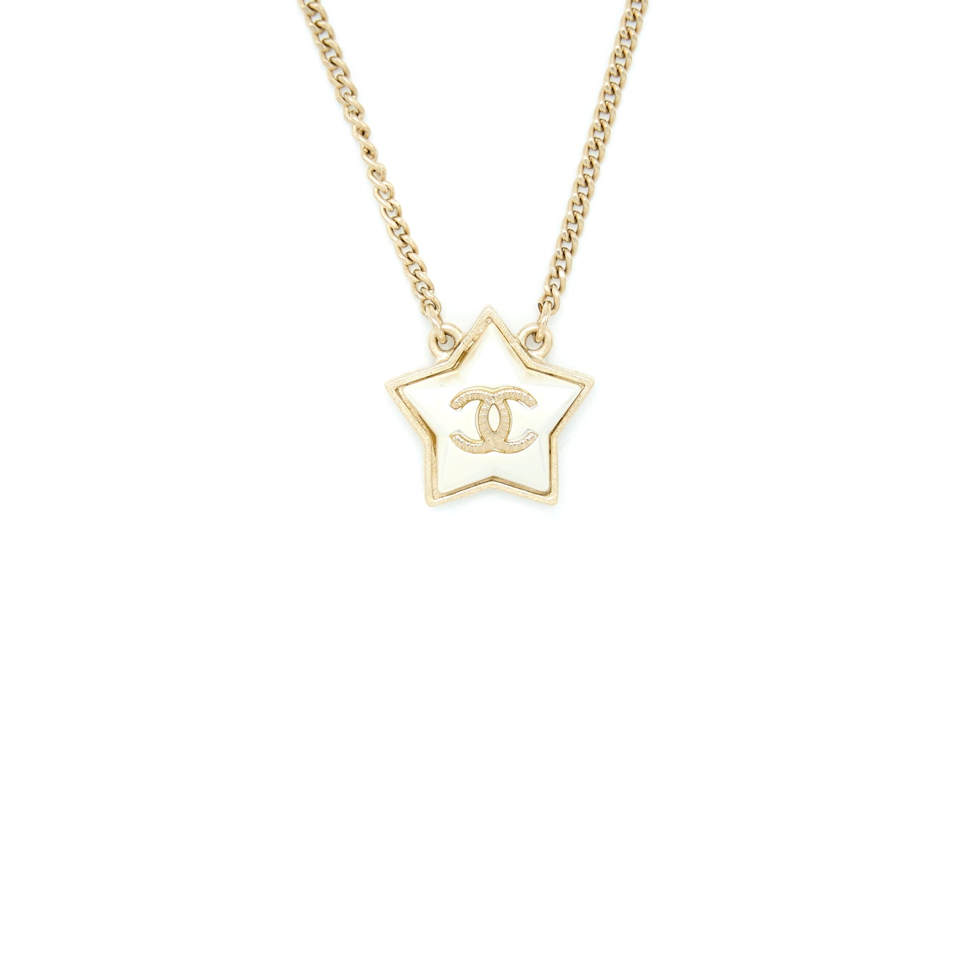 Chanel CC Logo Star Necklace White Light Gold Tone