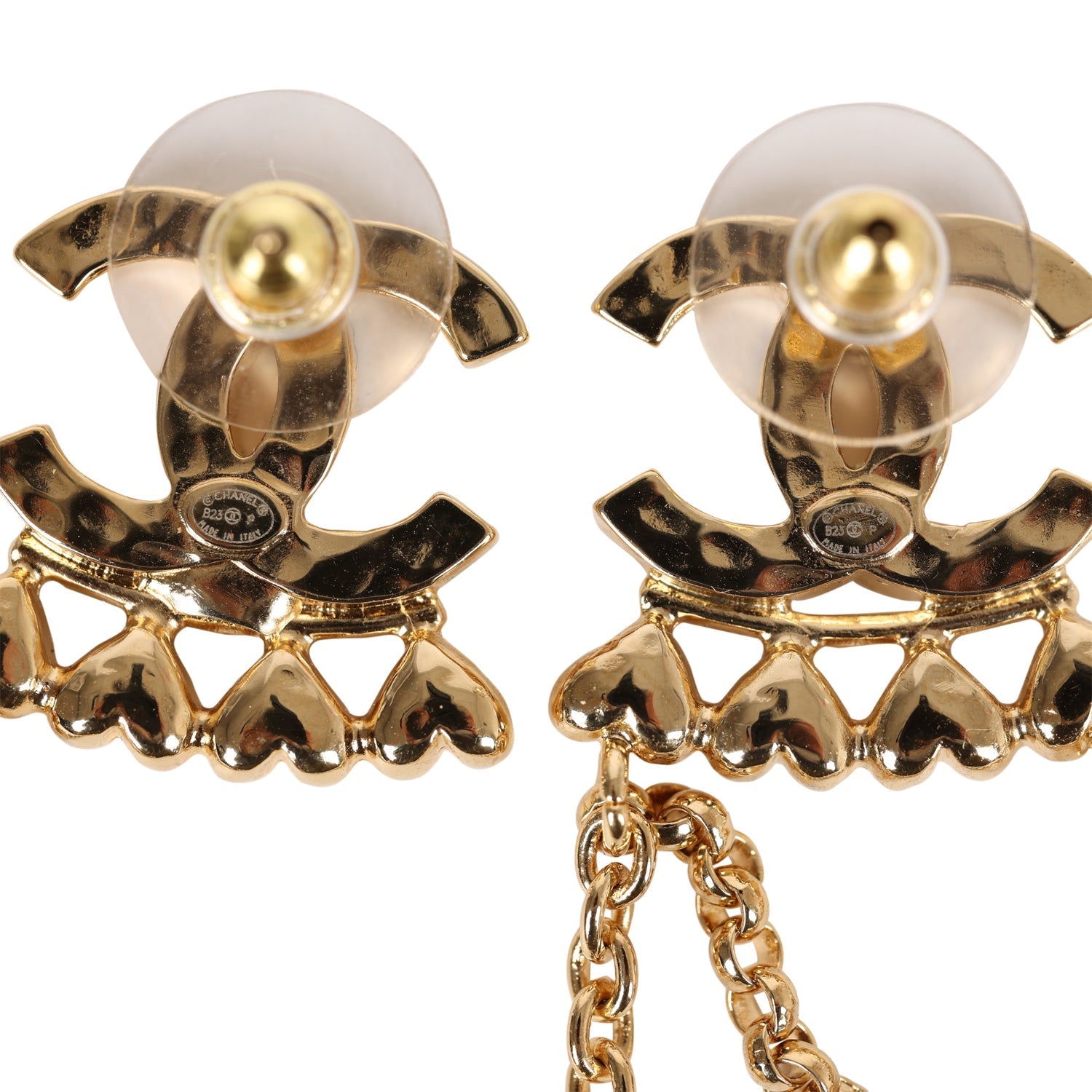These Chanel CC Dangle Ear Cuff Earrings are in Rhinestone and Gold tone hardware, both earrings have a rhinestone CC sitting atop a cluster of upside down hearts with a dangling chain.