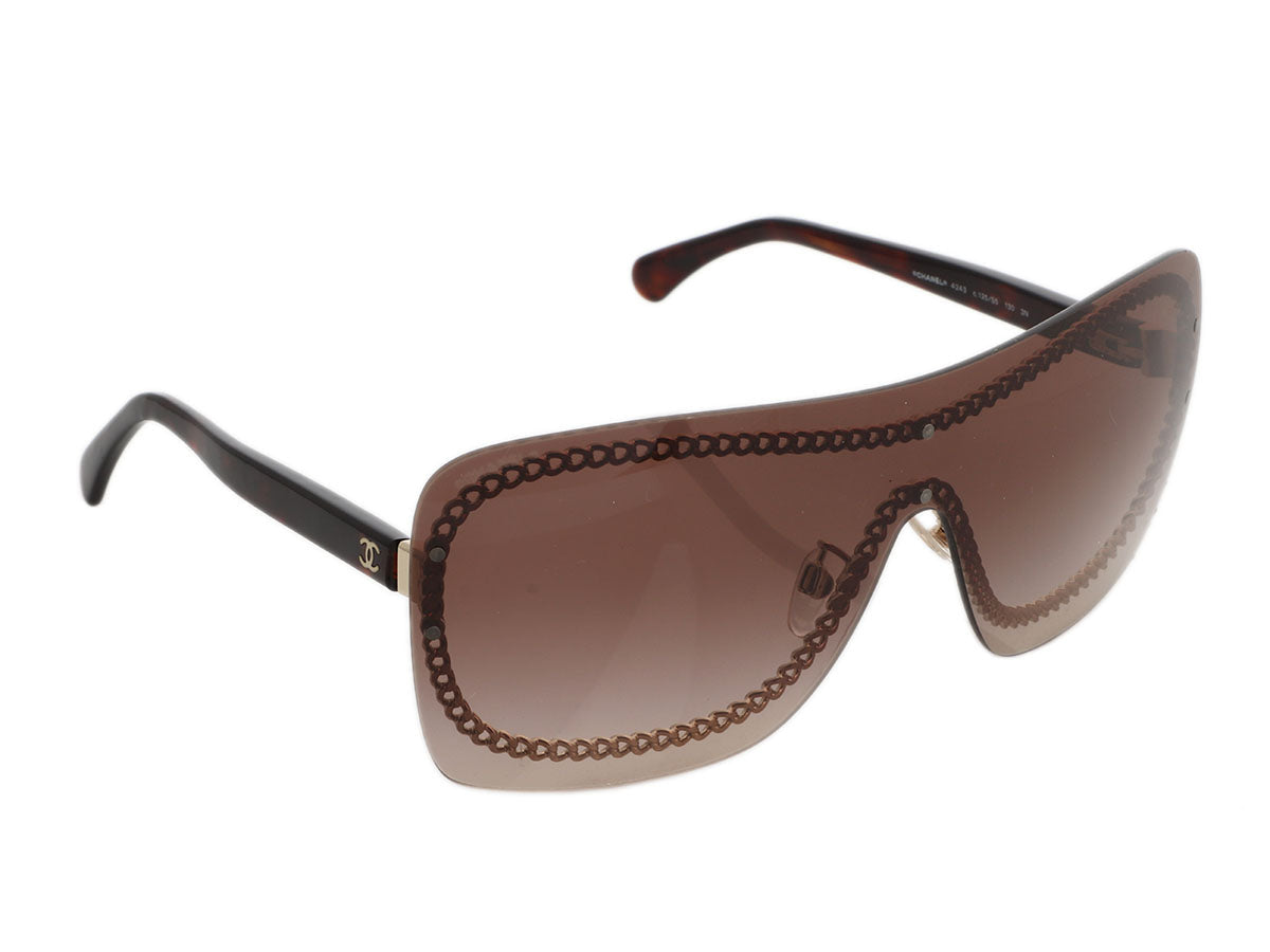 Chanel’s Chain Shield Sunglasses are a standout pair of shades! The shield lenses are graduated amber trimmed on the inside with gold chain, while the arms are semi-transparent tortoise with tiny CCs at the temples. In very good condition, the lenses have light scratches and there’s a scuff on the edge. They’re distinctive with stylish details!