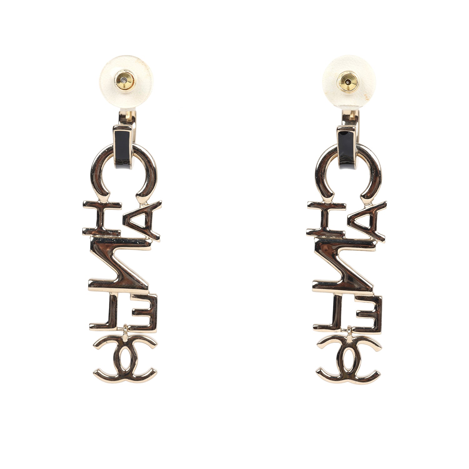 Chanel "Chanel" Letter Drop Earrings Black/White Enamel Light Gold Hardware