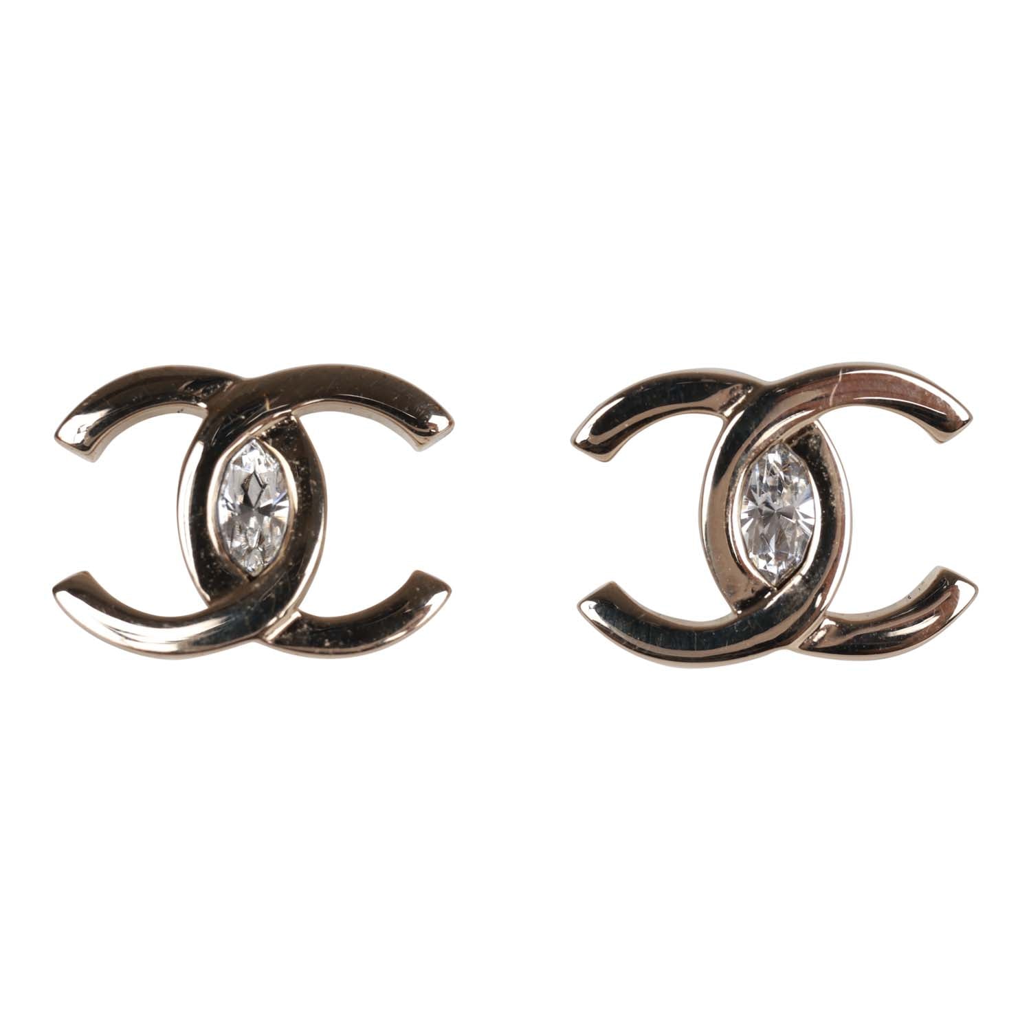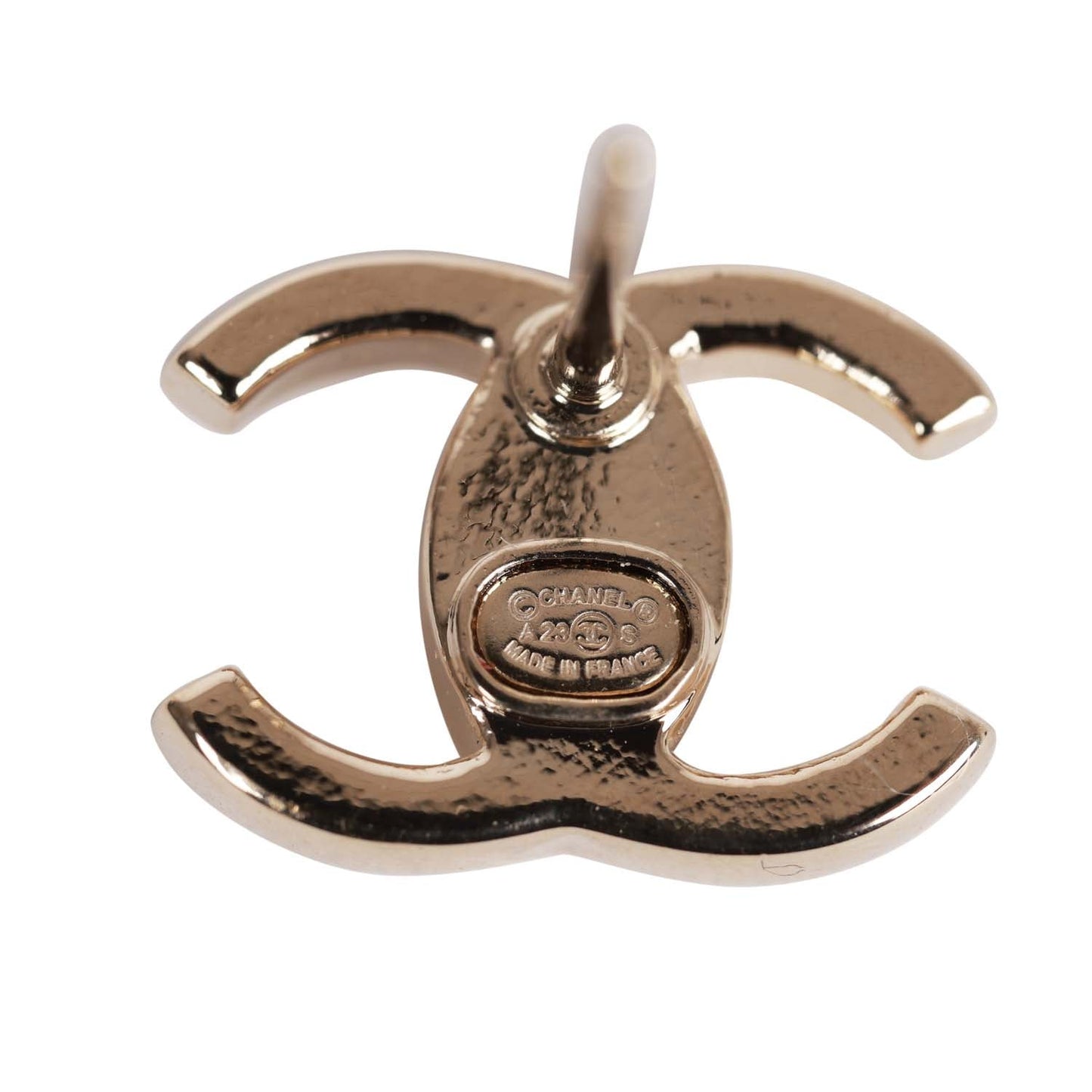 These Chanel "CC" Logo earrings are in light gold metal and feature faux crystal stones at the center.