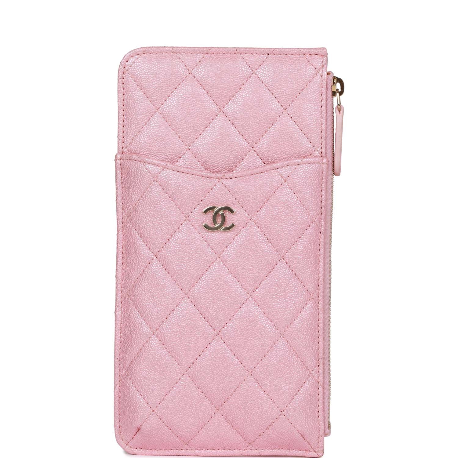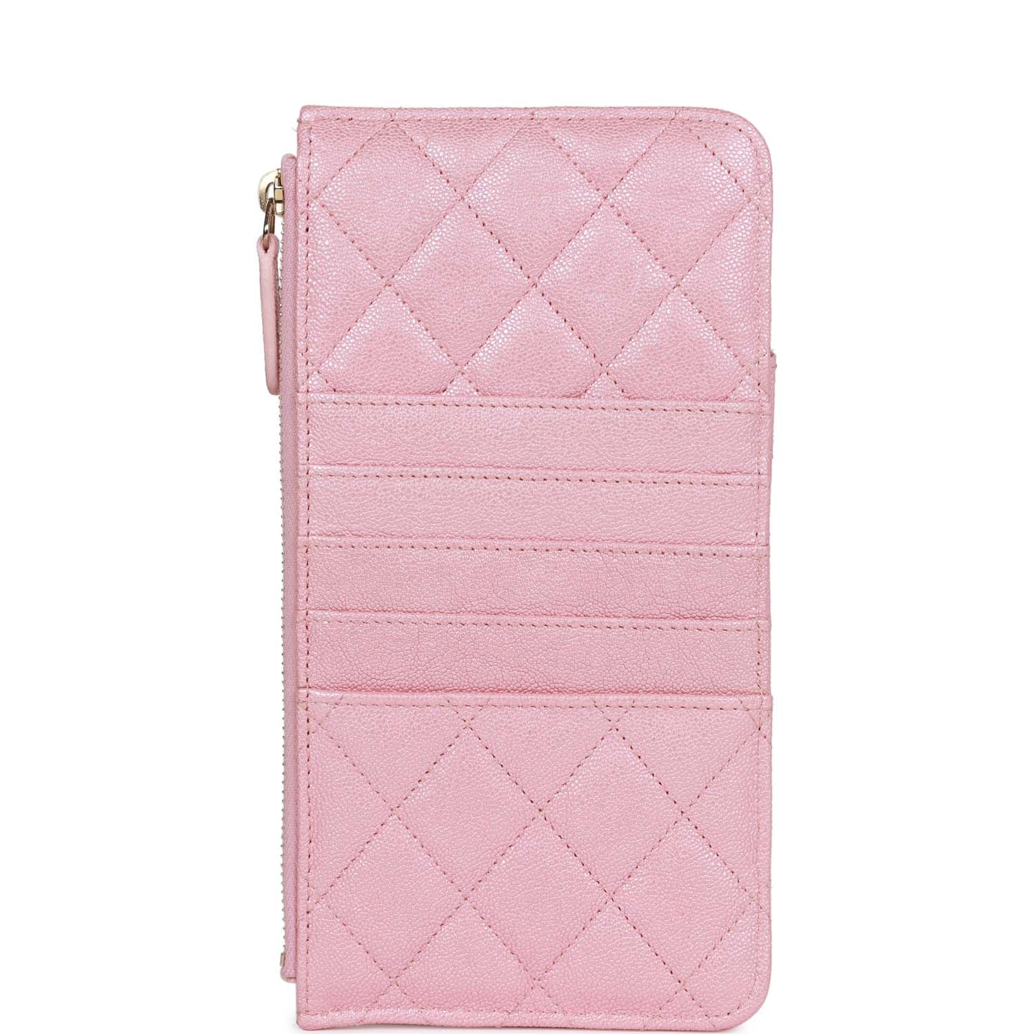 This wallet is in iridescent Pink caviar leather light gold hardware, featuring a classic CC logo, signature diamond quilting, front phone pocket, five exterior card slots on the rear side, a top zip closure, and a pink fabric interior.