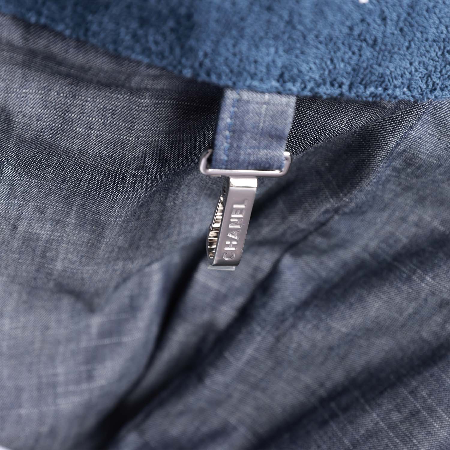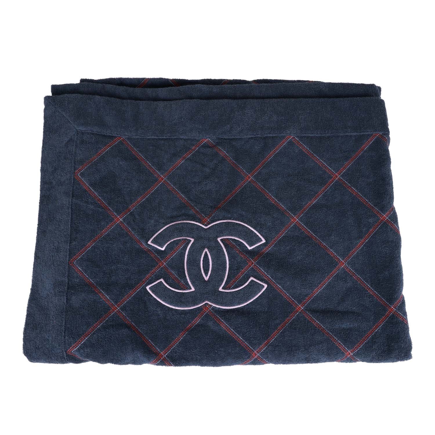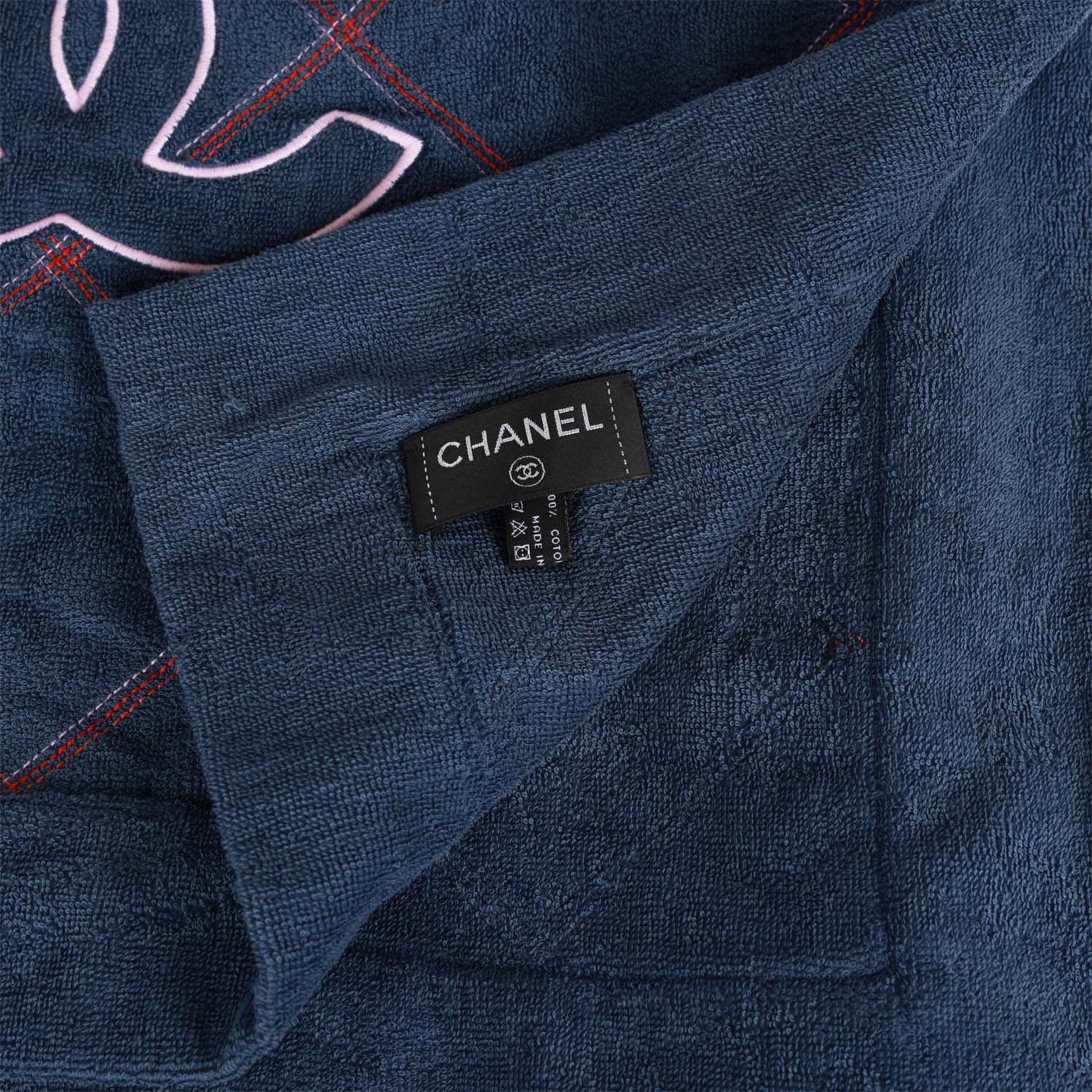 This Coco beach bag is made of navy terry cloth and features blue top handles, a large CC signature and Chanel logo on the front, removable pouch, towel and clip top closure.