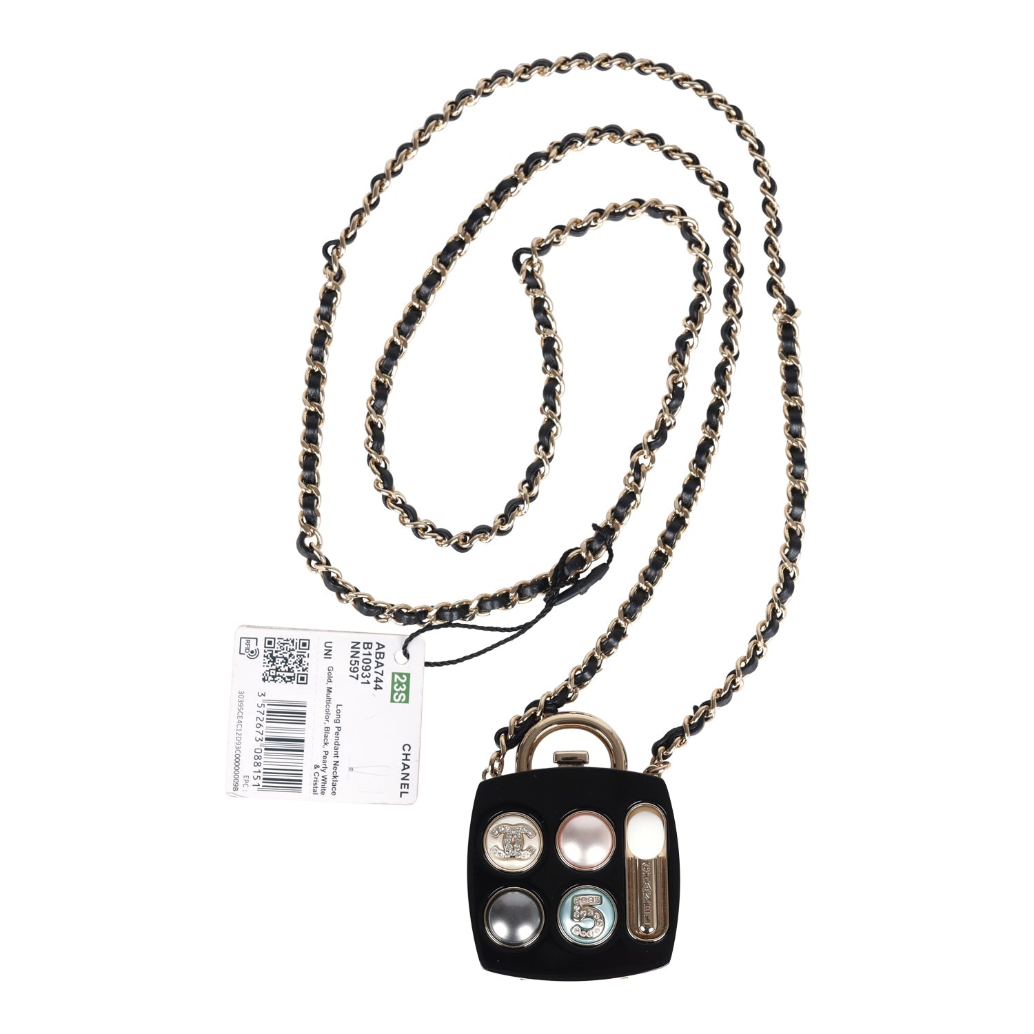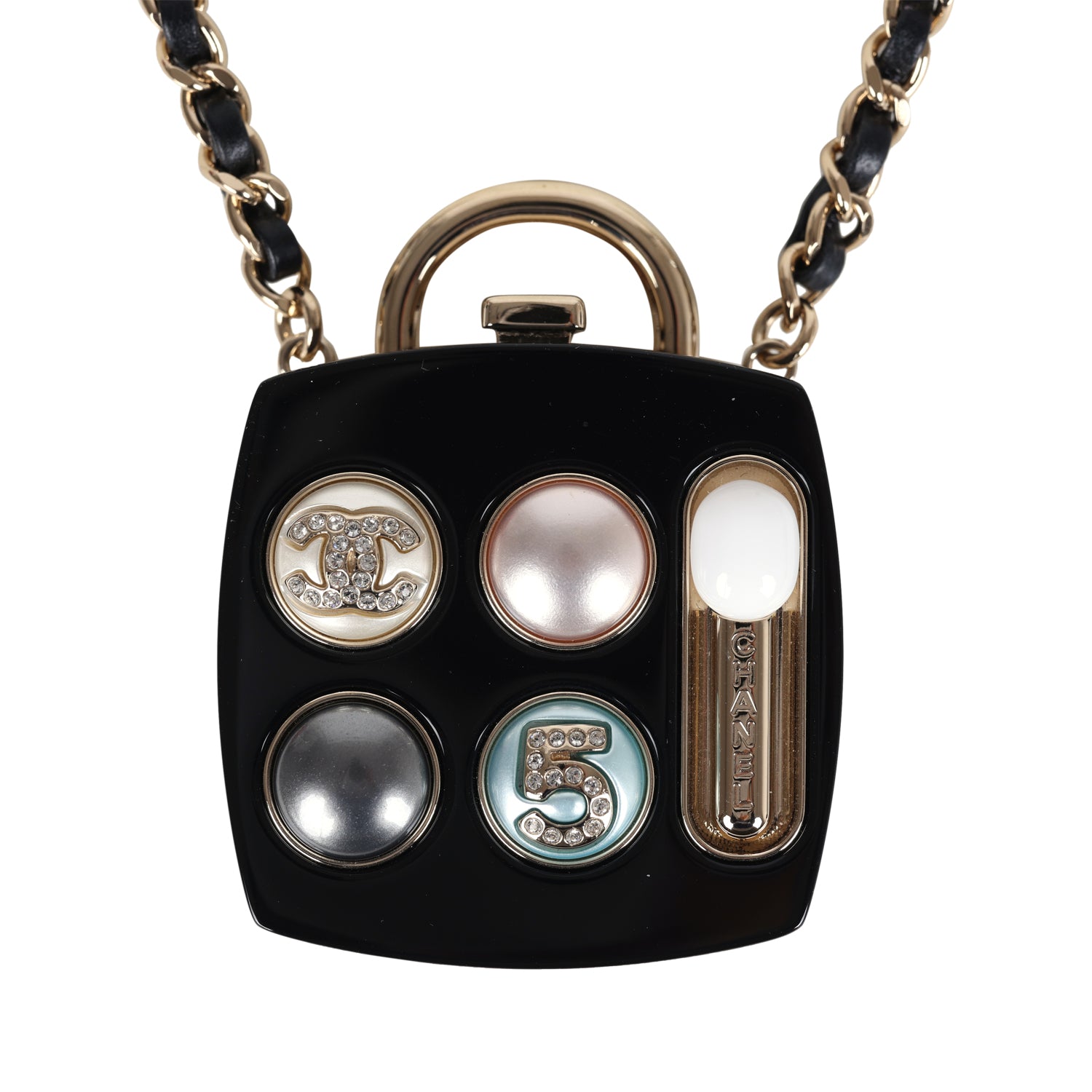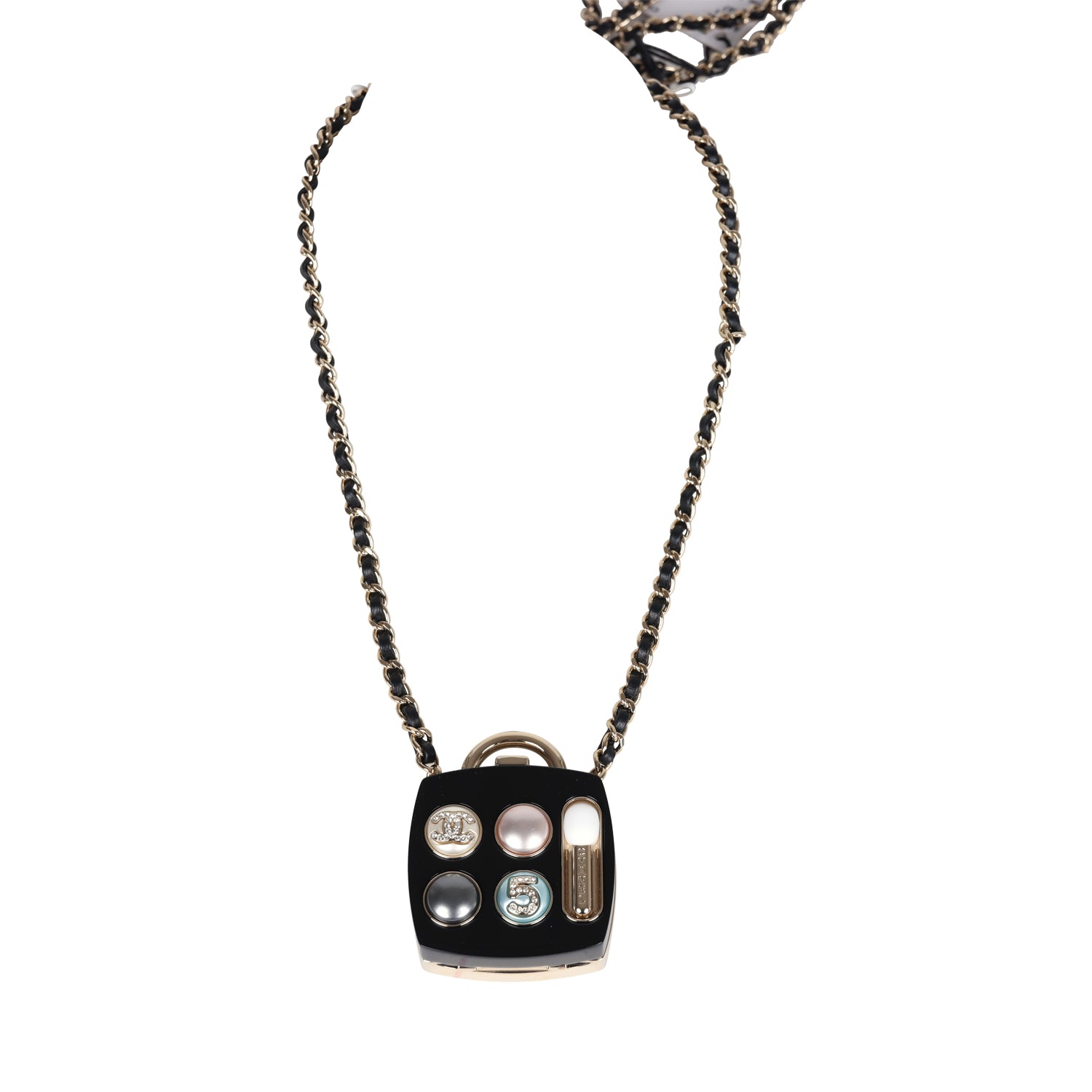 This Cosmetic Compact Pendant Long Necklace is in black resin and light gold tone hardware featuring an iconic CC No 5 "Eyeshadow Palette" crafted of multicolored faux pearls and faux crystals and opens to a compact mirror on one side. It has a long interwoven black leather and light gold tone chain link necklace that is connected to the compact charm pendant.