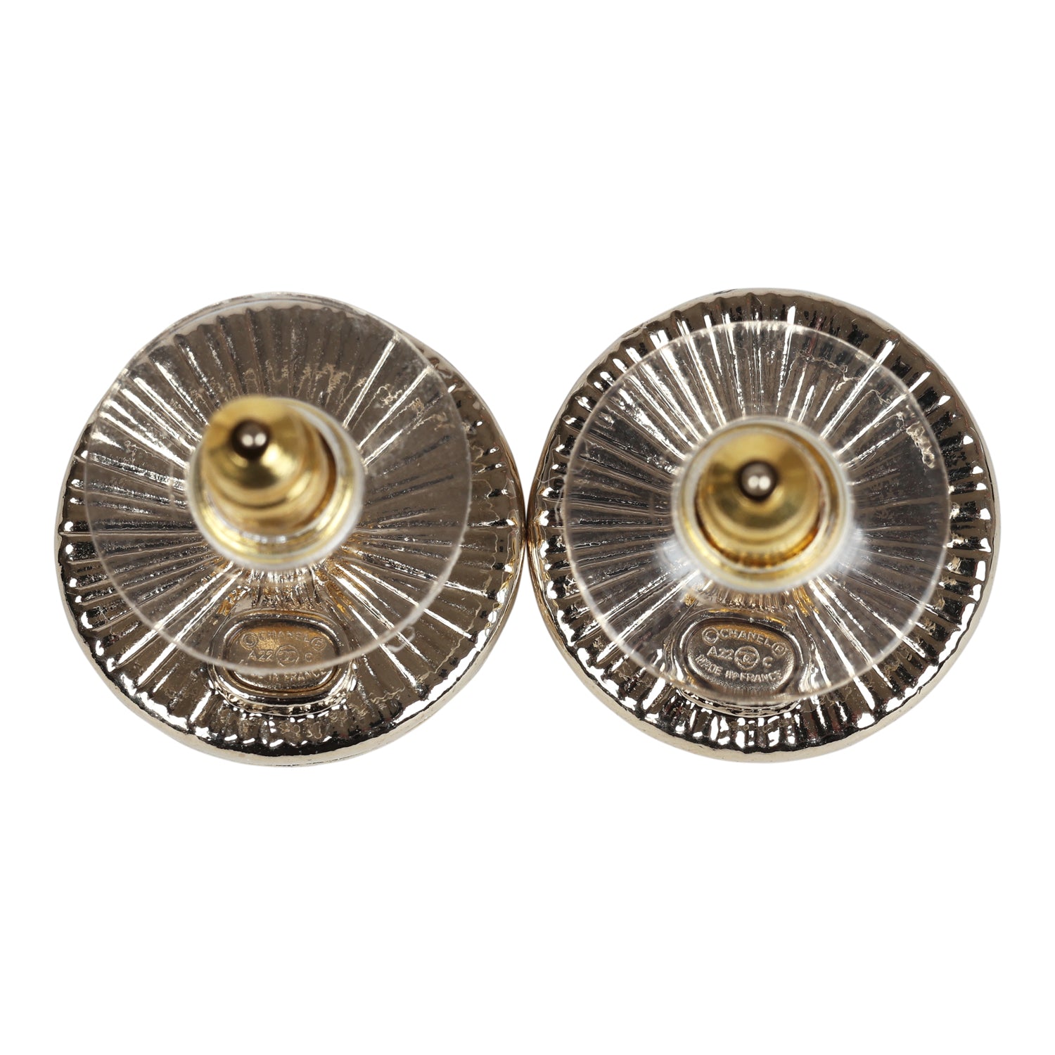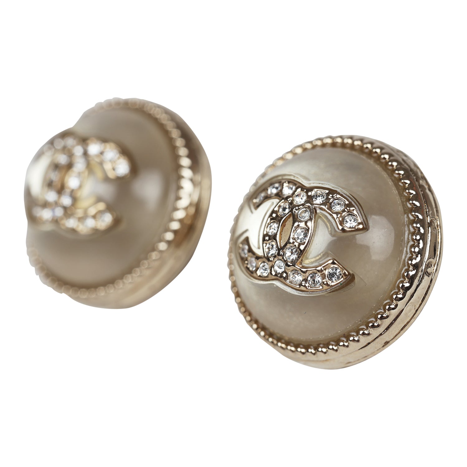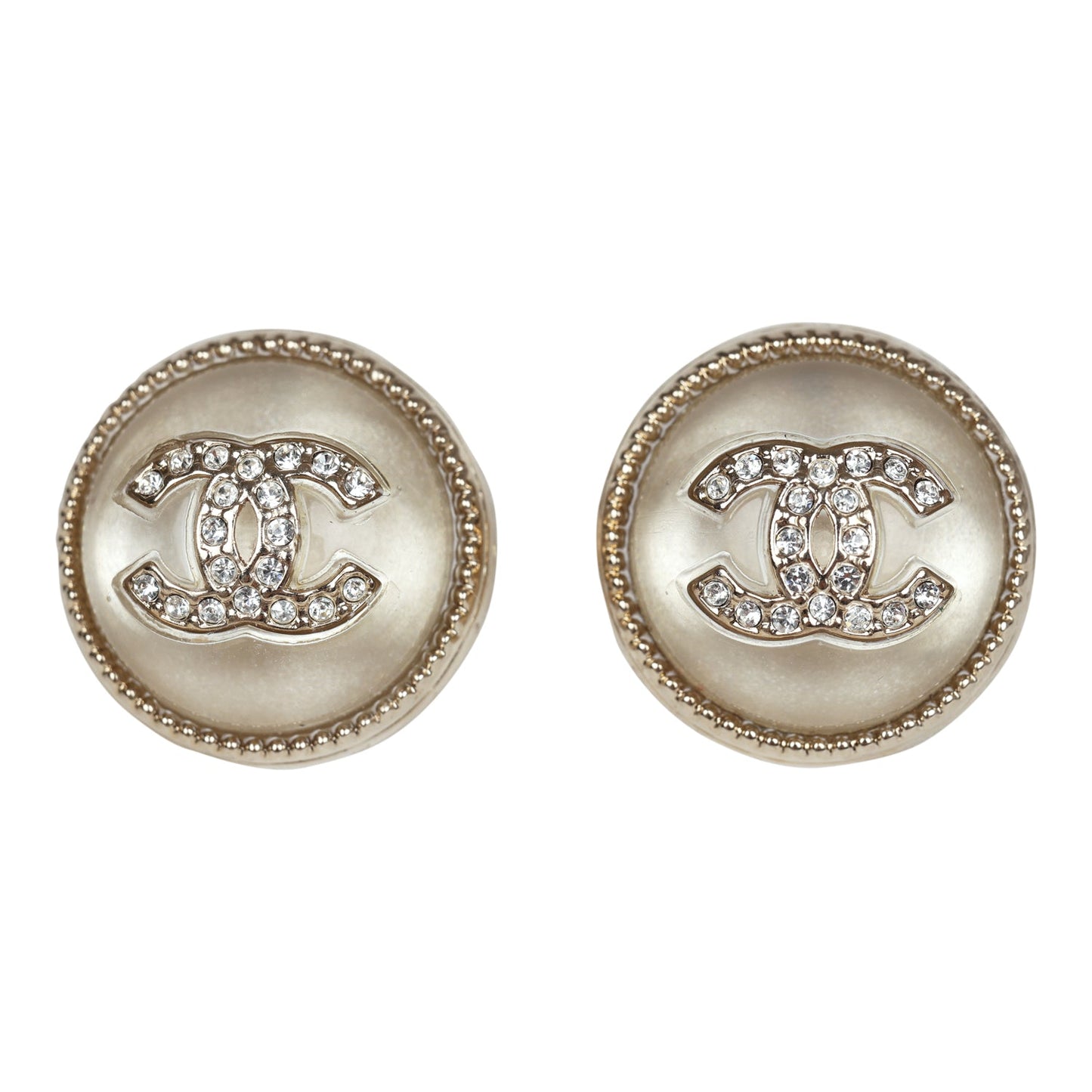 Chanel Crystal CC Round Pearl Button Earrings Light Gold Hardware