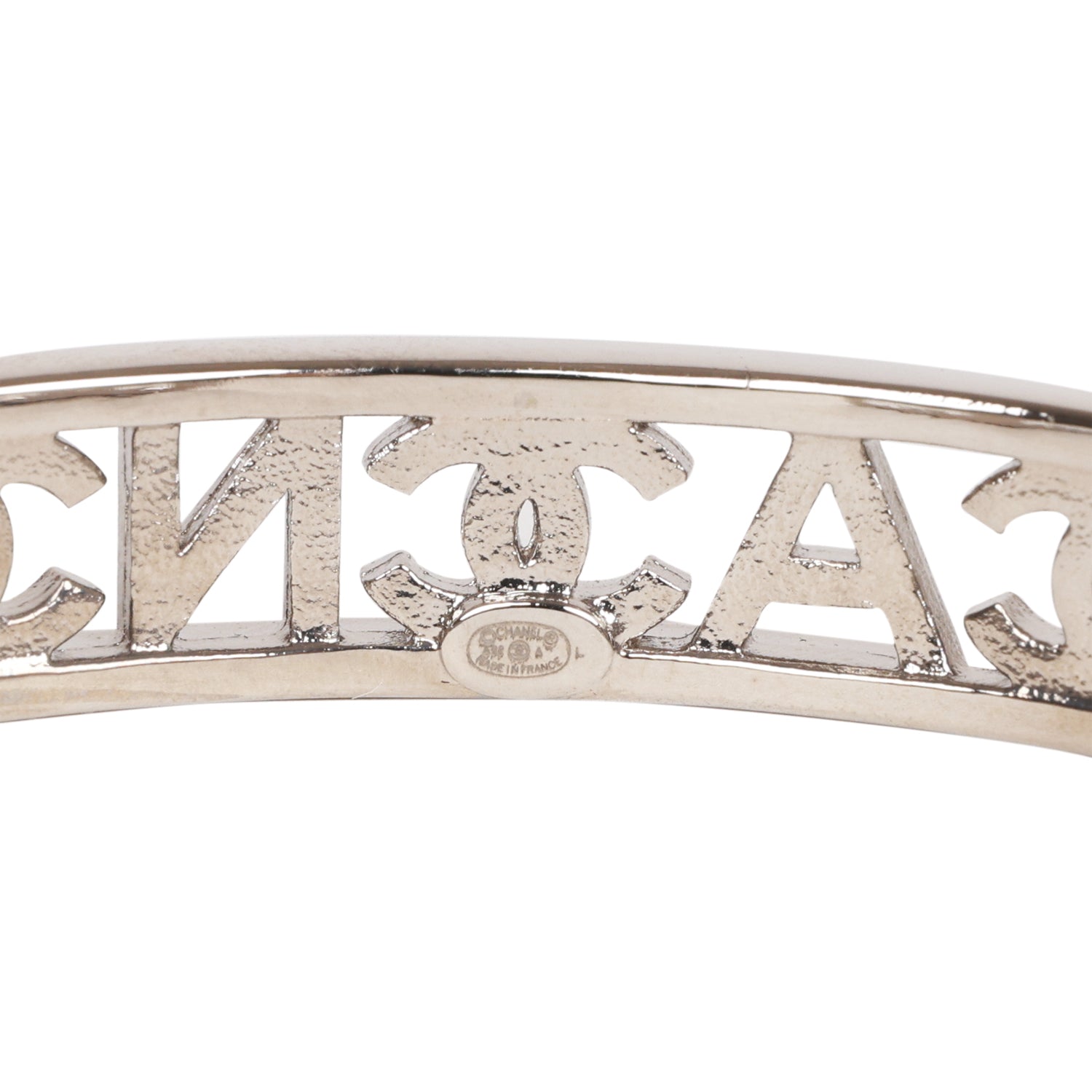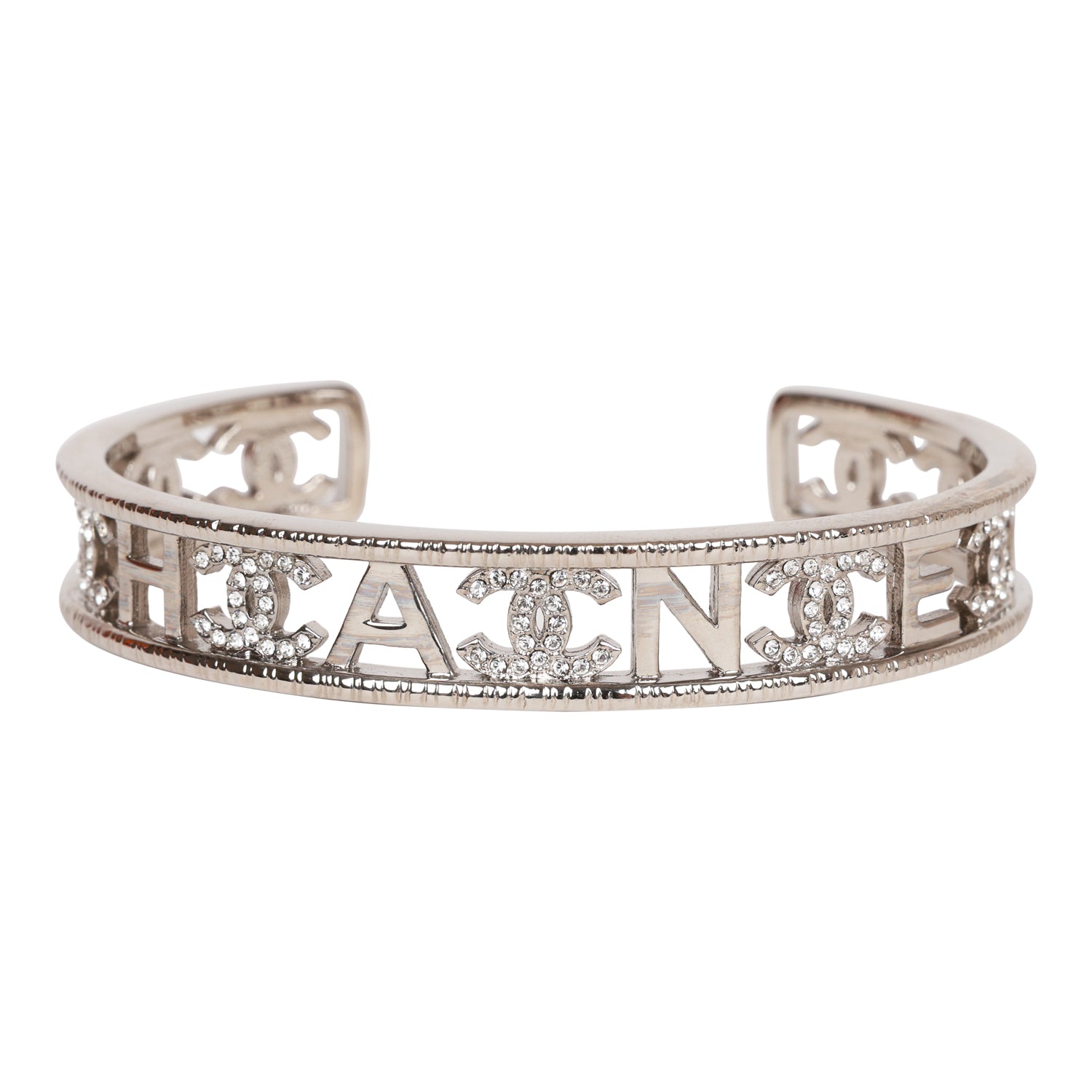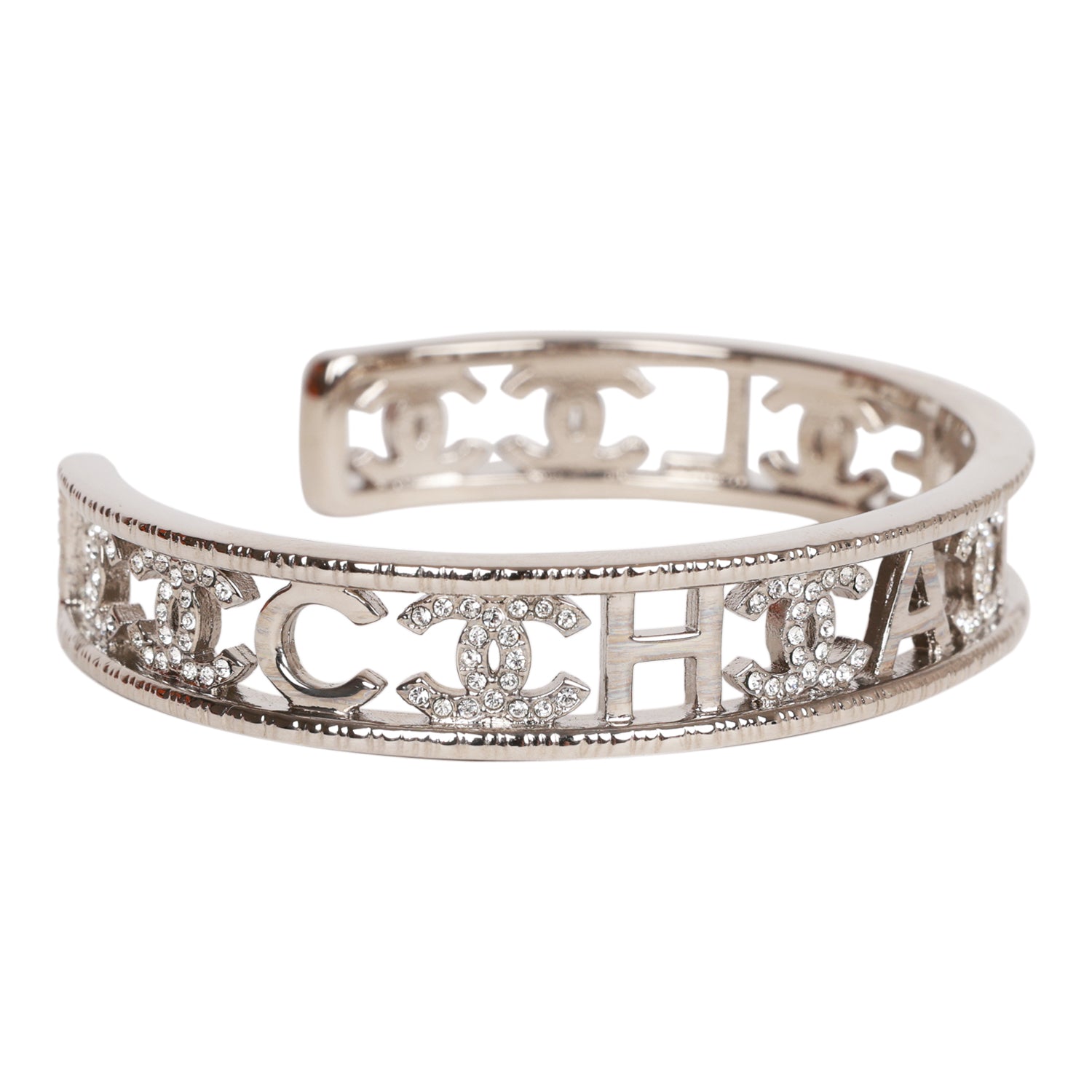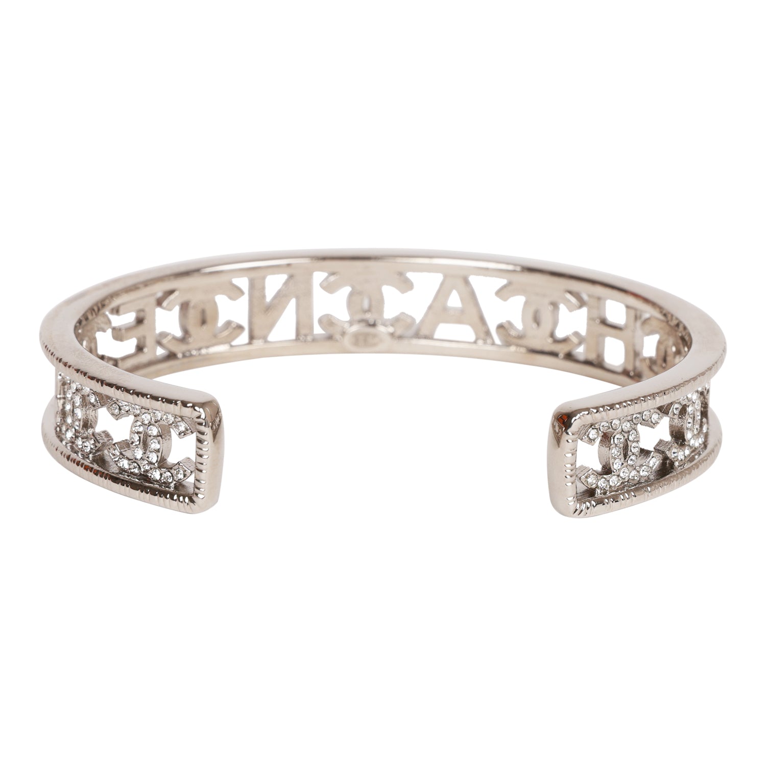 This cuff bracelet is in silver tone metal with clear crystal CC logos between the letters that spell out CHANEL.