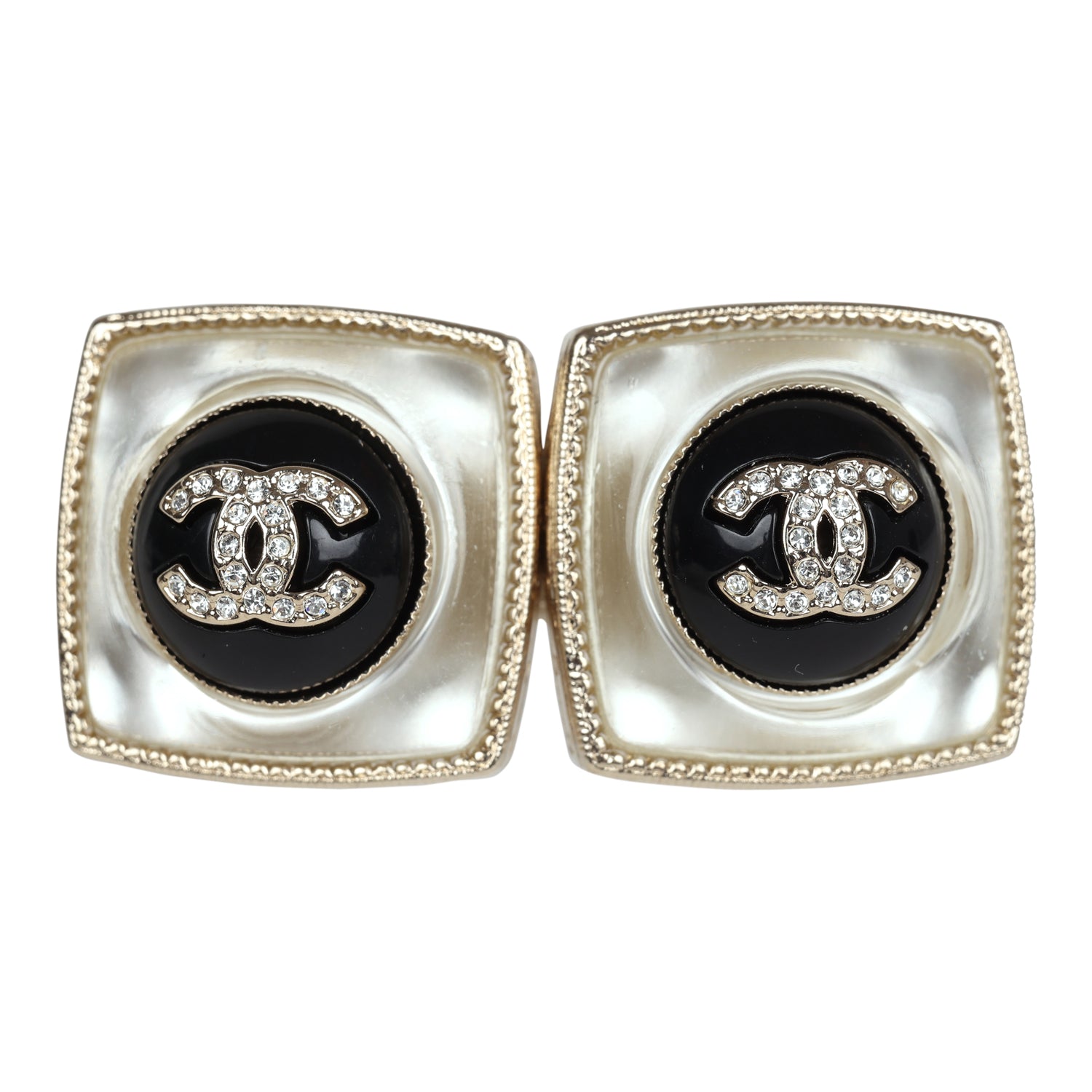 These Chanel Pearl stud earrings in light gold tone hardware, features a square shaped earring with a round black enamel button with the signature CC logo in faux crystals in the center. They also have post back closure.