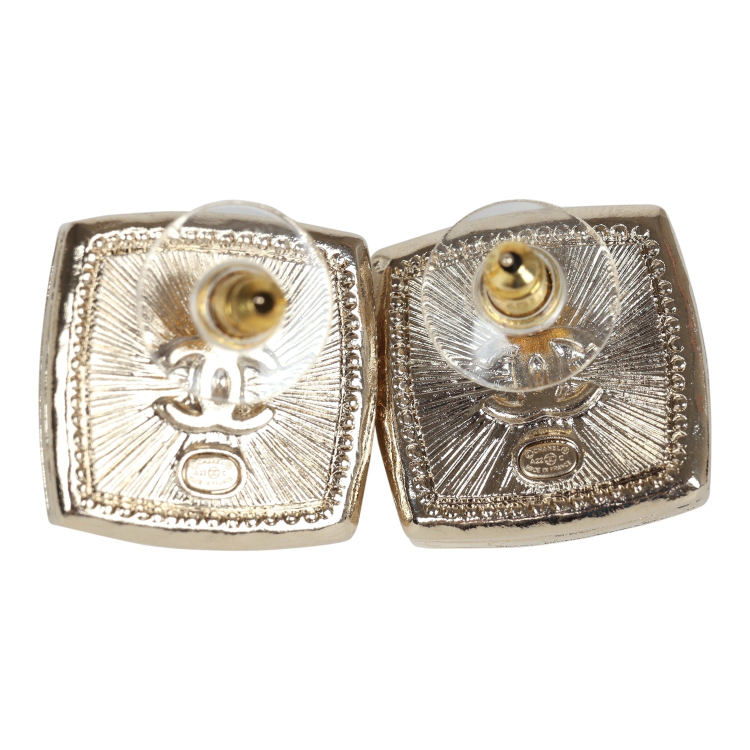 Chanel Crystal CC Square Pearl Stud Earrings Light Gold Hardware