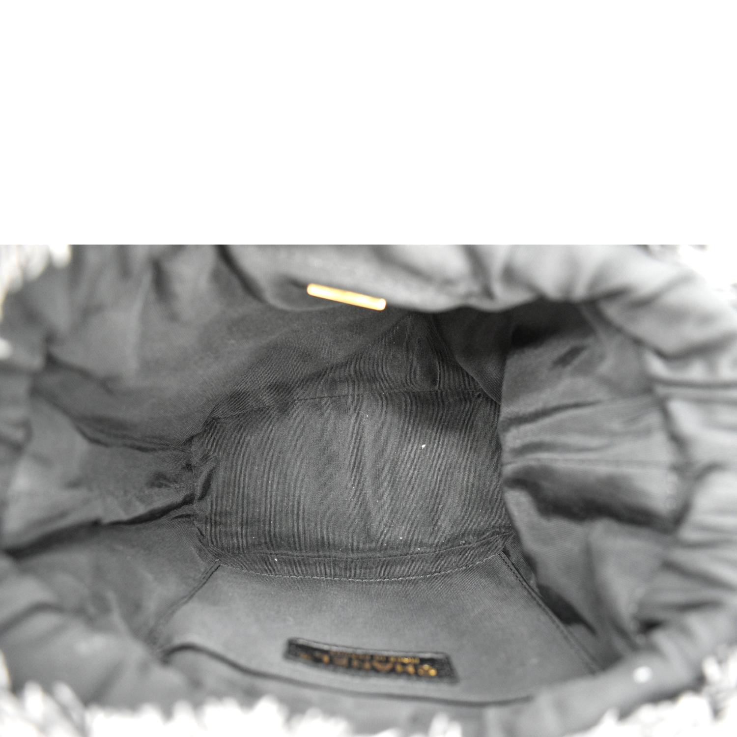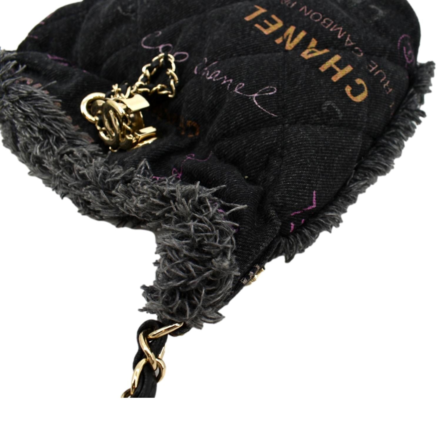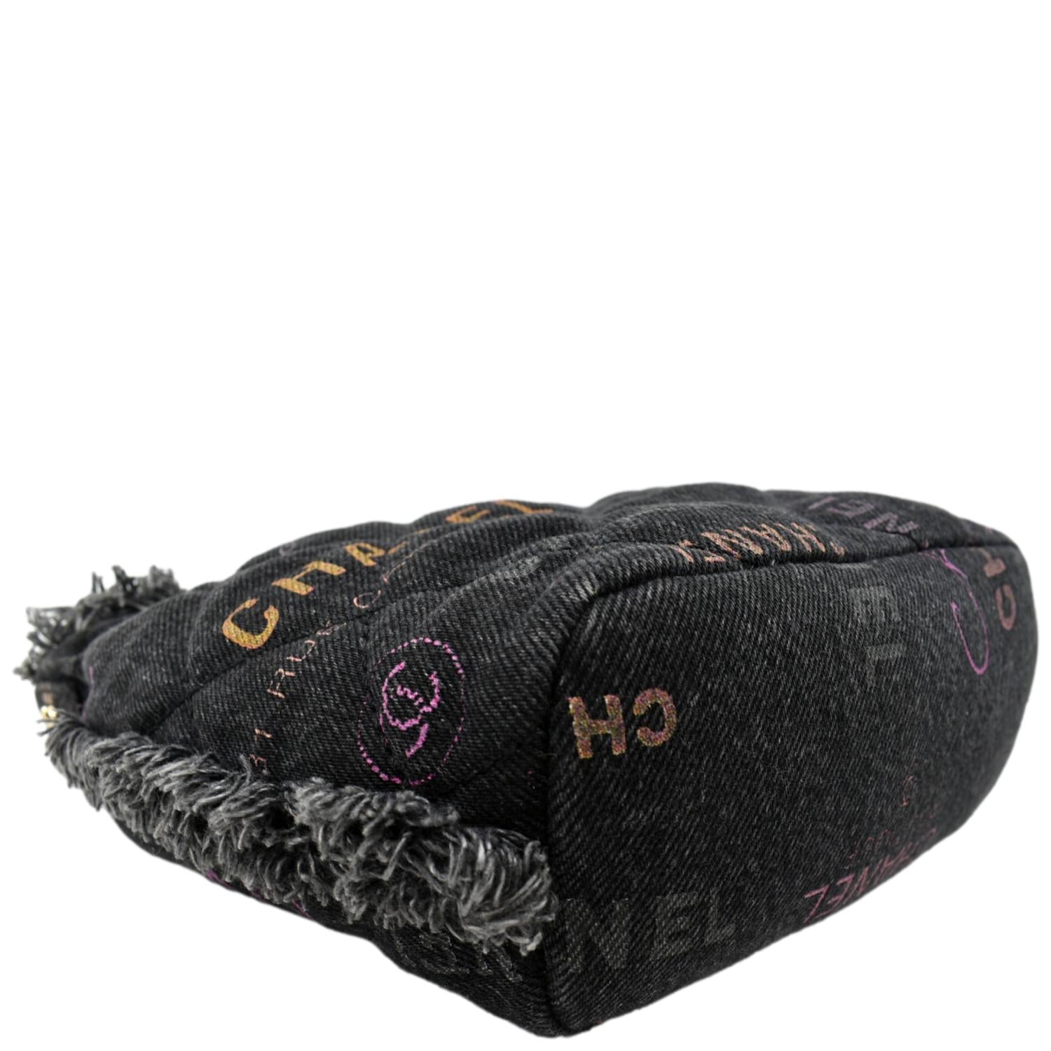 CHANEL Denim Mood Logo Printed Quilted Fringe Denim Chain Bucket Bag Black