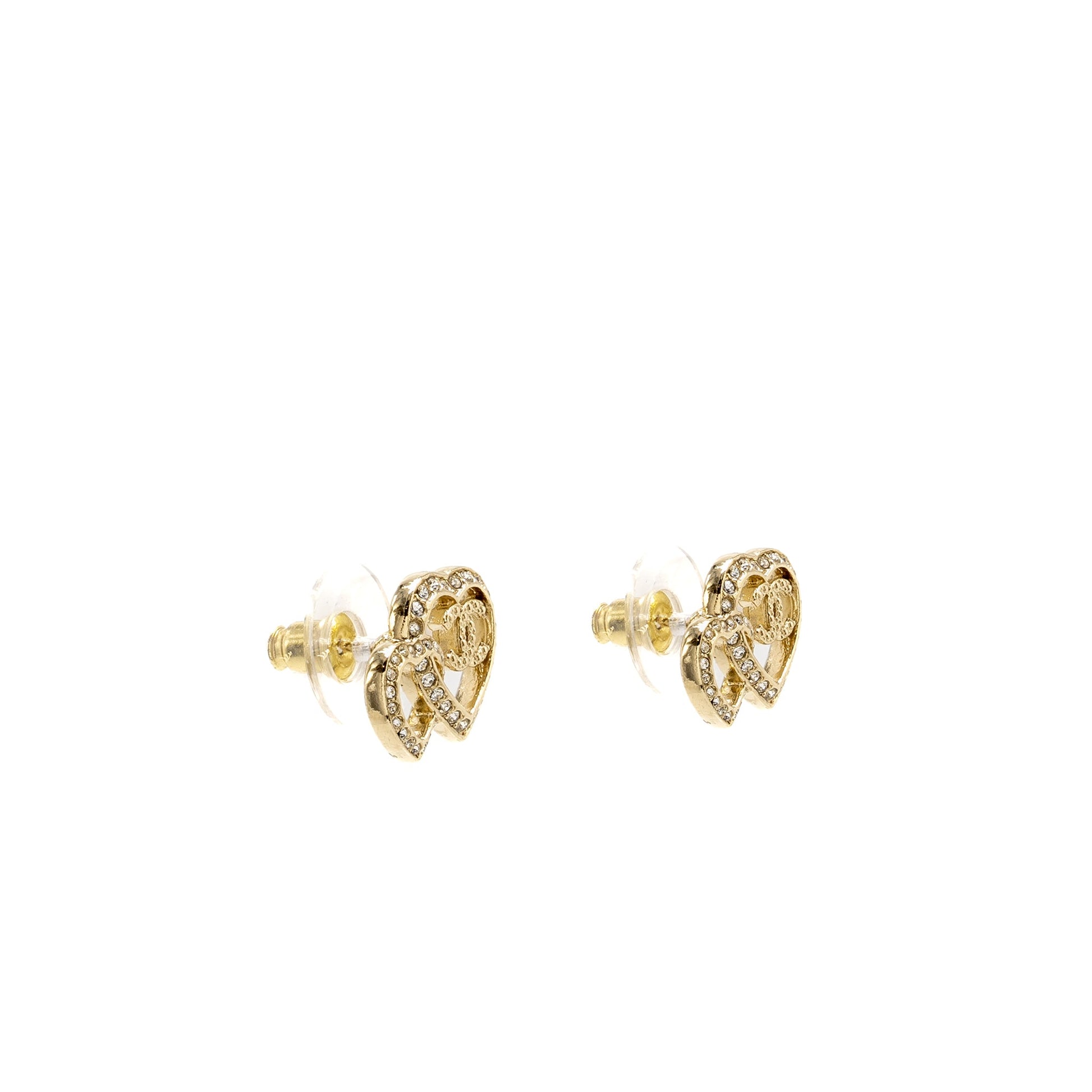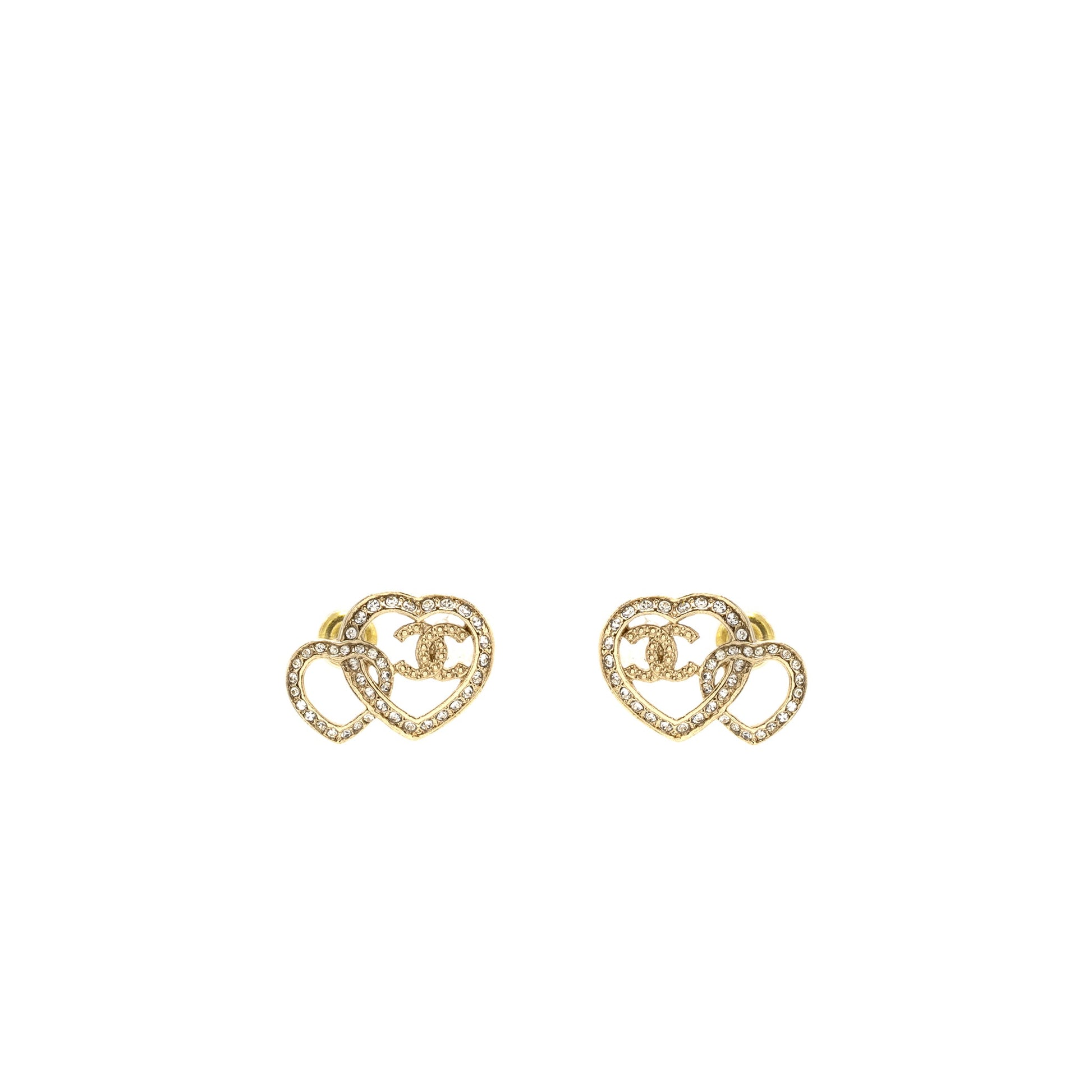 Chanel Double Heart CC Earrings Crystal Light Gold Tone