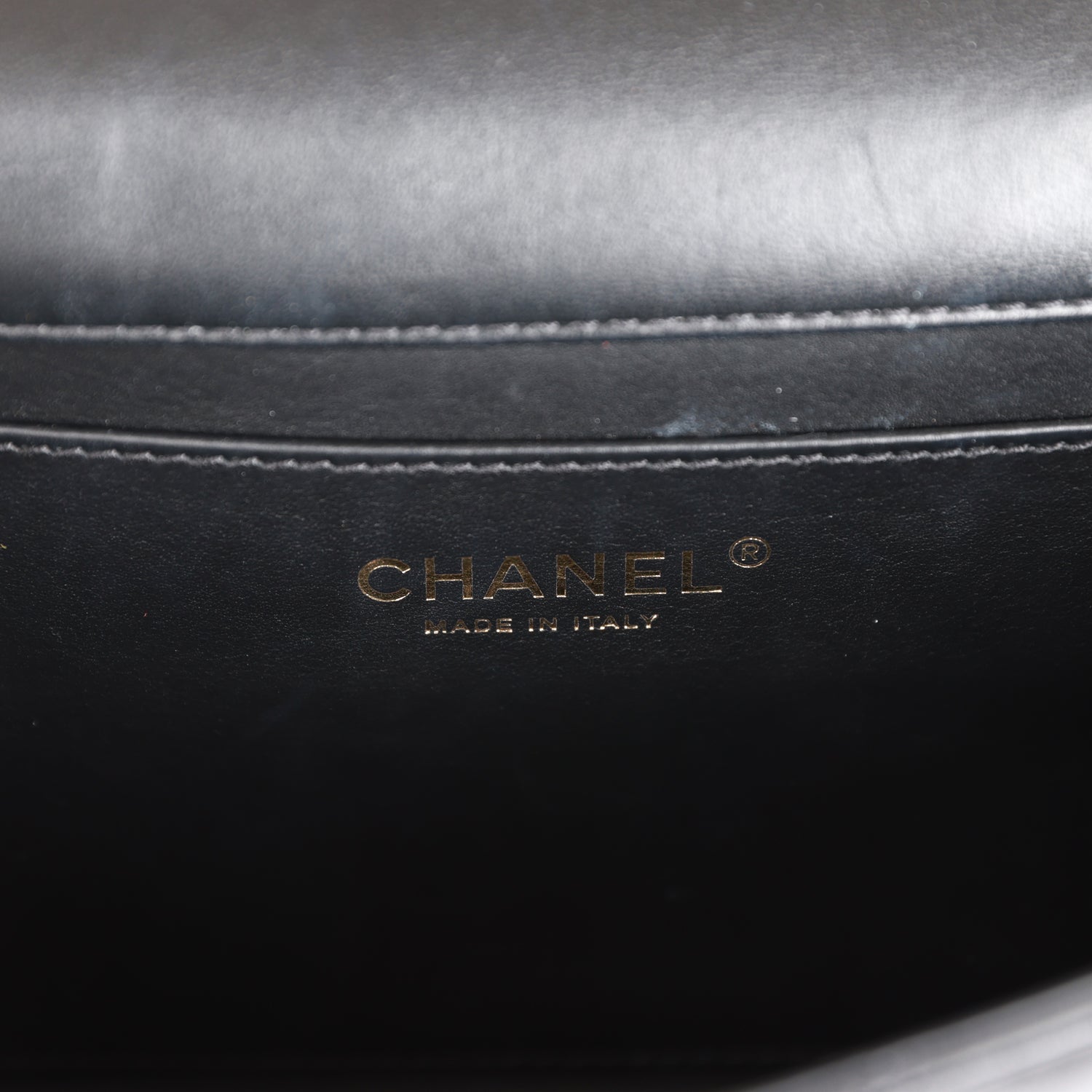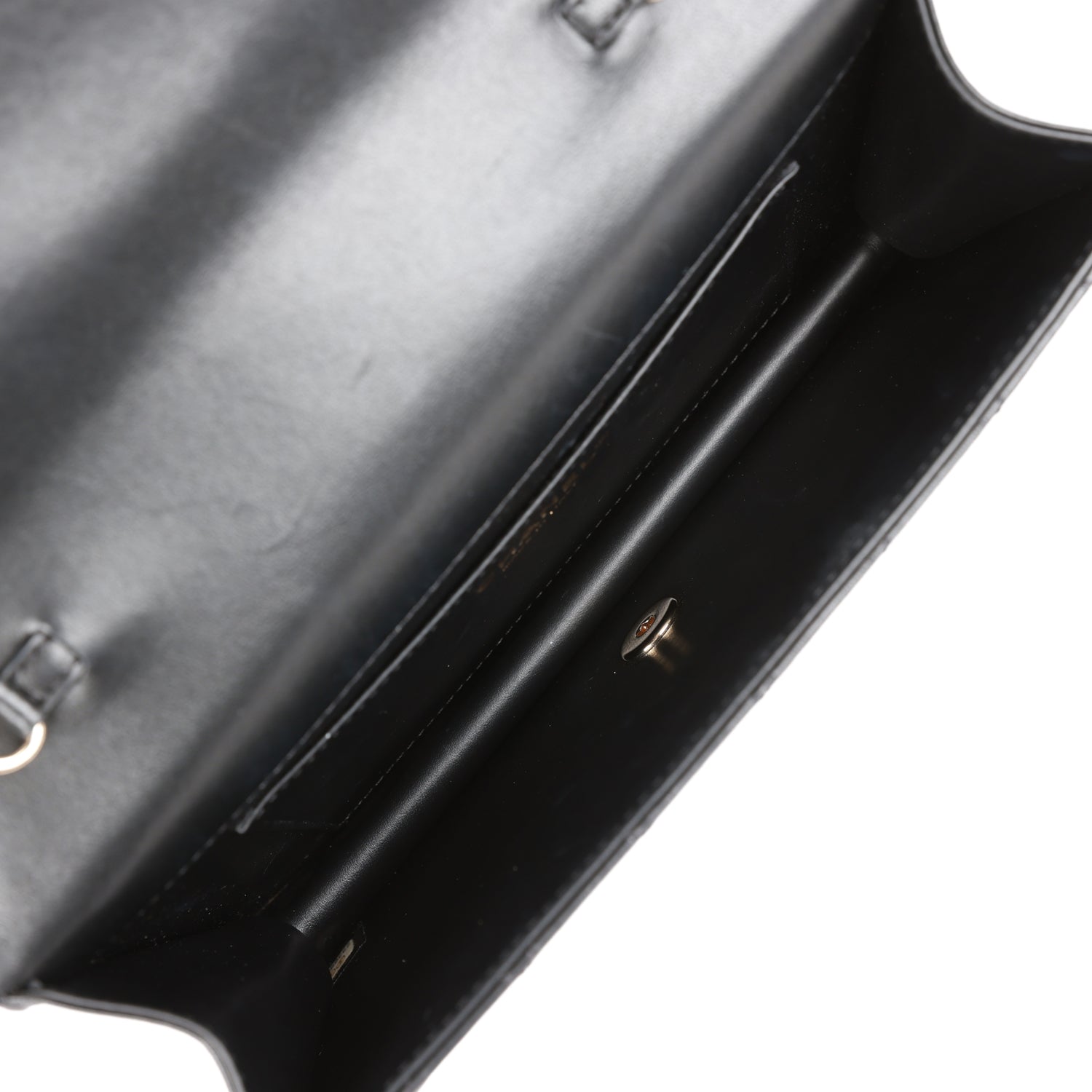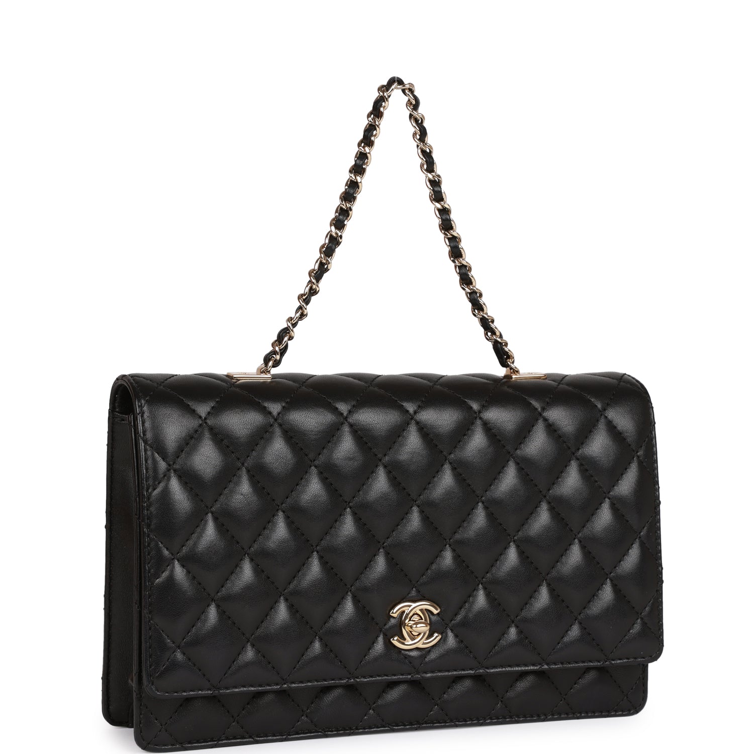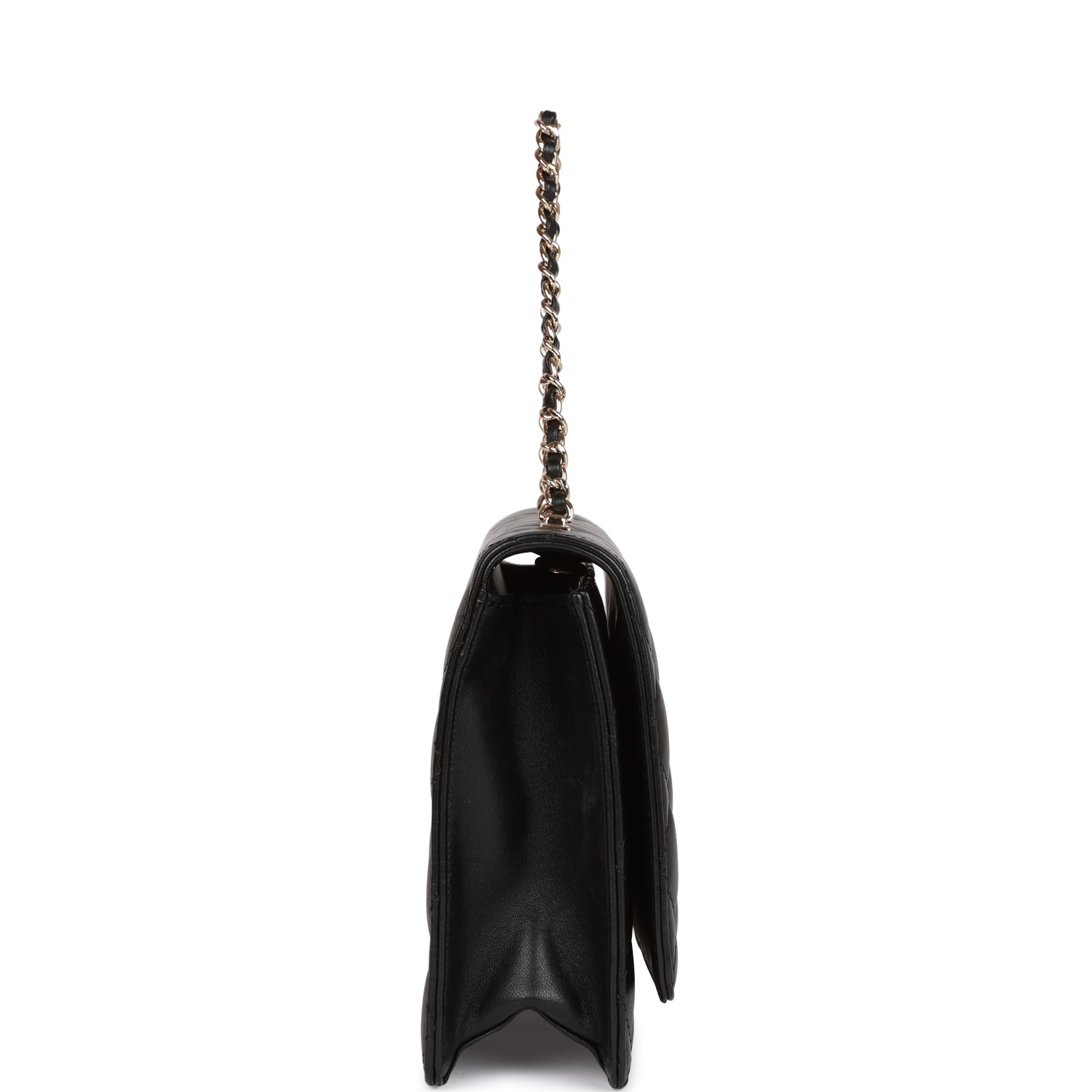 This limited edition bag is of black lambskin with light gold tone hardware and features a front flap with signature CC turnlock closure, black leather and light gold tone hardware interwoven chain link top handle and a fantasy pearl, black leather and gold tone chain link crossbody/shoulder strap.