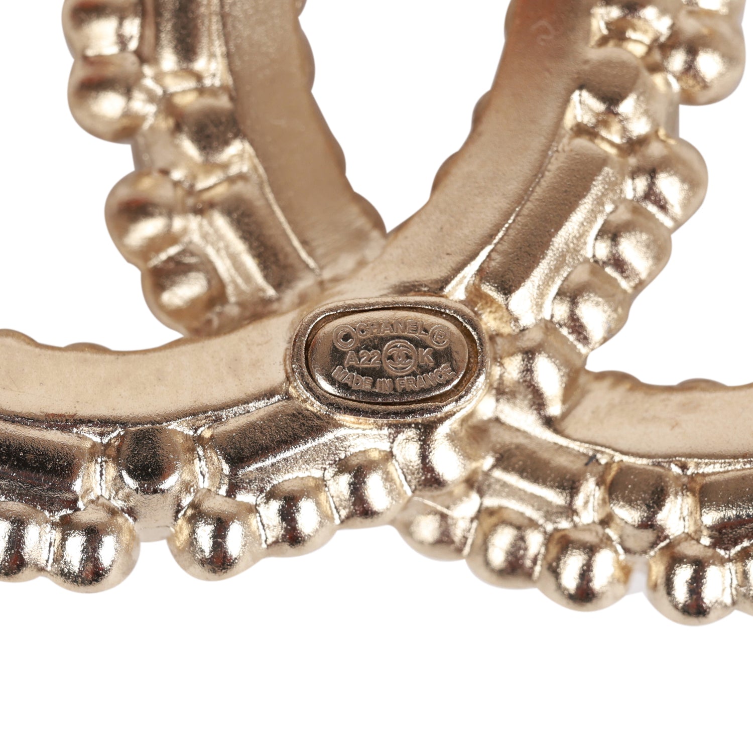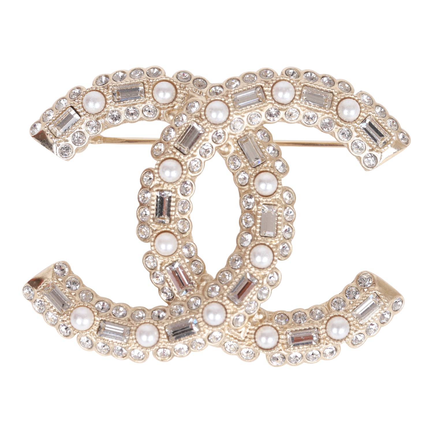 This brooch is in gold tone metal with faux pearls and clear crystals on the CC logo.